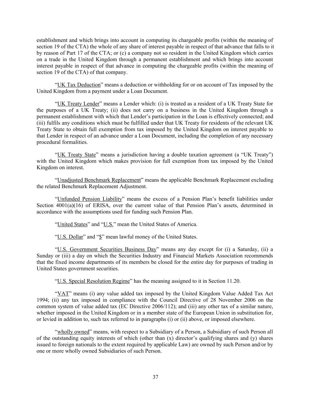 establishment and which brings into account in computing its chargeable profits (within the meaning of section 19 of the CTA) the whole of any share of interest payable in respect of that advance that falls to it by reason of Part 17 of the CTA; or (c) a company not so resident in the United Kingdom which carries on a trade in the United Kingdom through a permanent establishment and which brings into account interest payable in respect of that advance in computing the chargeable profits (within the meaning of section 19 of the CTA) of that company. “UK Tax Deduction” means a deduction or withholding for or on account of Tax imposed by the United Kingdom from a payment under a Loan Document. “UK Treaty Lender” means a Lender which: (i) is treated as a resident of a UK Treaty State for the purposes of a UK Treaty; (ii) does not carry on a business in the United Kingdom through a permanent establishment with which that Lender’s participation in the Loan is effectively connected; and (iii) fulfils any conditions which must be fulfilled under that UK Treaty for residents of the relevant UK Treaty State to obtain full exemption from tax imposed by the United Kingdom on interest payable to that Lender in respect of an advance under a Loan Document, including the completion of any necessary procedural formalities. “UK Treaty State” means a jurisdiction having a double taxation agreement (a “UK Treaty”) with the United Kingdom which makes provision for full exemption from tax imposed by the United Kingdom on interest. “Unadjusted Benchmark Replacement” means the applicable Benchmark Replacement excluding the related Benchmark Replacement Adjustment. “Unfunded Pension Liability” means the excess of a Pension Plan’s benefit liabilities under Section 4001(a)(16) of ERISA, over the current value of that Pension Plan’s assets, determined in accordance with the assumptions used for funding such Pension Plan. “United States” and “U.S.” mean the United States of America. “U.S. Dollar” and “$” mean lawful money of the United States. “U.S. Government Securities Business Day” means any day except for (i) a Saturday, (ii) a Sunday or (iii) a day on which the Securities Industry and Financial Markets Association recommends that the fixed income departments of its members be closed for the entire day for purposes of trading in United States government securities. “U.S. Special Resolution Regime” has the meaning assigned to it in Section 11.20. “VAT” means (i) any value added tax imposed by the United Kingdom Value Added Tax Act 1994; (ii) any tax imposed in compliance with the Council Directive of 28 November 2006 on the common system of value added tax (EC Directive 2006/112); and (iii) any other tax of a similar nature, whether imposed in the United Kingdom or in a member state of the European Union in substitution for, or levied in addition to, such tax referred to in paragraphs (i) or (ii) above, or imposed elsewhere. “wholly owned” means, with respect to a Subsidiary of a Person, a Subsidiary of such Person all of the outstanding equity interests of which (other than (x) director’s qualifying shares and (y) shares issued to foreign nationals to the extent required by applicable Law) are owned by such Person and/or by one or more wholly owned Subsidiaries of such Person. 37