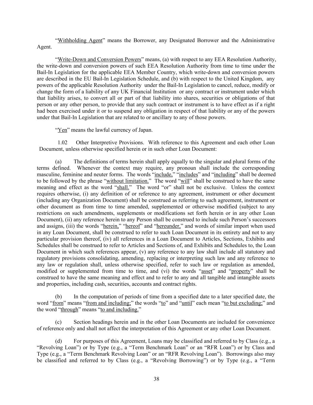 “Withholding Agent” means the Borrower, any Designated Borrower and the Administrative Agent. “Write-Down and Conversion Powers” means, (a) with respect to any EEA Resolution Authority, the write-down and conversion powers of such EEA Resolution Authority from time to time under the Bail-In Legislation for the applicable EEA Member Country, which write-down and conversion powers are described in the EU Bail-In Legislation Schedule, and (b) with respect to the United Kingdom, any powers of the applicable Resolution Authority under the Bail-In Legislation to cancel, reduce, modify or change the form of a liability of any UK Financial Institution or any contract or instrument under which that liability arises, to convert all or part of that liability into shares, securities or obligations of that person or any other person, to provide that any such contract or instrument is to have effect as if a right had been exercised under it or to suspend any obligation in respect of that liability or any of the powers under that Bail-In Legislation that are related to or ancillary to any of those powers. “Yen” means the lawful currency of Japan. 1.02 Other Interpretive Provisions. With reference to this Agreement and each other Loan Document, unless otherwise specified herein or in such other Loan Document: (a) The definitions of terms herein shall apply equally to the singular and plural forms of the terms defined. Whenever the context may require, any pronoun shall include the corresponding masculine, feminine and neuter forms. The words “include,” “includes” and “including” shall be deemed to be followed by the phrase “without limitation.” The word “will” shall be construed to have the same meaning and effect as the word “shall.” The word “or” shall not be exclusive. Unless the context requires otherwise, (i) any definition of or reference to any agreement, instrument or other document (including any Organization Document) shall be construed as referring to such agreement, instrument or other document as from time to time amended, supplemented or otherwise modified (subject to any restrictions on such amendments, supplements or modifications set forth herein or in any other Loan Document), (ii) any reference herein to any Person shall be construed to include such Person’s successors and assigns, (iii) the words “herein,” “hereof” and “hereunder,” and words of similar import when used in any Loan Document, shall be construed to refer to such Loan Document in its entirety and not to any particular provision thereof, (iv) all references in a Loan Document to Articles, Sections, Exhibits and Schedules shall be construed to refer to Articles and Sections of, and Exhibits and Schedules to, the Loan Document in which such references appear, (v) any reference to any law shall include all statutory and regulatory provisions consolidating, amending, replacing or interpreting such law and any reference to any law or regulation shall, unless otherwise specified, refer to such law or regulation as amended, modified or supplemented from time to time, and (vi) the words “asset” and “property” shall be construed to have the same meaning and effect and to refer to any and all tangible and intangible assets and properties, including cash, securities, accounts and contract rights. (b) In the computation of periods of time from a specified date to a later specified date, the word “from” means “from and including;” the words “to” and “until” each mean “to but excluding;” and the word “through” means “to and including.” (c) Section headings herein and in the other Loan Documents are included for convenience of reference only and shall not affect the interpretation of this Agreement or any other Loan Document. (d) For purposes of this Agreement, Loans may be classified and referred to by Class (e.g., a “Revolving Loan”) or by Type (e.g., a “Term Benchmark Loan” or an “RFR Loan”) or by Class and Type (e.g., a “Term Benchmark Revolving Loan” or an “RFR Revolving Loan”). Borrowings also may be classified and referred to by Class (e.g., a “Revolving Borrowing”) or by Type (e.g., a “Term 38