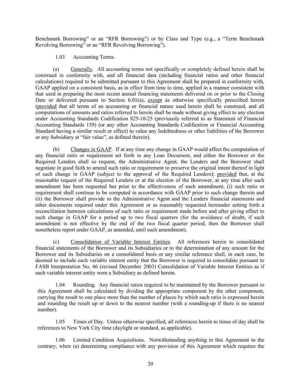 Benchmark Borrowing” or an “RFR Borrowing”) or by Class and Type (e.g., a “Term Benchmark Revolving Borrowing” or an “RFR Revolving Borrowing”). 1.03 Accounting Terms. (a) Generally. All accounting terms not specifically or completely defined herein shall be construed in conformity with, and all financial data (including financial ratios and other financial calculations) required to be submitted pursuant to this Agreement shall be prepared in conformity with, GAAP applied on a consistent basis, as in effect from time to time, applied in a manner consistent with that used in preparing the most recent annual financing statements delivered on or prior to the Closing Date or delivered pursuant to Section 6.01(a), except as otherwise specifically prescribed herein (provided that all terms of an accounting or financial nature used herein shall be construed, and all computations of amounts and ratios referred to herein shall be made without giving effect to any election under Accounting Standards Codification 825-10-25 (previously referred to as Statement of Financial Accounting Standards 159) (or any other Accounting Standards Codification or Financial Accounting Standard having a similar result or effect) to value any Indebtedness or other liabilities of the Borrower or any Subsidiary at “fair value”, as defined therein). (b) Changes in GAAP. If at any time any change in GAAP would affect the computation of any financial ratio or requirement set forth in any Loan Document, and either the Borrower or the Required Lenders shall so request, the Administrative Agent, the Lenders and the Borrower shall negotiate in good faith to amend such ratio or requirement to preserve the original intent thereof in light of such change in GAAP (subject to the approval of the Required Lenders); provided that, at the reasonable request of the Required Lenders or at the election of the Borrower, at any time after such amendment has been requested but prior to the effectiveness of such amendment, (i) such ratio or requirement shall continue to be computed in accordance with GAAP prior to such change therein and (ii) the Borrower shall provide to the Administrative Agent and the Lenders financial statements and other documents required under this Agreement or as reasonably requested hereunder setting forth a reconciliation between calculations of such ratio or requirement made before and after giving effect to such change in GAAP for a period up to two fiscal quarters (for the avoidance of doubt, if such amendment is not effective by the end of the two fiscal quarter period, then the Borrower shall nonetheless report under GAAP, as amended, until such amendment). (c) Consolidation of Variable Interest Entities. All references herein to consolidated financial statements of the Borrower and its Subsidiaries or to the determination of any amount for the Borrower and its Subsidiaries on a consolidated basis or any similar reference shall, in each case, be deemed to include each variable interest entity that the Borrower is required to consolidate pursuant to FASB Interpretation No. 46 (revised December 2003) Consolidation of Variable Interest Entities as if such variable interest entity were a Subsidiary as defined herein. 1.04 Rounding. Any financial ratios required to be maintained by the Borrower pursuant to this Agreement shall be calculated by dividing the appropriate component by the other component, carrying the result to one place more than the number of places by which such ratio is expressed herein and rounding the result up or down to the nearest number (with a rounding-up if there is no nearest number). 1.05 Times of Day. Unless otherwise specified, all references herein to times of day shall be references to New York City time (daylight or standard, as applicable). 1.06 Limited Condition Acquisitions. Notwithstanding anything in this Agreement to the contrary, when (a) determining compliance with any provision of this Agreement which requires the 39
