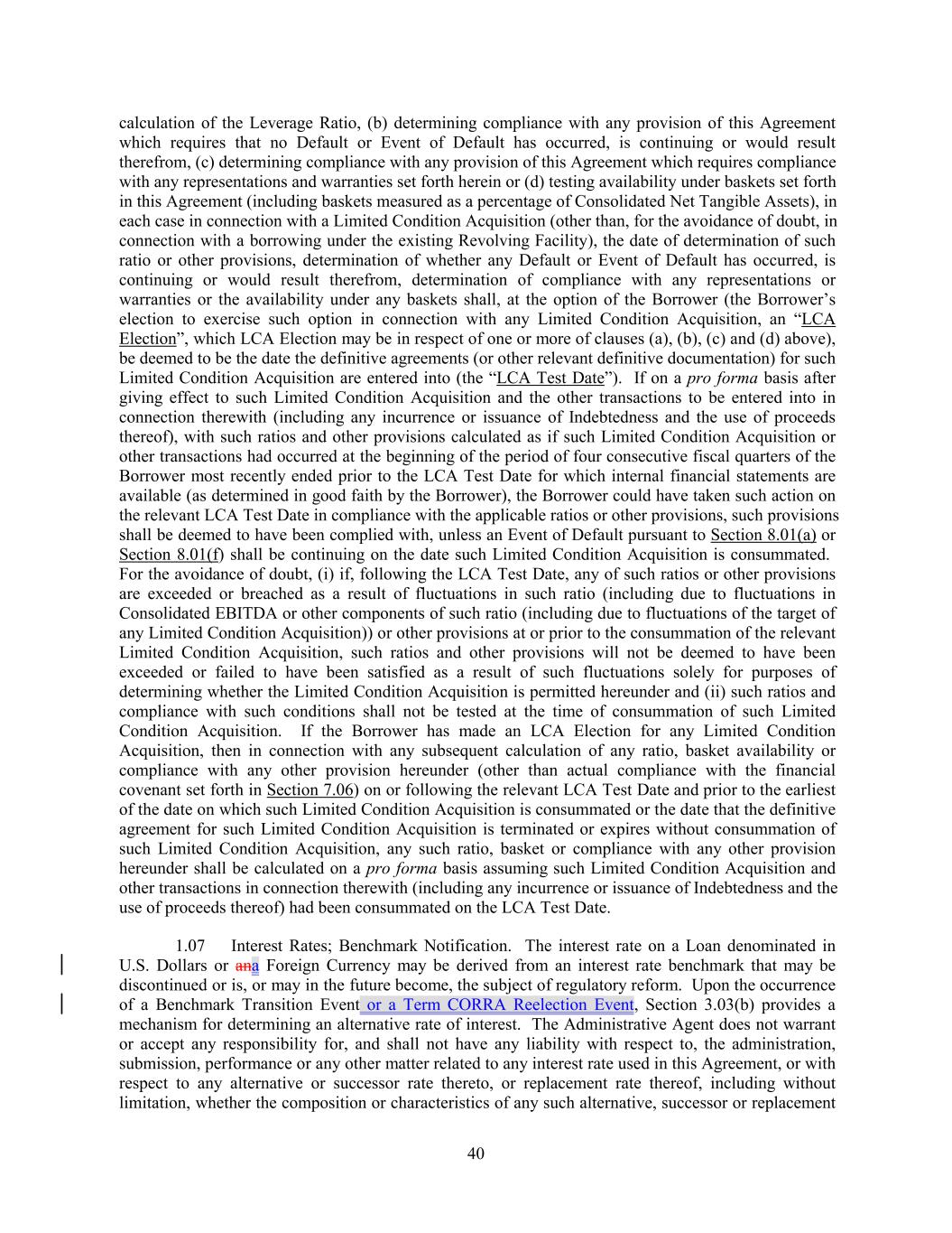 calculation of the Leverage Ratio, (b) determining compliance with any provision of this Agreement which requires that no Default or Event of Default has occurred, is continuing or would result therefrom, (c) determining compliance with any provision of this Agreement which requires compliance with any representations and warranties set forth herein or (d) testing availability under baskets set forth in this Agreement (including baskets measured as a percentage of Consolidated Net Tangible Assets), in each case in connection with a Limited Condition Acquisition (other than, for the avoidance of doubt, in connection with a borrowing under the existing Revolving Facility), the date of determination of such ratio or other provisions, determination of whether any Default or Event of Default has occurred, is continuing or would result therefrom, determination of compliance with any representations or warranties or the availability under any baskets shall, at the option of the Borrower (the Borrower’s election to exercise such option in connection with any Limited Condition Acquisition, an “LCA Election”, which LCA Election may be in respect of one or more of clauses (a), (b), (c) and (d) above), be deemed to be the date the definitive agreements (or other relevant definitive documentation) for such Limited Condition Acquisition are entered into (the “LCA Test Date”). If on a pro forma basis after giving effect to such Limited Condition Acquisition and the other transactions to be entered into in connection therewith (including any incurrence or issuance of Indebtedness and the use of proceeds thereof), with such ratios and other provisions calculated as if such Limited Condition Acquisition or other transactions had occurred at the beginning of the period of four consecutive fiscal quarters of the Borrower most recently ended prior to the LCA Test Date for which internal financial statements are available (as determined in good faith by the Borrower), the Borrower could have taken such action on the relevant LCA Test Date in compliance with the applicable ratios or other provisions, such provisions shall be deemed to have been complied with, unless an Event of Default pursuant to Section 8.01(a) or Section 8.01(f) shall be continuing on the date such Limited Condition Acquisition is consummated. For the avoidance of doubt, (i) if, following the LCA Test Date, any of such ratios or other provisions are exceeded or breached as a result of fluctuations in such ratio (including due to fluctuations in Consolidated EBITDA or other components of such ratio (including due to fluctuations of the target of any Limited Condition Acquisition)) or other provisions at or prior to the consummation of the relevant Limited Condition Acquisition, such ratios and other provisions will not be deemed to have been exceeded or failed to have been satisfied as a result of such fluctuations solely for purposes of determining whether the Limited Condition Acquisition is permitted hereunder and (ii) such ratios and compliance with such conditions shall not be tested at the time of consummation of such Limited Condition Acquisition. If the Borrower has made an LCA Election for any Limited Condition Acquisition, then in connection with any subsequent calculation of any ratio, basket availability or compliance with any other provision hereunder (other than actual compliance with the financial covenant set forth in Section 7.06) on or following the relevant LCA Test Date and prior to the earliest of the date on which such Limited Condition Acquisition is consummated or the date that the definitive agreement for such Limited Condition Acquisition is terminated or expires without consummation of such Limited Condition Acquisition, any such ratio, basket or compliance with any other provision hereunder shall be calculated on a pro forma basis assuming such Limited Condition Acquisition and other transactions in connection therewith (including any incurrence or issuance of Indebtedness and the use of proceeds thereof) had been consummated on the LCA Test Date. 1.07 Interest Rates; Benchmark Notification. The interest rate on a Loan denominated in U.S. Dollars or ana Foreign Currency may be derived from an interest rate benchmark that may be discontinued or is, or may in the future become, the subject of regulatory reform. Upon the occurrence of a Benchmark Transition Event or a Term CORRA Reelection Event, Section 3.03(b) provides a mechanism for determining an alternative rate of interest. The Administrative Agent does not warrant or accept any responsibility for, and shall not have any liability with respect to, the administration, submission, performance or any other matter related to any interest rate used in this Agreement, or with respect to any alternative or successor rate thereto, or replacement rate thereof, including without limitation, whether the composition or characteristics of any such alternative, successor or replacement 40