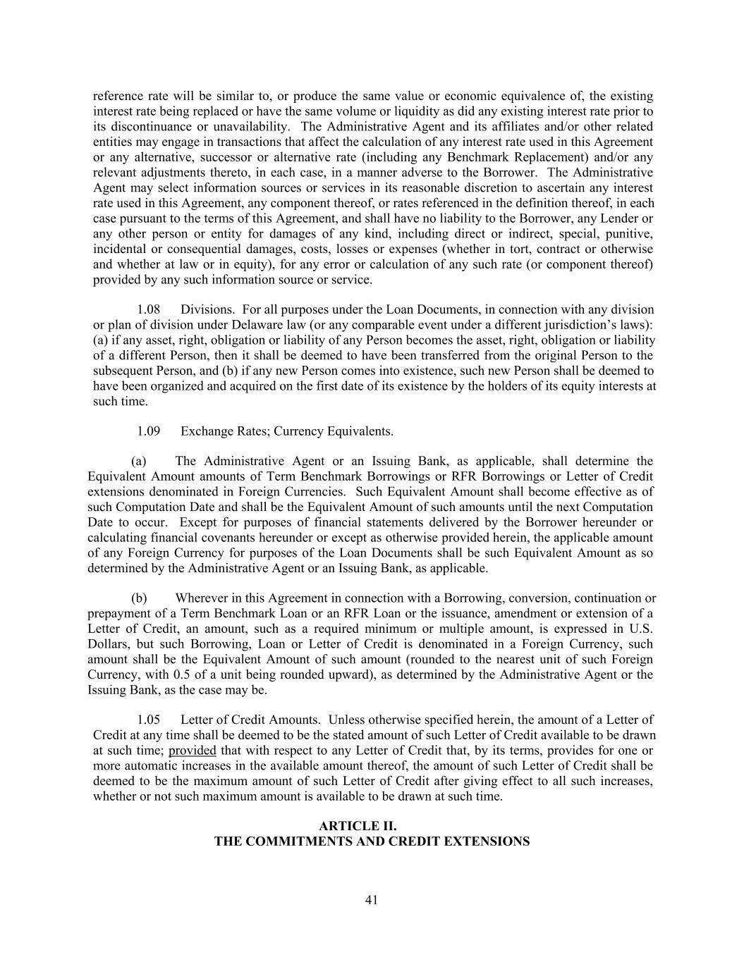 reference rate will be similar to, or produce the same value or economic equivalence of, the existing interest rate being replaced or have the same volume or liquidity as did any existing interest rate prior to its discontinuance or unavailability. The Administrative Agent and its affiliates and/or other related entities may engage in transactions that affect the calculation of any interest rate used in this Agreement or any alternative, successor or alternative rate (including any Benchmark Replacement) and/or any relevant adjustments thereto, in each case, in a manner adverse to the Borrower. The Administrative Agent may select information sources or services in its reasonable discretion to ascertain any interest rate used in this Agreement, any component thereof, or rates referenced in the definition thereof, in each case pursuant to the terms of this Agreement, and shall have no liability to the Borrower, any Lender or any other person or entity for damages of any kind, including direct or indirect, special, punitive, incidental or consequential damages, costs, losses or expenses (whether in tort, contract or otherwise and whether at law or in equity), for any error or calculation of any such rate (or component thereof) provided by any such information source or service. 1.08 Divisions. For all purposes under the Loan Documents, in connection with any division or plan of division under Delaware law (or any comparable event under a different jurisdiction’s laws): (a) if any asset, right, obligation or liability of any Person becomes the asset, right, obligation or liability of a different Person, then it shall be deemed to have been transferred from the original Person to the subsequent Person, and (b) if any new Person comes into existence, such new Person shall be deemed to have been organized and acquired on the first date of its existence by the holders of its equity interests at such time. 1.09 Exchange Rates; Currency Equivalents. (a) The Administrative Agent or an Issuing Bank, as applicable, shall determine the Equivalent Amount amounts of Term Benchmark Borrowings or RFR Borrowings or Letter of Credit extensions denominated in Foreign Currencies. Such Equivalent Amount shall become effective as of such Computation Date and shall be the Equivalent Amount of such amounts until the next Computation Date to occur. Except for purposes of financial statements delivered by the Borrower hereunder or calculating financial covenants hereunder or except as otherwise provided herein, the applicable amount of any Foreign Currency for purposes of the Loan Documents shall be such Equivalent Amount as so determined by the Administrative Agent or an Issuing Bank, as applicable. (b) Wherever in this Agreement in connection with a Borrowing, conversion, continuation or prepayment of a Term Benchmark Loan or an RFR Loan or the issuance, amendment or extension of a Letter of Credit, an amount, such as a required minimum or multiple amount, is expressed in U.S. Dollars, but such Borrowing, Loan or Letter of Credit is denominated in a Foreign Currency, such amount shall be the Equivalent Amount of such amount (rounded to the nearest unit of such Foreign Currency, with 0.5 of a unit being rounded upward), as determined by the Administrative Agent or the Issuing Bank, as the case may be. 1.05 Letter of Credit Amounts. Unless otherwise specified herein, the amount of a Letter of Credit at any time shall be deemed to be the stated amount of such Letter of Credit available to be drawn at such time; provided that with respect to any Letter of Credit that, by its terms, provides for one or more automatic increases in the available amount thereof, the amount of such Letter of Credit shall be deemed to be the maximum amount of such Letter of Credit after giving effect to all such increases, whether or not such maximum amount is available to be drawn at such time. ARTICLE II. THE COMMITMENTS AND CREDIT EXTENSIONS 41