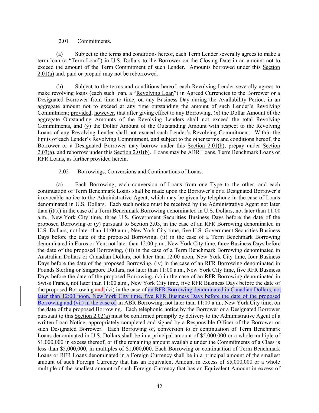 2.01 Commitments. (a) Subject to the terms and conditions hereof, each Term Lender severally agrees to make a term loan (a “Term Loan”) in U.S. Dollars to the Borrower on the Closing Date in an amount not to exceed the amount of the Term Commitment of such Lender. Amounts borrowed under this Section 2.01(a) and, paid or prepaid may not be reborrowed. (b) Subject to the terms and conditions hereof, each Revolving Lender severally agrees to make revolving loans (each such loan, a “Revolving Loan”) in Agreed Currencies to the Borrower or a Designated Borrower from time to time, on any Business Day during the Availability Period, in an aggregate amount not to exceed at any time outstanding the amount of such Lender’s Revolving Commitment; provided, however, that after giving effect to any Borrowing, (x) the Dollar Amount of the aggregate Outstanding Amounts of the Revolving Lenders shall not exceed the total Revolving Commitments, and (y) the Dollar Amount of the Outstanding Amount with respect to the Revolving Loans of any Revolving Lender shall not exceed such Lender’s Revolving Commitment. Within the limits of each Lender’s Revolving Commitment, and subject to the other terms and conditions hereof, the Borrower or a Designated Borrower may borrow under this Section 2.01(b), prepay under Section 2.03(a), and reborrow under this Section 2.01(b). Loans may be ABR Loans, Term Benchmark Loans or RFR Loans, as further provided herein. 2.02 Borrowings, Conversions and Continuations of Loans. (a) Each Borrowing, each conversion of Loans from one Type to the other, and each continuation of Term Benchmark Loans shall be made upon the Borrower’s or a Designated Borrower’s irrevocable notice to the Administrative Agent, which may be given by telephone in the case of Loans denominated in U.S. Dollars. Each such notice must be received by the Administrative Agent not later than (i)(x) in the case of a Term Benchmark Borrowing denominated in U.S. Dollars, not later than 11:00 a.m., New York City time, three U.S. Government Securities Business Days before the date of the proposed Borrowing or (y) pursuant to Section 3.03, in the case of an RFR Borrowing denominated in U.S. Dollars, not later than 11:00 a.m., New York City time, five U.S. Government Securities Business Days before the date of the proposed Borrowing, (ii) in the case of a Term Benchmark Borrowing denominated in Euros or Yen, not later than 12:00 p.m., New York City time, three Business Days before the date of the proposed Borrowing, (iii) in the case of a Term Benchmark Borrowing denominated in Australian Dollars or Canadian Dollars, not later than 12:00 noon, New York City time, four Business Days before the date of the proposed Borrowing, (iv) in the case of an RFR Borrowing denominated in Pounds Sterling or Singapore Dollars, not later than 11:00 a.m., New York City time, five RFR Business Days before the date of the proposed Borrowing, (v) in the case of an RFR Borrowing denominated in Swiss Francs, not later than 11:00 a.m., New York City time, five RFR Business Days before the date of the proposed Borrowing and, (vi) in the case of an RFR Borrowing denominated in Canadian Dollars, not later than 12:00 noon, New York City time, five RFR Business Days before the date of the proposed Borrowing and (vii) in the case of an ABR Borrowing, not later than 11:00 a.m., New York City time, on the date of the proposed Borrowing. Each telephonic notice by the Borrower or a Designated Borrower pursuant to this Section 2.02(a) must be confirmed promptly by delivery to the Administrative Agent of a written Loan Notice, appropriately completed and signed by a Responsible Officer of the Borrower or such Designated Borrower. Each Borrowing of, conversion to or continuation of Term Benchmark Loans denominated in U.S. Dollars shall be in a principal amount of $5,000,000 or a whole multiple of $1,000,000 in excess thereof, or if the remaining amount available under the Commitments of a Class is less than $5,000,000, in multiples of $1,000,000. Each Borrowing or continuation of Term Benchmark Loans or RFR Loans denominated in a Foreign Currency shall be in a principal amount of the smallest amount of such Foreign Currency that has an Equivalent Amount in excess of $5,000,000 or a whole multiple of the smallest amount of such Foreign Currency that has an Equivalent Amount in excess of 42