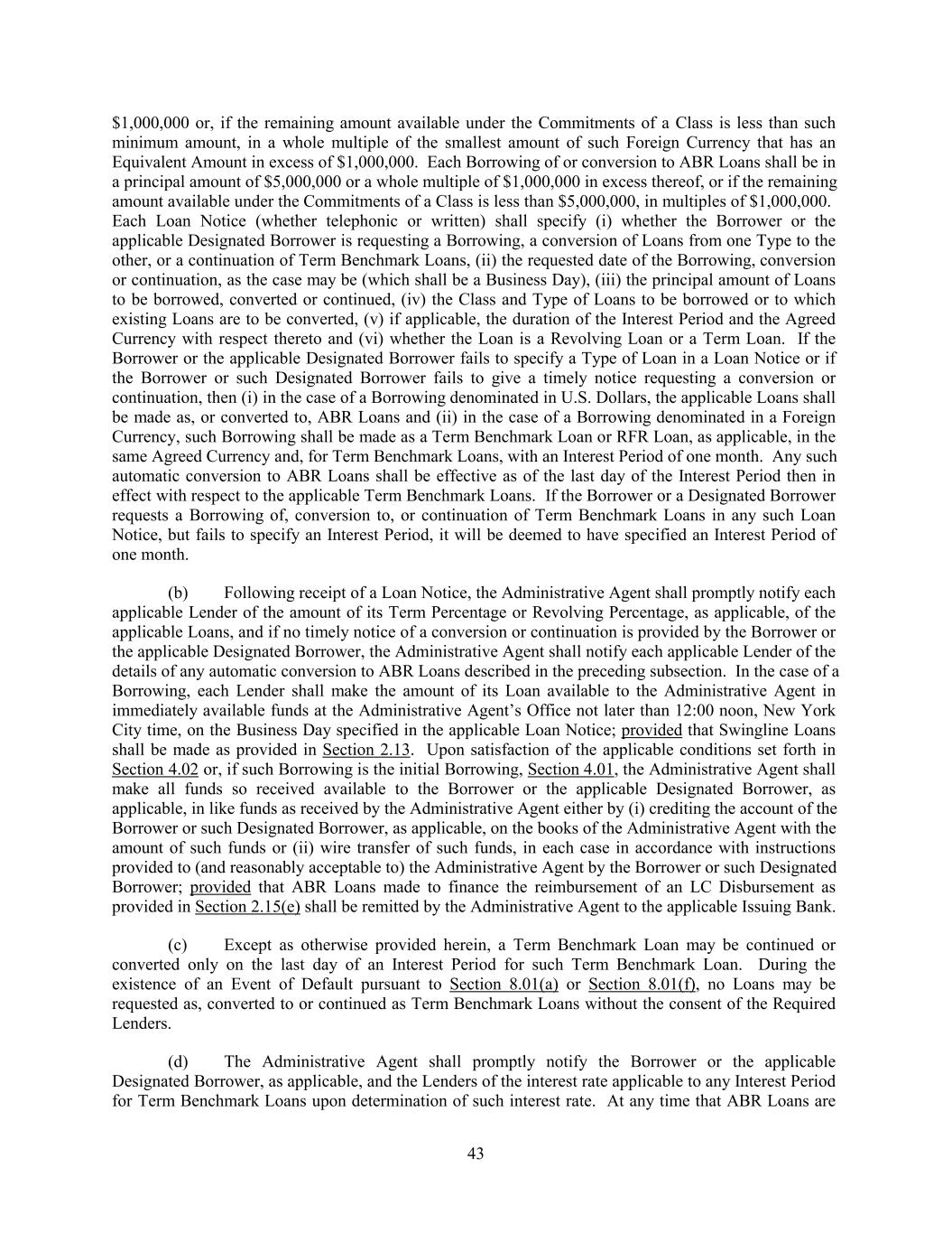 $1,000,000 or, if the remaining amount available under the Commitments of a Class is less than such minimum amount, in a whole multiple of the smallest amount of such Foreign Currency that has an Equivalent Amount in excess of $1,000,000. Each Borrowing of or conversion to ABR Loans shall be in a principal amount of $5,000,000 or a whole multiple of $1,000,000 in excess thereof, or if the remaining amount available under the Commitments of a Class is less than $5,000,000, in multiples of $1,000,000. Each Loan Notice (whether telephonic or written) shall specify (i) whether the Borrower or the applicable Designated Borrower is requesting a Borrowing, a conversion of Loans from one Type to the other, or a continuation of Term Benchmark Loans, (ii) the requested date of the Borrowing, conversion or continuation, as the case may be (which shall be a Business Day), (iii) the principal amount of Loans to be borrowed, converted or continued, (iv) the Class and Type of Loans to be borrowed or to which existing Loans are to be converted, (v) if applicable, the duration of the Interest Period and the Agreed Currency with respect thereto and (vi) whether the Loan is a Revolving Loan or a Term Loan. If the Borrower or the applicable Designated Borrower fails to specify a Type of Loan in a Loan Notice or if the Borrower or such Designated Borrower fails to give a timely notice requesting a conversion or continuation, then (i) in the case of a Borrowing denominated in U.S. Dollars, the applicable Loans shall be made as, or converted to, ABR Loans and (ii) in the case of a Borrowing denominated in a Foreign Currency, such Borrowing shall be made as a Term Benchmark Loan or RFR Loan, as applicable, in the same Agreed Currency and, for Term Benchmark Loans, with an Interest Period of one month. Any such automatic conversion to ABR Loans shall be effective as of the last day of the Interest Period then in effect with respect to the applicable Term Benchmark Loans. If the Borrower or a Designated Borrower requests a Borrowing of, conversion to, or continuation of Term Benchmark Loans in any such Loan Notice, but fails to specify an Interest Period, it will be deemed to have specified an Interest Period of one month. (b) Following receipt of a Loan Notice, the Administrative Agent shall promptly notify each applicable Lender of the amount of its Term Percentage or Revolving Percentage, as applicable, of the applicable Loans, and if no timely notice of a conversion or continuation is provided by the Borrower or the applicable Designated Borrower, the Administrative Agent shall notify each applicable Lender of the details of any automatic conversion to ABR Loans described in the preceding subsection. In the case of a Borrowing, each Lender shall make the amount of its Loan available to the Administrative Agent in immediately available funds at the Administrative Agent’s Office not later than 12:00 noon, New York City time, on the Business Day specified in the applicable Loan Notice; provided that Swingline Loans shall be made as provided in Section 2.13. Upon satisfaction of the applicable conditions set forth in Section 4.02 or, if such Borrowing is the initial Borrowing, Section 4.01, the Administrative Agent shall make all funds so received available to the Borrower or the applicable Designated Borrower, as applicable, in like funds as received by the Administrative Agent either by (i) crediting the account of the Borrower or such Designated Borrower, as applicable, on the books of the Administrative Agent with the amount of such funds or (ii) wire transfer of such funds, in each case in accordance with instructions provided to (and reasonably acceptable to) the Administrative Agent by the Borrower or such Designated Borrower; provided that ABR Loans made to finance the reimbursement of an LC Disbursement as provided in Section 2.15(e) shall be remitted by the Administrative Agent to the applicable Issuing Bank. (c) Except as otherwise provided herein, a Term Benchmark Loan may be continued or converted only on the last day of an Interest Period for such Term Benchmark Loan. During the existence of an Event of Default pursuant to Section 8.01(a) or Section 8.01(f), no Loans may be requested as, converted to or continued as Term Benchmark Loans without the consent of the Required Lenders. (d) The Administrative Agent shall promptly notify the Borrower or the applicable Designated Borrower, as applicable, and the Lenders of the interest rate applicable to any Interest Period for Term Benchmark Loans upon determination of such interest rate. At any time that ABR Loans are 43