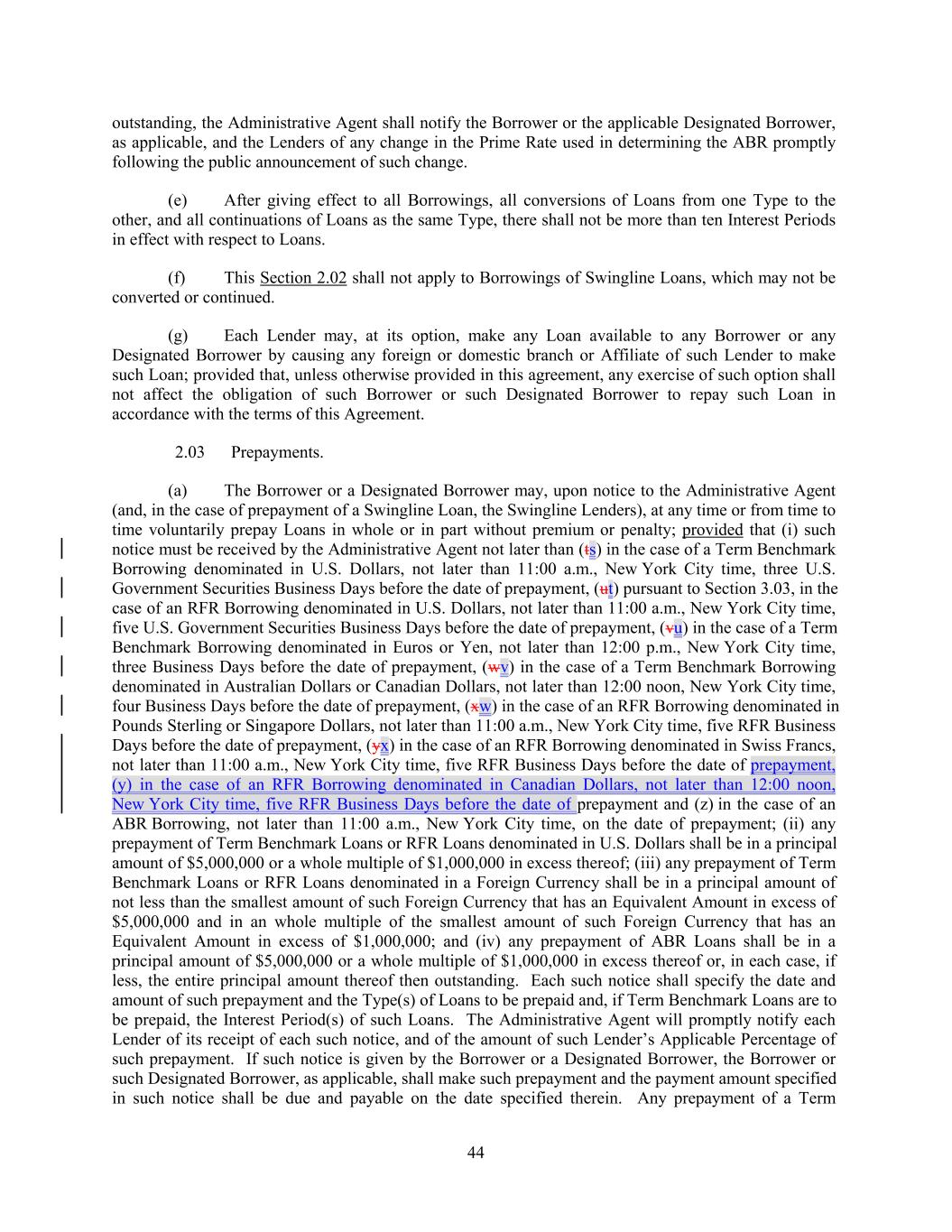 outstanding, the Administrative Agent shall notify the Borrower or the applicable Designated Borrower, as applicable, and the Lenders of any change in the Prime Rate used in determining the ABR promptly following the public announcement of such change. (e) After giving effect to all Borrowings, all conversions of Loans from one Type to the other, and all continuations of Loans as the same Type, there shall not be more than ten Interest Periods in effect with respect to Loans. (f) This Section 2.02 shall not apply to Borrowings of Swingline Loans, which may not be converted or continued. (g) Each Lender may, at its option, make any Loan available to any Borrower or any Designated Borrower by causing any foreign or domestic branch or Affiliate of such Lender to make such Loan; provided that, unless otherwise provided in this agreement, any exercise of such option shall not affect the obligation of such Borrower or such Designated Borrower to repay such Loan in accordance with the terms of this Agreement. 2.03 Prepayments. (a) The Borrower or a Designated Borrower may, upon notice to the Administrative Agent (and, in the case of prepayment of a Swingline Loan, the Swingline Lenders), at any time or from time to time voluntarily prepay Loans in whole or in part without premium or penalty; provided that (i) such notice must be received by the Administrative Agent not later than (ts) in the case of a Term Benchmark Borrowing denominated in U.S. Dollars, not later than 11:00 a.m., New York City time, three U.S. Government Securities Business Days before the date of prepayment, (ut) pursuant to Section 3.03, in the case of an RFR Borrowing denominated in U.S. Dollars, not later than 11:00 a.m., New York City time, five U.S. Government Securities Business Days before the date of prepayment, (vu) in the case of a Term Benchmark Borrowing denominated in Euros or Yen, not later than 12:00 p.m., New York City time, three Business Days before the date of prepayment, (wv) in the case of a Term Benchmark Borrowing denominated in Australian Dollars or Canadian Dollars, not later than 12:00 noon, New York City time, four Business Days before the date of prepayment, (xw) in the case of an RFR Borrowing denominated in Pounds Sterling or Singapore Dollars, not later than 11:00 a.m., New York City time, five RFR Business Days before the date of prepayment, (yx) in the case of an RFR Borrowing denominated in Swiss Francs, not later than 11:00 a.m., New York City time, five RFR Business Days before the date of prepayment, (y) in the case of an RFR Borrowing denominated in Canadian Dollars, not later than 12:00 noon, New York City time, five RFR Business Days before the date of prepayment and (z) in the case of an ABR Borrowing, not later than 11:00 a.m., New York City time, on the date of prepayment; (ii) any prepayment of Term Benchmark Loans or RFR Loans denominated in U.S. Dollars shall be in a principal amount of $5,000,000 or a whole multiple of $1,000,000 in excess thereof; (iii) any prepayment of Term Benchmark Loans or RFR Loans denominated in a Foreign Currency shall be in a principal amount of not less than the smallest amount of such Foreign Currency that has an Equivalent Amount in excess of $5,000,000 and in an whole multiple of the smallest amount of such Foreign Currency that has an Equivalent Amount in excess of $1,000,000; and (iv) any prepayment of ABR Loans shall be in a principal amount of $5,000,000 or a whole multiple of $1,000,000 in excess thereof or, in each case, if less, the entire principal amount thereof then outstanding. Each such notice shall specify the date and amount of such prepayment and the Type(s) of Loans to be prepaid and, if Term Benchmark Loans are to be prepaid, the Interest Period(s) of such Loans. The Administrative Agent will promptly notify each Lender of its receipt of each such notice, and of the amount of such Lender’s Applicable Percentage of such prepayment. If such notice is given by the Borrower or a Designated Borrower, the Borrower or such Designated Borrower, as applicable, shall make such prepayment and the payment amount specified in such notice shall be due and payable on the date specified therein. Any prepayment of a Term 44