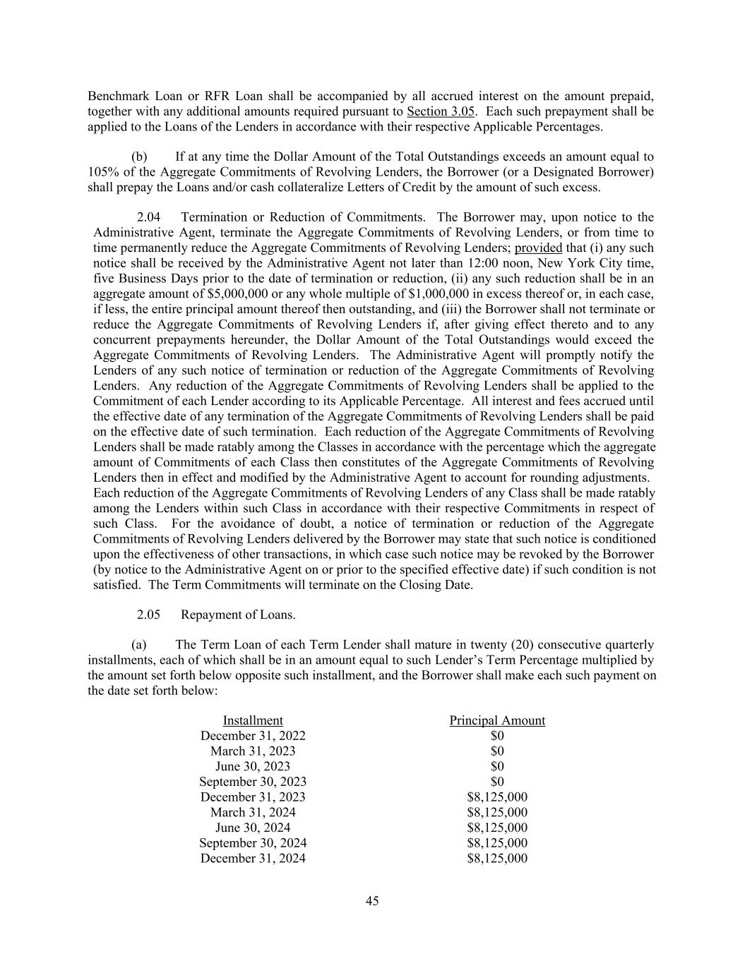 45 Installment December 31, 2022 March 31, 2023 June 30, 2023 September 30, 2023 December 31, 2023 March 31, 2024 June 30, 2024 September 30, 2024 December 31, 2024 Principal Amount $0 $0 $0 $0 $8,125,000 $8,125,000 $8,125,000 $8,125,000 $8,125,000 Benchmark Loan or RFR Loan shall be accompanied by all accrued interest on the amount prepaid, together with any additional amounts required pursuant to Section 3.05. Each such prepayment shall be applied to the Loans of the Lenders in accordance with their respective Applicable Percentages. (b) If at any time the Dollar Amount of the Total Outstandings exceeds an amount equal to 105% of the Aggregate Commitments of Revolving Lenders, the Borrower (or a Designated Borrower) shall prepay the Loans and/or cash collateralize Letters of Credit by the amount of such excess. 2.04 Termination or Reduction of Commitments. The Borrower may, upon notice to the Administrative Agent, terminate the Aggregate Commitments of Revolving Lenders, or from time to time permanently reduce the Aggregate Commitments of Revolving Lenders; provided that (i) any such notice shall be received by the Administrative Agent not later than 12:00 noon, New York City time, five Business Days prior to the date of termination or reduction, (ii) any such reduction shall be in an aggregate amount of $5,000,000 or any whole multiple of $1,000,000 in excess thereof or, in each case, if less, the entire principal amount thereof then outstanding, and (iii) the Borrower shall not terminate or reduce the Aggregate Commitments of Revolving Lenders if, after giving effect thereto and to any concurrent prepayments hereunder, the Dollar Amount of the Total Outstandings would exceed the Aggregate Commitments of Revolving Lenders. The Administrative Agent will promptly notify the Lenders of any such notice of termination or reduction of the Aggregate Commitments of Revolving Lenders. Any reduction of the Aggregate Commitments of Revolving Lenders shall be applied to the Commitment of each Lender according to its Applicable Percentage. All interest and fees accrued until the effective date of any termination of the Aggregate Commitments of Revolving Lenders shall be paid on the effective date of such termination. Each reduction of the Aggregate Commitments of Revolving Lenders shall be made ratably among the Classes in accordance with the percentage which the aggregate amount of Commitments of each Class then constitutes of the Aggregate Commitments of Revolving Lenders then in effect and modified by the Administrative Agent to account for rounding adjustments. Each reduction of the Aggregate Commitments of Revolving Lenders of any Class shall be made ratably among the Lenders within such Class in accordance with their respective Commitments in respect of such Class. For the avoidance of doubt, a notice of termination or reduction of the Aggregate Commitments of Revolving Lenders delivered by the Borrower may state that such notice is conditioned upon the effectiveness of other transactions, in which case such notice may be revoked by the Borrower (by notice to the Administrative Agent on or prior to the specified effective date) if such condition is not satisfied. The Term Commitments will terminate on the Closing Date. 2.05 Repayment of Loans. (a) The Term Loan of each Term Lender shall mature in twenty (20) consecutive quarterly installments, each of which shall be in an amount equal to such Lender’s Term Percentage multiplied by the amount set forth below opposite such installment, and the Borrower shall make each such payment on the date set forth below: