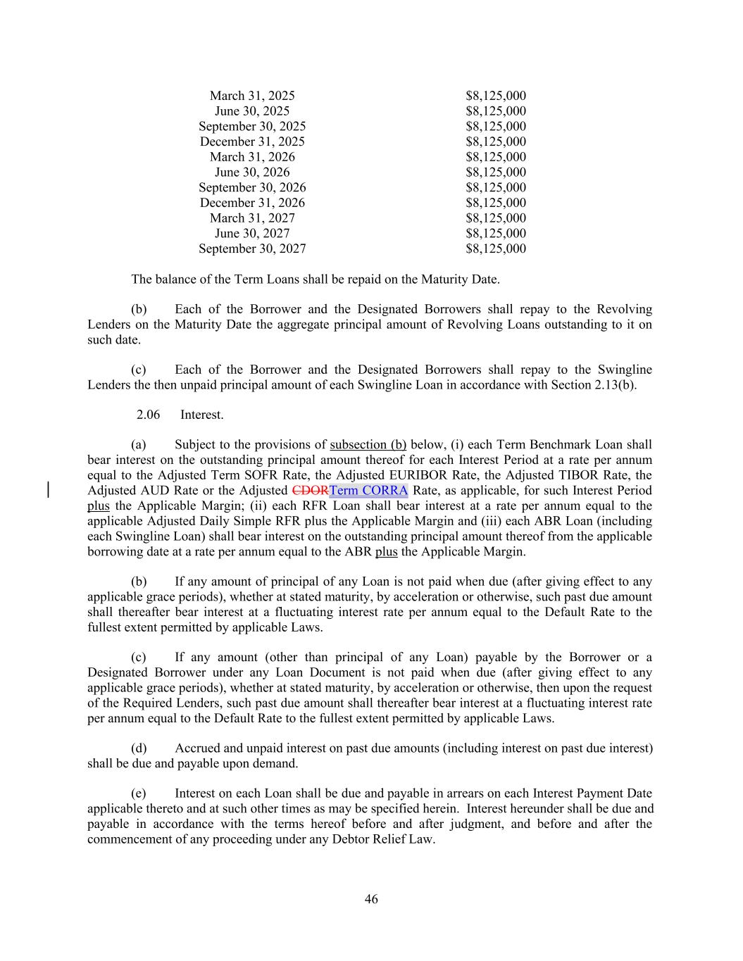 46 March 31, 2025 June 30, 2025 September 30, 2025 December 31, 2025 March 31, 2026 June 30, 2026 September 30, 2026 December 31, 2026 March 31, 2027 June 30, 2027 September 30, 2027 $8,125,000 $8,125,000 $8,125,000 $8,125,000 $8,125,000 $8,125,000 $8,125,000 $8,125,000 $8,125,000 $8,125,000 $8,125,000 The balance of the Term Loans shall be repaid on the Maturity Date. (b) Each of the Borrower and the Designated Borrowers shall repay to the Revolving Lenders on the Maturity Date the aggregate principal amount of Revolving Loans outstanding to it on such date. (c) Each of the Borrower and the Designated Borrowers shall repay to the Swingline Lenders the then unpaid principal amount of each Swingline Loan in accordance with Section 2.13(b). 2.06 Interest. (a) Subject to the provisions of subsection (b) below, (i) each Term Benchmark Loan shall bear interest on the outstanding principal amount thereof for each Interest Period at a rate per annum equal to the Adjusted Term SOFR Rate, the Adjusted EURIBOR Rate, the Adjusted TIBOR Rate, the Adjusted AUD Rate or the Adjusted CDORTerm CORRA Rate, as applicable, for such Interest Period plus the Applicable Margin; (ii) each RFR Loan shall bear interest at a rate per annum equal to the applicable Adjusted Daily Simple RFR plus the Applicable Margin and (iii) each ABR Loan (including each Swingline Loan) shall bear interest on the outstanding principal amount thereof from the applicable borrowing date at a rate per annum equal to the ABR plus the Applicable Margin. (b) If any amount of principal of any Loan is not paid when due (after giving effect to any applicable grace periods), whether at stated maturity, by acceleration or otherwise, such past due amount shall thereafter bear interest at a fluctuating interest rate per annum equal to the Default Rate to the fullest extent permitted by applicable Laws. (c) If any amount (other than principal of any Loan) payable by the Borrower or a Designated Borrower under any Loan Document is not paid when due (after giving effect to any applicable grace periods), whether at stated maturity, by acceleration or otherwise, then upon the request of the Required Lenders, such past due amount shall thereafter bear interest at a fluctuating interest rate per annum equal to the Default Rate to the fullest extent permitted by applicable Laws. (d) Accrued and unpaid interest on past due amounts (including interest on past due interest) shall be due and payable upon demand. (e) Interest on each Loan shall be due and payable in arrears on each Interest Payment Date applicable thereto and at such other times as may be specified herein. Interest hereunder shall be due and payable in accordance with the terms hereof before and after judgment, and before and after the commencement of any proceeding under any Debtor Relief Law.