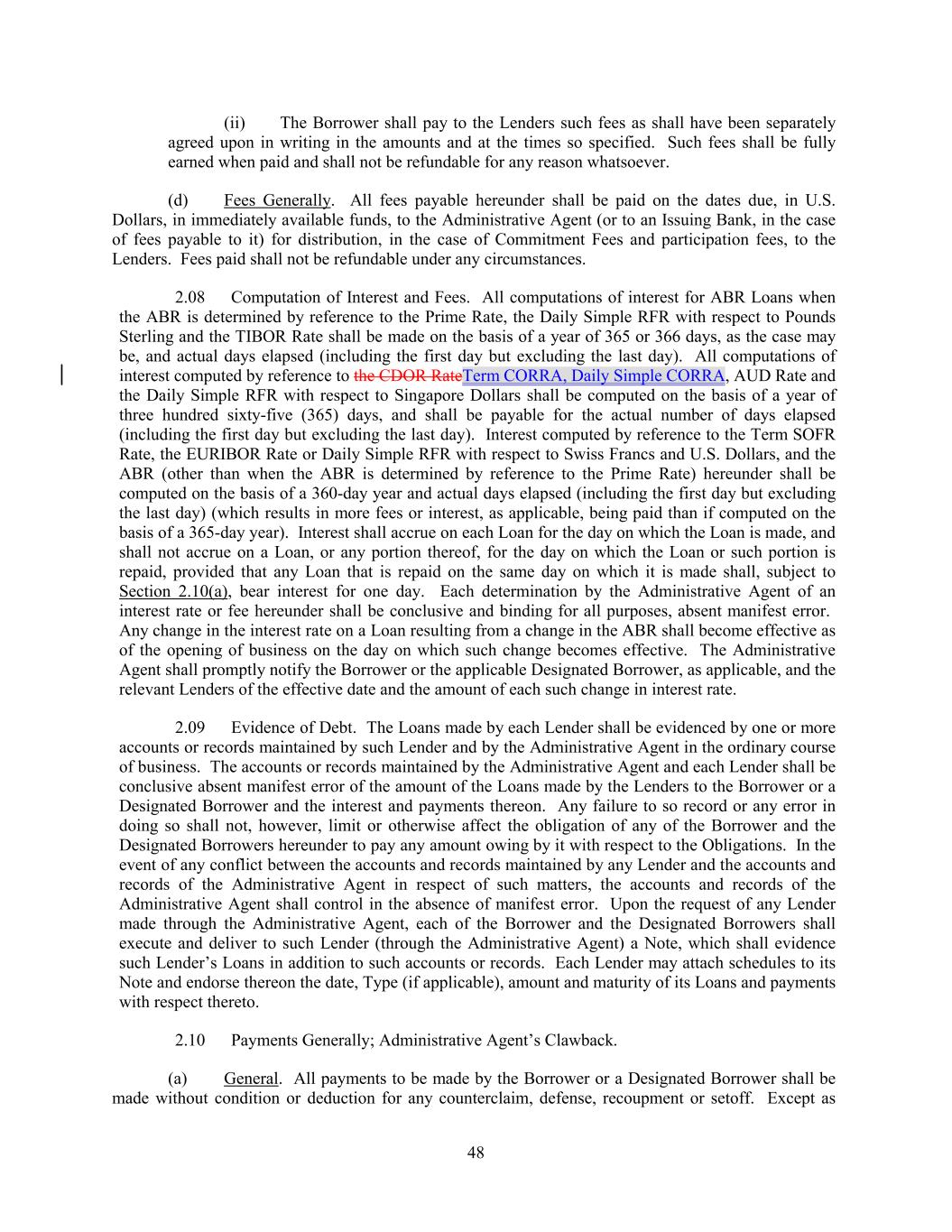 (ii) The Borrower shall pay to the Lenders such fees as shall have been separately agreed upon in writing in the amounts and at the times so specified. Such fees shall be fully earned when paid and shall not be refundable for any reason whatsoever. (d) Fees Generally. All fees payable hereunder shall be paid on the dates due, in U.S. Dollars, in immediately available funds, to the Administrative Agent (or to an Issuing Bank, in the case of fees payable to it) for distribution, in the case of Commitment Fees and participation fees, to the Lenders. Fees paid shall not be refundable under any circumstances. 2.08 Computation of Interest and Fees. All computations of interest for ABR Loans when the ABR is determined by reference to the Prime Rate, the Daily Simple RFR with respect to Pounds Sterling and the TIBOR Rate shall be made on the basis of a year of 365 or 366 days, as the case may be, and actual days elapsed (including the first day but excluding the last day). All computations of interest computed by reference to the CDOR RateTerm CORRA, Daily Simple CORRA, AUD Rate and the Daily Simple RFR with respect to Singapore Dollars shall be computed on the basis of a year of three hundred sixty-five (365) days, and shall be payable for the actual number of days elapsed (including the first day but excluding the last day). Interest computed by reference to the Term SOFR Rate, the EURIBOR Rate or Daily Simple RFR with respect to Swiss Francs and U.S. Dollars, and the ABR (other than when the ABR is determined by reference to the Prime Rate) hereunder shall be computed on the basis of a 360-day year and actual days elapsed (including the first day but excluding the last day) (which results in more fees or interest, as applicable, being paid than if computed on the basis of a 365-day year). Interest shall accrue on each Loan for the day on which the Loan is made, and shall not accrue on a Loan, or any portion thereof, for the day on which the Loan or such portion is repaid, provided that any Loan that is repaid on the same day on which it is made shall, subject to Section 2.10(a), bear interest for one day. Each determination by the Administrative Agent of an interest rate or fee hereunder shall be conclusive and binding for all purposes, absent manifest error. Any change in the interest rate on a Loan resulting from a change in the ABR shall become effective as of the opening of business on the day on which such change becomes effective. The Administrative Agent shall promptly notify the Borrower or the applicable Designated Borrower, as applicable, and the relevant Lenders of the effective date and the amount of each such change in interest rate. 2.09 Evidence of Debt. The Loans made by each Lender shall be evidenced by one or more accounts or records maintained by such Lender and by the Administrative Agent in the ordinary course of business. The accounts or records maintained by the Administrative Agent and each Lender shall be conclusive absent manifest error of the amount of the Loans made by the Lenders to the Borrower or a Designated Borrower and the interest and payments thereon. Any failure to so record or any error in doing so shall not, however, limit or otherwise affect the obligation of any of the Borrower and the Designated Borrowers hereunder to pay any amount owing by it with respect to the Obligations. In the event of any conflict between the accounts and records maintained by any Lender and the accounts and records of the Administrative Agent in respect of such matters, the accounts and records of the Administrative Agent shall control in the absence of manifest error. Upon the request of any Lender made through the Administrative Agent, each of the Borrower and the Designated Borrowers shall execute and deliver to such Lender (through the Administrative Agent) a Note, which shall evidence such Lender’s Loans in addition to such accounts or records. Each Lender may attach schedules to its Note and endorse thereon the date, Type (if applicable), amount and maturity of its Loans and payments with respect thereto. 2.10 Payments Generally; Administrative Agent’s Clawback. (a) General. All payments to be made by the Borrower or a Designated Borrower shall be made without condition or deduction for any counterclaim, defense, recoupment or setoff. Except as 48