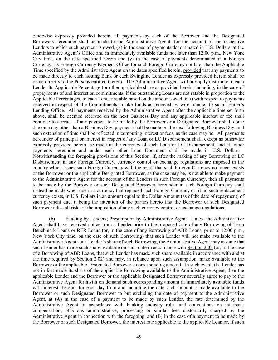 otherwise expressly provided herein, all payments by each of the Borrower and the Designated Borrowers hereunder shall be made to the Administrative Agent, for the account of the respective Lenders to which such payment is owed, (x) in the case of payments denominated in U.S. Dollars, at the Administrative Agent’s Office and in immediately available funds not later than 12:00 p.m., New York City time, on the date specified herein and (y) in the case of payments denominated in a Foreign Currency, its Foreign Currency Payment Office for such Foreign Currency not later than the Applicable Time specified by the Administrative Agent on the dates specified herein; provided that any payments to be made directly to each Issuing Bank or each Swingline Lender as expressly provided herein shall be made directly to the Persons entitled thereto. The Administrative Agent will promptly distribute to each Lender its Applicable Percentage (or other applicable share as provided herein, including, in the case of prepayments of and interest on commitments, if the outstanding Loans are not ratable in proportion to the Applicable Percentages, to each Lender ratable based on the amount owed to it) with respect to payments received in respect of the Commitments in like funds as received by wire transfer to such Lender’s Lending Office. All payments received by the Administrative Agent after the applicable time set forth above, shall be deemed received on the next Business Day and any applicable interest or fee shall continue to accrue. If any payment to be made by the Borrower or a Designated Borrower shall come due on a day other than a Business Day, payment shall be made on the next following Business Day, and such extension of time shall be reflected in computing interest or fees, as the case may be. All payments hereunder of principal or interest in respect of any Loan or LC Disbursement shall, except as otherwise expressly provided herein, be made in the currency of such Loan or LC Disbursement, and all other payments hereunder and under each other Loan Document shall be made in U.S. Dollars. Notwithstanding the foregoing provisions of this Section, if, after the making of any Borrowing or LC Disbursement in any Foreign Currency, currency control or exchange regulations are imposed in the country which issues such Foreign Currency with the result that such Foreign Currency no longer exists or the Borrower or the applicable Designated Borrower, as the case may be, is not able to make payment to the Administrative Agent for the account of the Lenders in such Foreign Currency, then all payments to be made by the Borrower or such Designated Borrower hereunder in such Foreign Currency shall instead be made when due in a currency that replaced such Foreign Currency or, if no such replacement currency exists, in U.S. Dollars in an amount equal to the Dollar Amount (as of the date of repayment) of such payment due, it being the intention of the parties hereto that the Borrower or such Designated Borrower takes all risks of the imposition of any such currency control or exchange regulations. (b) Funding by Lenders; Presumption by Administrative Agent. Unless the Administrative Agent shall have received notice from a Lender prior to the proposed date of any Borrowing of Term Benchmark Loans or RFR Loans (or, in the case of any Borrowing of ABR Loans, prior to 12:00 p.m., New York City time, on the date of such Borrowing) that such Lender will not make available to the Administrative Agent such Lender’s share of such Borrowing, the Administrative Agent may assume that such Lender has made such share available on such date in accordance with Section 2.02 (or, in the case of a Borrowing of ABR Loans, that such Lender has made such share available in accordance with and at the time required by Section 2.02) and may, in reliance upon such assumption, make available to the Borrower or the applicable Designated Borrower a corresponding amount. In such event, if a Lender has not in fact made its share of the applicable Borrowing available to the Administrative Agent, then the applicable Lender and the Borrower or the applicable Designated Borrower severally agree to pay to the Administrative Agent forthwith on demand such corresponding amount in immediately available funds with interest thereon, for each day from and including the date such amount is made available to the Borrower or such Designated Borrower to but excluding the date of payment to the Administrative Agent, at (A) in the case of a payment to be made by such Lender, the rate determined by the Administrative Agent in accordance with banking industry rules and conventions on interbank compensation, plus any administrative, processing or similar fees customarily charged by the Administrative Agent in connection with the foregoing, and (B) in the case of a payment to be made by the Borrower or such Designated Borrower, the interest rate applicable to the applicable Loan or, if such 49