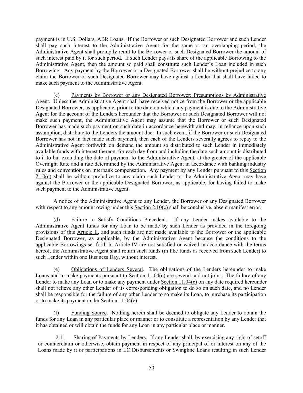 payment is in U.S. Dollars, ABR Loans. If the Borrower or such Designated Borrower and such Lender shall pay such interest to the Administrative Agent for the same or an overlapping period, the Administrative Agent shall promptly remit to the Borrower or such Designated Borrower the amount of such interest paid by it for such period. If such Lender pays its share of the applicable Borrowing to the Administrative Agent, then the amount so paid shall constitute such Lender’s Loan included in such Borrowing. Any payment by the Borrower or a Designated Borrower shall be without prejudice to any claim the Borrower or such Designated Borrower may have against a Lender that shall have failed to make such payment to the Administrative Agent. (c) Payments by Borrower or any Designated Borrower; Presumptions by Administrative Agent. Unless the Administrative Agent shall have received notice from the Borrower or the applicable Designated Borrower, as applicable, prior to the date on which any payment is due to the Administrative Agent for the account of the Lenders hereunder that the Borrower or such Designated Borrower will not make such payment, the Administrative Agent may assume that the Borrower or such Designated Borrower has made such payment on such date in accordance herewith and may, in reliance upon such assumption, distribute to the Lenders the amount due. In such event, if the Borrower or such Designated Borrower has not in fact made such payment, then each of the Lenders severally agrees to repay to the Administrative Agent forthwith on demand the amount so distributed to such Lender in immediately available funds with interest thereon, for each day from and including the date such amount is distributed to it to but excluding the date of payment to the Administrative Agent, at the greater of the applicable Overnight Rate and a rate determined by the Administrative Agent in accordance with banking industry rules and conventions on interbank compensation. Any payment by any Lender pursuant to this Section 2.10(c) shall be without prejudice to any claim such Lender or the Administrative Agent may have against the Borrower or the applicable Designated Borrower, as applicable, for having failed to make such payment to the Administrative Agent. A notice of the Administrative Agent to any Lender, the Borrower or any Designated Borrower with respect to any amount owing under this Section 2.10(c) shall be conclusive, absent manifest error. (d) Failure to Satisfy Conditions Precedent. If any Lender makes available to the Administrative Agent funds for any Loan to be made by such Lender as provided in the foregoing provisions of this Article II, and such funds are not made available to the Borrower or the applicable Designated Borrower, as applicable, by the Administrative Agent because the conditions to the applicable Borrowings set forth in Article IV are not satisfied or waived in accordance with the terms hereof, the Administrative Agent shall return such funds (in like funds as received from such Lender) to such Lender within one Business Day, without interest. (e) Obligations of Lenders Several. The obligations of the Lenders hereunder to make Loans and to make payments pursuant to Section 11.04(c) are several and not joint. The failure of any Lender to make any Loan or to make any payment under Section 11.04(c) on any date required hereunder shall not relieve any other Lender of its corresponding obligation to do so on such date, and no Lender shall be responsible for the failure of any other Lender to so make its Loan, to purchase its participation or to make its payment under Section 11.04(c). (f) Funding Source. Nothing herein shall be deemed to obligate any Lender to obtain the funds for any Loan in any particular place or manner or to constitute a representation by any Lender that it has obtained or will obtain the funds for any Loan in any particular place or manner. 2.11 Sharing of Payments by Lenders. If any Lender shall, by exercising any right of setoff or counterclaim or otherwise, obtain payment in respect of any principal of or interest on any of the Loans made by it or participations in LC Disbursements or Swingline Loans resulting in such Lender 50