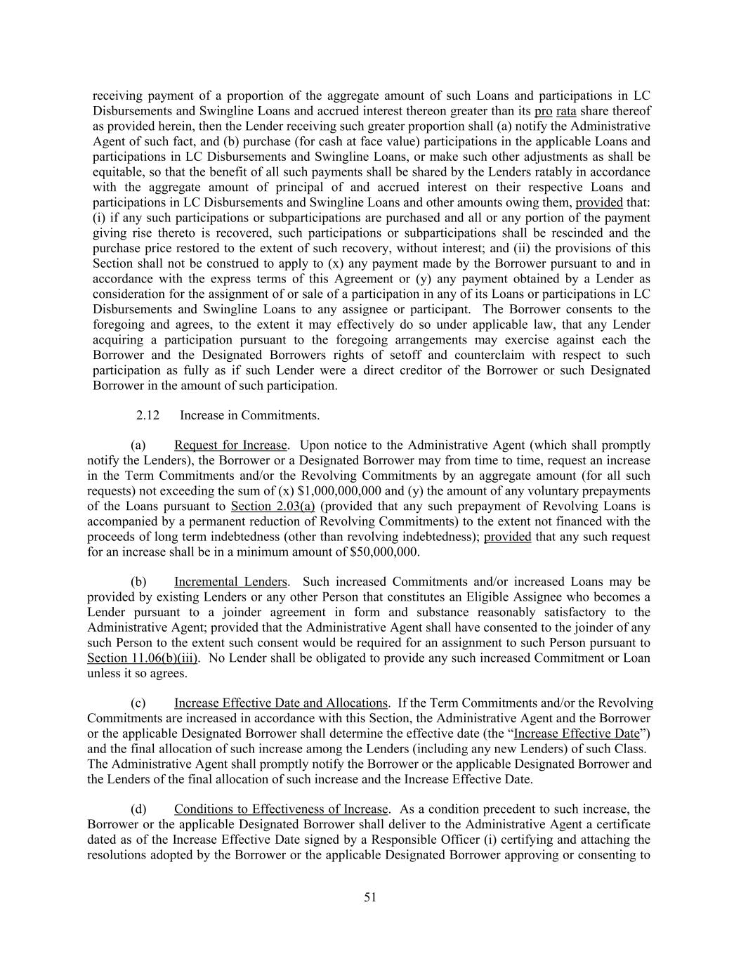 receiving payment of a proportion of the aggregate amount of such Loans and participations in LC Disbursements and Swingline Loans and accrued interest thereon greater than its pro rata share thereof as provided herein, then the Lender receiving such greater proportion shall (a) notify the Administrative Agent of such fact, and (b) purchase (for cash at face value) participations in the applicable Loans and participations in LC Disbursements and Swingline Loans, or make such other adjustments as shall be equitable, so that the benefit of all such payments shall be shared by the Lenders ratably in accordance with the aggregate amount of principal of and accrued interest on their respective Loans and participations in LC Disbursements and Swingline Loans and other amounts owing them, provided that: (i) if any such participations or subparticipations are purchased and all or any portion of the payment giving rise thereto is recovered, such participations or subparticipations shall be rescinded and the purchase price restored to the extent of such recovery, without interest; and (ii) the provisions of this Section shall not be construed to apply to (x) any payment made by the Borrower pursuant to and in accordance with the express terms of this Agreement or (y) any payment obtained by a Lender as consideration for the assignment of or sale of a participation in any of its Loans or participations in LC Disbursements and Swingline Loans to any assignee or participant. The Borrower consents to the foregoing and agrees, to the extent it may effectively do so under applicable law, that any Lender acquiring a participation pursuant to the foregoing arrangements may exercise against each the Borrower and the Designated Borrowers rights of setoff and counterclaim with respect to such participation as fully as if such Lender were a direct creditor of the Borrower or such Designated Borrower in the amount of such participation. 2.12 Increase in Commitments. (a) Request for Increase. Upon notice to the Administrative Agent (which shall promptly notify the Lenders), the Borrower or a Designated Borrower may from time to time, request an increase in the Term Commitments and/or the Revolving Commitments by an aggregate amount (for all such requests) not exceeding the sum of (x) $1,000,000,000 and (y) the amount of any voluntary prepayments of the Loans pursuant to Section 2.03(a) (provided that any such prepayment of Revolving Loans is accompanied by a permanent reduction of Revolving Commitments) to the extent not financed with the proceeds of long term indebtedness (other than revolving indebtedness); provided that any such request for an increase shall be in a minimum amount of $50,000,000. (b) Incremental Lenders. Such increased Commitments and/or increased Loans may be provided by existing Lenders or any other Person that constitutes an Eligible Assignee who becomes a Lender pursuant to a joinder agreement in form and substance reasonably satisfactory to the Administrative Agent; provided that the Administrative Agent shall have consented to the joinder of any such Person to the extent such consent would be required for an assignment to such Person pursuant to Section 11.06(b)(iii). No Lender shall be obligated to provide any such increased Commitment or Loan unless it so agrees. (c) Increase Effective Date and Allocations. If the Term Commitments and/or the Revolving Commitments are increased in accordance with this Section, the Administrative Agent and the Borrower or the applicable Designated Borrower shall determine the effective date (the “Increase Effective Date”) and the final allocation of such increase among the Lenders (including any new Lenders) of such Class. The Administrative Agent shall promptly notify the Borrower or the applicable Designated Borrower and the Lenders of the final allocation of such increase and the Increase Effective Date. (d) Conditions to Effectiveness of Increase. As a condition precedent to such increase, the Borrower or the applicable Designated Borrower shall deliver to the Administrative Agent a certificate dated as of the Increase Effective Date signed by a Responsible Officer (i) certifying and attaching the resolutions adopted by the Borrower or the applicable Designated Borrower approving or consenting to 51