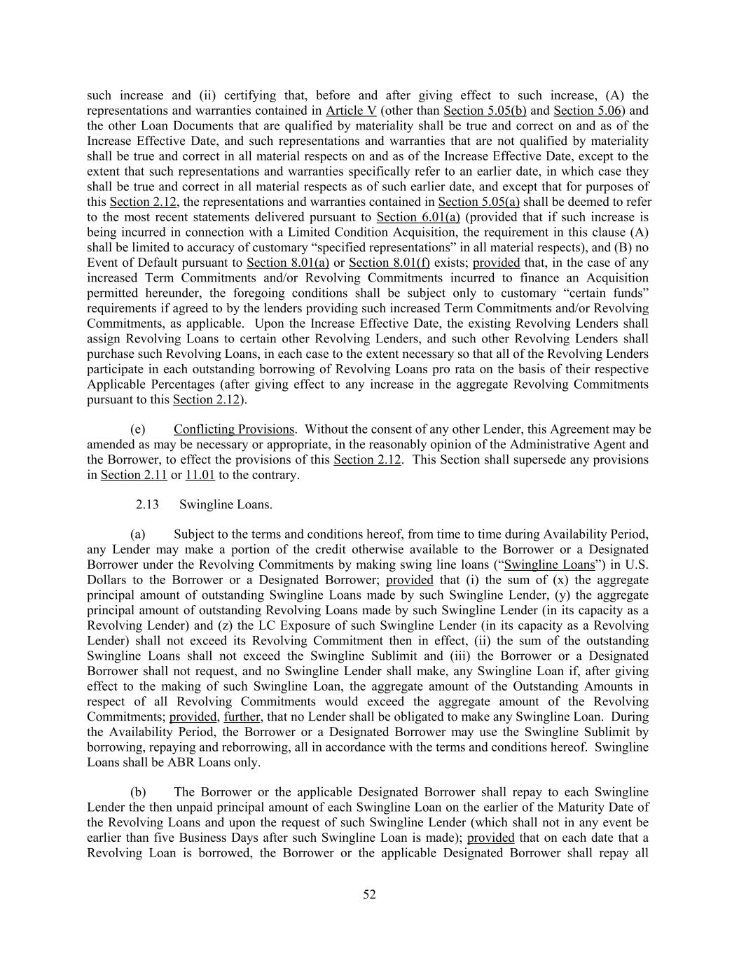 such increase and (ii) certifying that, before and after giving effect to such increase, (A) the representations and warranties contained in Article V (other than Section 5.05(b) and Section 5.06) and the other Loan Documents that are qualified by materiality shall be true and correct on and as of the Increase Effective Date, and such representations and warranties that are not qualified by materiality shall be true and correct in all material respects on and as of the Increase Effective Date, except to the extent that such representations and warranties specifically refer to an earlier date, in which case they shall be true and correct in all material respects as of such earlier date, and except that for purposes of this Section 2.12, the representations and warranties contained in Section 5.05(a) shall be deemed to refer to the most recent statements delivered pursuant to Section 6.01(a) (provided that if such increase is being incurred in connection with a Limited Condition Acquisition, the requirement in this clause (A) shall be limited to accuracy of customary “specified representations” in all material respects), and (B) no Event of Default pursuant to Section 8.01(a) or Section 8.01(f) exists; provided that, in the case of any increased Term Commitments and/or Revolving Commitments incurred to finance an Acquisition permitted hereunder, the foregoing conditions shall be subject only to customary “certain funds” requirements if agreed to by the lenders providing such increased Term Commitments and/or Revolving Commitments, as applicable. Upon the Increase Effective Date, the existing Revolving Lenders shall assign Revolving Loans to certain other Revolving Lenders, and such other Revolving Lenders shall purchase such Revolving Loans, in each case to the extent necessary so that all of the Revolving Lenders participate in each outstanding borrowing of Revolving Loans pro rata on the basis of their respective Applicable Percentages (after giving effect to any increase in the aggregate Revolving Commitments pursuant to this Section 2.12). (e) Conflicting Provisions. Without the consent of any other Lender, this Agreement may be amended as may be necessary or appropriate, in the reasonably opinion of the Administrative Agent and the Borrower, to effect the provisions of this Section 2.12. This Section shall supersede any provisions in Section 2.11 or 11.01 to the contrary. 2.13 Swingline Loans. (a) Subject to the terms and conditions hereof, from time to time during Availability Period, any Lender may make a portion of the credit otherwise available to the Borrower or a Designated Borrower under the Revolving Commitments by making swing line loans (“Swingline Loans”) in U.S. Dollars to the Borrower or a Designated Borrower; provided that (i) the sum of (x) the aggregate principal amount of outstanding Swingline Loans made by such Swingline Lender, (y) the aggregate principal amount of outstanding Revolving Loans made by such Swingline Lender (in its capacity as a Revolving Lender) and (z) the LC Exposure of such Swingline Lender (in its capacity as a Revolving Lender) shall not exceed its Revolving Commitment then in effect, (ii) the sum of the outstanding Swingline Loans shall not exceed the Swingline Sublimit and (iii) the Borrower or a Designated Borrower shall not request, and no Swingline Lender shall make, any Swingline Loan if, after giving effect to the making of such Swingline Loan, the aggregate amount of the Outstanding Amounts in respect of all Revolving Commitments would exceed the aggregate amount of the Revolving Commitments; provided, further, that no Lender shall be obligated to make any Swingline Loan. During the Availability Period, the Borrower or a Designated Borrower may use the Swingline Sublimit by borrowing, repaying and reborrowing, all in accordance with the terms and conditions hereof. Swingline Loans shall be ABR Loans only. (b) The Borrower or the applicable Designated Borrower shall repay to each Swingline Lender the then unpaid principal amount of each Swingline Loan on the earlier of the Maturity Date of the Revolving Loans and upon the request of such Swingline Lender (which shall not in any event be earlier than five Business Days after such Swingline Loan is made); provided that on each date that a Revolving Loan is borrowed, the Borrower or the applicable Designated Borrower shall repay all 52