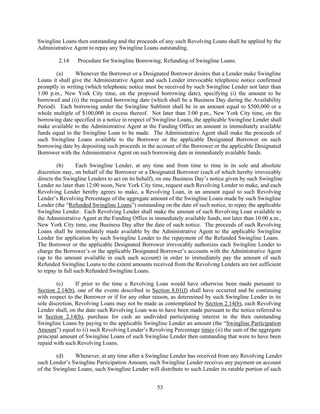 Swingline Loans then outstanding and the proceeds of any such Revolving Loans shall be applied by the Administrative Agent to repay any Swingline Loans outstanding. 2.14 Procedure for Swingline Borrowing; Refunding of Swingline Loans. (a) Whenever the Borrower or a Designated Borrower desires that a Lender make Swingline Loans it shall give the Administrative Agent and such Lender irrevocable telephonic notice confirmed promptly in writing (which telephonic notice must be received by such Swingline Lender not later than 1:00 p.m., New York City time, on the proposed borrowing date), specifying (i) the amount to be borrowed and (ii) the requested borrowing date (which shall be a Business Day during the Availability Period). Each borrowing under the Swingline Sublimit shall be in an amount equal to $500,000 or a whole multiple of $100,000 in excess thereof. Not later than 3:00 p.m., New York City time, on the borrowing date specified in a notice in respect of Swingline Loans, the applicable Swingline Lender shall make available to the Administrative Agent at the Funding Office an amount in immediately available funds equal to the Swingline Loan to be made. The Administrative Agent shall make the proceeds of such Swingline Loans available to the Borrower or the applicable Designated Borrower on such borrowing date by depositing such proceeds in the account of the Borrower or the applicable Designated Borrower with the Administrative Agent on such borrowing date in immediately available funds. (b) Each Swingline Lender, at any time and from time to time in its sole and absolute discretion may, on behalf of the Borrower or a Designated Borrower (each of which hereby irrevocably directs the Swingline Lenders to act on its behalf), on one Business Day’s notice given by such Swingline Lender no later than 12:00 noon, New York City time, request each Revolving Lender to make, and each Revolving Lender hereby agrees to make, a Revolving Loan, in an amount equal to such Revolving Lender’s Revolving Percentage of the aggregate amount of the Swingline Loans made by such Swingline Lender (the “Refunded Swingline Loans”) outstanding on the date of such notice, to repay the applicable Swingline Lender. Each Revolving Lender shall make the amount of such Revolving Loan available to the Administrative Agent at the Funding Office in immediately available funds, not later than 10:00 a.m., New York City time, one Business Day after the date of such notice. The proceeds of such Revolving Loans shall be immediately made available by the Administrative Agent to the applicable Swingline Lender for application by such Swingline Lender to the repayment of the Refunded Swingline Loans. The Borrower or the applicable Designated Borrower irrevocably authorizes each Swingline Lender to charge the Borrower’s or the applicable Designated Borrower’s accounts with the Administrative Agent (up to the amount available in each such account) in order to immediately pay the amount of such Refunded Swingline Loans to the extent amounts received from the Revolving Lenders are not sufficient to repay in full such Refunded Swingline Loans. (c) If prior to the time a Revolving Loan would have otherwise been made pursuant to Section 2.14(b), one of the events described in Section 8.01(f) shall have occurred and be continuing with respect to the Borrower or if for any other reason, as determined by such Swingline Lender in its sole discretion, Revolving Loans may not be made as contemplated by Section 2.14(b), each Revolving Lender shall, on the date such Revolving Loan was to have been made pursuant to the notice referred to in Section 2.14(b), purchase for cash an undivided participating interest in the then outstanding Swingline Loans by paying to the applicable Swingline Lender an amount (the “Swingline Participation Amount”) equal to (i) such Revolving Lender’s Revolving Percentage times (ii) the sum of the aggregate principal amount of Swingline Loans of such Swingline Lender then outstanding that were to have been repaid with such Revolving Loans. (d) Whenever, at any time after a Swingline Lender has received from any Revolving Lender such Lender’s Swingline Participation Amount, such Swingline Lender receives any payment on account of the Swingline Loans, such Swingline Lender will distribute to such Lender its ratable portion of such 53