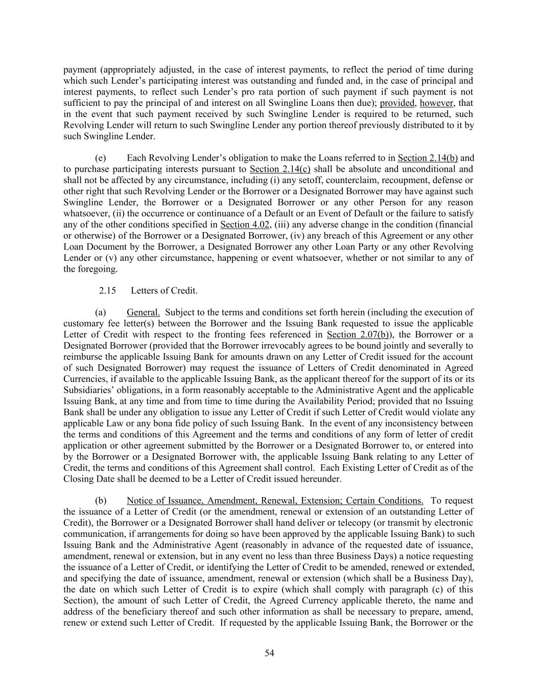 payment (appropriately adjusted, in the case of interest payments, to reflect the period of time during which such Lender’s participating interest was outstanding and funded and, in the case of principal and interest payments, to reflect such Lender’s pro rata portion of such payment if such payment is not sufficient to pay the principal of and interest on all Swingline Loans then due); provided, however, that in the event that such payment received by such Swingline Lender is required to be returned, such Revolving Lender will return to such Swingline Lender any portion thereof previously distributed to it by such Swingline Lender. (e) Each Revolving Lender’s obligation to make the Loans referred to in Section 2.14(b) and to purchase participating interests pursuant to Section 2.14(c) shall be absolute and unconditional and shall not be affected by any circumstance, including (i) any setoff, counterclaim, recoupment, defense or other right that such Revolving Lender or the Borrower or a Designated Borrower may have against such Swingline Lender, the Borrower or a Designated Borrower or any other Person for any reason whatsoever, (ii) the occurrence or continuance of a Default or an Event of Default or the failure to satisfy any of the other conditions specified in Section 4.02, (iii) any adverse change in the condition (financial or otherwise) of the Borrower or a Designated Borrower, (iv) any breach of this Agreement or any other Loan Document by the Borrower, a Designated Borrower any other Loan Party or any other Revolving Lender or (v) any other circumstance, happening or event whatsoever, whether or not similar to any of the foregoing. 2.15 Letters of Credit. (a) General. Subject to the terms and conditions set forth herein (including the execution of customary fee letter(s) between the Borrower and the Issuing Bank requested to issue the applicable Letter of Credit with respect to the fronting fees referenced in Section 2.07(b)), the Borrower or a Designated Borrower (provided that the Borrower irrevocably agrees to be bound jointly and severally to reimburse the applicable Issuing Bank for amounts drawn on any Letter of Credit issued for the account of such Designated Borrower) may request the issuance of Letters of Credit denominated in Agreed Currencies, if available to the applicable Issuing Bank, as the applicant thereof for the support of its or its Subsidiaries’ obligations, in a form reasonably acceptable to the Administrative Agent and the applicable Issuing Bank, at any time and from time to time during the Availability Period; provided that no Issuing Bank shall be under any obligation to issue any Letter of Credit if such Letter of Credit would violate any applicable Law or any bona fide policy of such Issuing Bank. In the event of any inconsistency between the terms and conditions of this Agreement and the terms and conditions of any form of letter of credit application or other agreement submitted by the Borrower or a Designated Borrower to, or entered into by the Borrower or a Designated Borrower with, the applicable Issuing Bank relating to any Letter of Credit, the terms and conditions of this Agreement shall control. Each Existing Letter of Credit as of the Closing Date shall be deemed to be a Letter of Credit issued hereunder. (b) Notice of Issuance, Amendment, Renewal, Extension; Certain Conditions. To request the issuance of a Letter of Credit (or the amendment, renewal or extension of an outstanding Letter of Credit), the Borrower or a Designated Borrower shall hand deliver or telecopy (or transmit by electronic communication, if arrangements for doing so have been approved by the applicable Issuing Bank) to such Issuing Bank and the Administrative Agent (reasonably in advance of the requested date of issuance, amendment, renewal or extension, but in any event no less than three Business Days) a notice requesting the issuance of a Letter of Credit, or identifying the Letter of Credit to be amended, renewed or extended, and specifying the date of issuance, amendment, renewal or extension (which shall be a Business Day), the date on which such Letter of Credit is to expire (which shall comply with paragraph (c) of this Section), the amount of such Letter of Credit, the Agreed Currency applicable thereto, the name and address of the beneficiary thereof and such other information as shall be necessary to prepare, amend, renew or extend such Letter of Credit. If requested by the applicable Issuing Bank, the Borrower or the 54