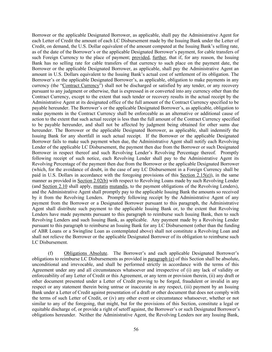 Borrower or the applicable Designated Borrower, as applicable, shall pay the Administrative Agent for each Letter of Credit the amount of each LC Disbursement made by the Issuing Bank under the Letter of Credit, on demand, the U.S. Dollar equivalent of the amount computed at the Issuing Bank’s selling rate, as of the date of the Borrower’s or the applicable Designated Borrower’s payment, for cable transfers of such Foreign Currency to the place of payment; provided, further, that if, for any reason, the Issuing Bank has no selling rate for cable transfers of that currency to such place on the payment date, the Borrower or the applicable Designated Borrower, as applicable, shall pay the Administrative Agent an amount in U.S. Dollars equivalent to the Issuing Bank’s actual cost of settlement of its obligation. The Borrower’s or the applicable Designated Borrower’s, as applicable, obligation to make payments in any currency (the “Contract Currency”) shall not be discharged or satisfied by any tender, or any recovery pursuant to any judgment or otherwise, that is expressed in or converted into any currency other than the Contract Currency, except to the extent that such tender or recovery results in the actual receipt by the Administrative Agent at its designated office of the full amount of the Contract Currency specified to be payable hereunder. The Borrower’s or the applicable Designated Borrower’s, as applicable, obligation to make payments in the Contract Currency shall be enforceable as an alternative or additional cause of action to the extent that such actual receipt is less than the full amount of the Contract Currency specified to be payable hereunder, and shall not be affected by judgment being obtained for other sums due hereunder. The Borrower or the applicable Designated Borrower, as applicable, shall indemnify the Issuing Bank for any shortfall in such actual receipt. If the Borrower or the applicable Designated Borrower fails to make such payment when due, the Administrative Agent shall notify each Revolving Lender of the applicable LC Disbursement, the payment then due from the Borrower or such Designated Borrower in respect thereof and such Revolving Lender’s Revolving Percentage thereof. Promptly following receipt of such notice, each Revolving Lender shall pay to the Administrative Agent its Revolving Percentage of the payment then due from the Borrower or the applicable Designated Borrower (which, for the avoidance of doubt, in the case of any LC Disbursement in a Foreign Currency shall be paid in U.S. Dollars in accordance with the foregoing provisions of this Section 2.15(e)), in the same manner as provided in Section 2.02(b) with respect to Revolving Loans made by such Revolving Lender (and Section 2.10 shall apply, mutatis mutandis, to the payment obligations of the Revolving Lenders), and the Administrative Agent shall promptly pay to the applicable Issuing Bank the amounts so received by it from the Revolving Lenders. Promptly following receipt by the Administrative Agent of any payment from the Borrower or a Designated Borrower pursuant to this paragraph, the Administrative Agent shall distribute such payment to the applicable Issuing Bank or, to the extent that Revolving Lenders have made payments pursuant to this paragraph to reimburse such Issuing Bank, then to such Revolving Lenders and such Issuing Bank, as applicable. Any payment made by a Revolving Lender pursuant to this paragraph to reimburse an Issuing Bank for any LC Disbursement (other than the funding of ABR Loans or a Swingline Loan as contemplated above) shall not constitute a Revolving Loan and shall not relieve the Borrower or the applicable Designated Borrower of its obligation to reimburse such LC Disbursement. (f) Obligations Absolute. The Borrower’s and each applicable Designated Borrower’s obligations to reimburse LC Disbursements as provided in paragraph (e) of this Section shall be absolute, unconditional and irrevocable, and shall be performed strictly in accordance with the terms of this Agreement under any and all circumstances whatsoever and irrespective of (i) any lack of validity or enforceability of any Letter of Credit or this Agreement, or any term or provision therein, (ii) any draft or other document presented under a Letter of Credit proving to be forged, fraudulent or invalid in any respect or any statement therein being untrue or inaccurate in any respect, (iii) payment by an Issuing Bank under a Letter of Credit against presentation of a draft or other document that does not comply with the terms of such Letter of Credit, or (iv) any other event or circumstance whatsoever, whether or not similar to any of the foregoing, that might, but for the provisions of this Section, constitute a legal or equitable discharge of, or provide a right of setoff against, the Borrower’s or such Designated Borrower’s obligations hereunder. Neither the Administrative Agent, the Revolving Lenders nor any Issuing Bank, 56