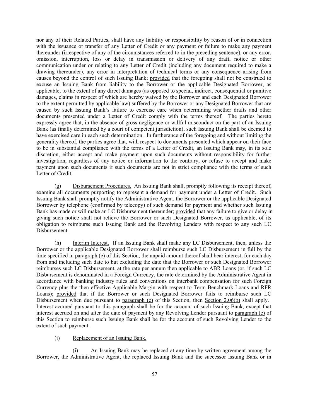 nor any of their Related Parties, shall have any liability or responsibility by reason of or in connection with the issuance or transfer of any Letter of Credit or any payment or failure to make any payment thereunder (irrespective of any of the circumstances referred to in the preceding sentence), or any error, omission, interruption, loss or delay in transmission or delivery of any draft, notice or other communication under or relating to any Letter of Credit (including any document required to make a drawing thereunder), any error in interpretation of technical terms or any consequence arising from causes beyond the control of such Issuing Bank; provided that the foregoing shall not be construed to excuse an Issuing Bank from liability to the Borrower or the applicable Designated Borrower, as applicable, to the extent of any direct damages (as opposed to special, indirect, consequential or punitive damages, claims in respect of which are hereby waived by the Borrower and each Designated Borrower to the extent permitted by applicable law) suffered by the Borrower or any Designated Borrower that are caused by such Issuing Bank’s failure to exercise care when determining whether drafts and other documents presented under a Letter of Credit comply with the terms thereof. The parties hereto expressly agree that, in the absence of gross negligence or willful misconduct on the part of an Issuing Bank (as finally determined by a court of competent jurisdiction), such Issuing Bank shall be deemed to have exercised care in each such determination. In furtherance of the foregoing and without limiting the generality thereof, the parties agree that, with respect to documents presented which appear on their face to be in substantial compliance with the terms of a Letter of Credit, an Issuing Bank may, in its sole discretion, either accept and make payment upon such documents without responsibility for further investigation, regardless of any notice or information to the contrary, or refuse to accept and make payment upon such documents if such documents are not in strict compliance with the terms of such Letter of Credit. (g) Disbursement Procedures. An Issuing Bank shall, promptly following its receipt thereof, examine all documents purporting to represent a demand for payment under a Letter of Credit. Such Issuing Bank shall promptly notify the Administrative Agent, the Borrower or the applicable Designated Borrower by telephone (confirmed by telecopy) of such demand for payment and whether such Issuing Bank has made or will make an LC Disbursement thereunder; provided that any failure to give or delay in giving such notice shall not relieve the Borrower or such Designated Borrower, as applicable, of its obligation to reimburse such Issuing Bank and the Revolving Lenders with respect to any such LC Disbursement. (h) Interim Interest. If an Issuing Bank shall make any LC Disbursement, then, unless the Borrower or the applicable Designated Borrower shall reimburse such LC Disbursement in full by the time specified in paragraph (e) of this Section, the unpaid amount thereof shall bear interest, for each day from and including such date to but excluding the date that the Borrower or such Designated Borrower reimburses such LC Disbursement, at the rate per annum then applicable to ABR Loans (or, if such LC Disbursement is denominated in a Foreign Currency, the rate determined by the Administrative Agent in accordance with banking industry rules and conventions on interbank compensation for such Foreign Currency plus the then effective Applicable Margin with respect to Term Benchmark Loans and RFR Loans); provided that if the Borrower or such Designated Borrower fails to reimburse such LC Disbursement when due pursuant to paragraph (e) of this Section, then Section 2.06(b) shall apply. Interest accrued pursuant to this paragraph shall be for the account of such Issuing Bank, except that interest accrued on and after the date of payment by any Revolving Lender pursuant to paragraph (e) of this Section to reimburse such Issuing Bank shall be for the account of such Revolving Lender to the extent of such payment. (i) Replacement of an Issuing Bank. (i) An Issuing Bank may be replaced at any time by written agreement among the Borrower, the Administrative Agent, the replaced Issuing Bank and the successor Issuing Bank or in 57
