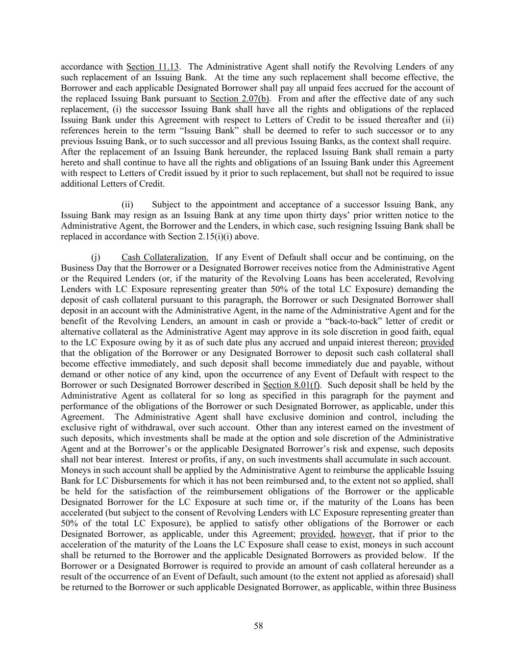 accordance with Section 11.13. The Administrative Agent shall notify the Revolving Lenders of any such replacement of an Issuing Bank. At the time any such replacement shall become effective, the Borrower and each applicable Designated Borrower shall pay all unpaid fees accrued for the account of the replaced Issuing Bank pursuant to Section 2.07(b). From and after the effective date of any such replacement, (i) the successor Issuing Bank shall have all the rights and obligations of the replaced Issuing Bank under this Agreement with respect to Letters of Credit to be issued thereafter and (ii) references herein to the term “Issuing Bank” shall be deemed to refer to such successor or to any previous Issuing Bank, or to such successor and all previous Issuing Banks, as the context shall require. After the replacement of an Issuing Bank hereunder, the replaced Issuing Bank shall remain a party hereto and shall continue to have all the rights and obligations of an Issuing Bank under this Agreement with respect to Letters of Credit issued by it prior to such replacement, but shall not be required to issue additional Letters of Credit. (ii) Subject to the appointment and acceptance of a successor Issuing Bank, any Issuing Bank may resign as an Issuing Bank at any time upon thirty days’ prior written notice to the Administrative Agent, the Borrower and the Lenders, in which case, such resigning Issuing Bank shall be replaced in accordance with Section 2.15(i)(i) above. (j) Cash Collateralization. If any Event of Default shall occur and be continuing, on the Business Day that the Borrower or a Designated Borrower receives notice from the Administrative Agent or the Required Lenders (or, if the maturity of the Revolving Loans has been accelerated, Revolving Lenders with LC Exposure representing greater than 50% of the total LC Exposure) demanding the deposit of cash collateral pursuant to this paragraph, the Borrower or such Designated Borrower shall deposit in an account with the Administrative Agent, in the name of the Administrative Agent and for the benefit of the Revolving Lenders, an amount in cash or provide a “back-to-back” letter of credit or alternative collateral as the Administrative Agent may approve in its sole discretion in good faith, equal to the LC Exposure owing by it as of such date plus any accrued and unpaid interest thereon; provided that the obligation of the Borrower or any Designated Borrower to deposit such cash collateral shall become effective immediately, and such deposit shall become immediately due and payable, without demand or other notice of any kind, upon the occurrence of any Event of Default with respect to the Borrower or such Designated Borrower described in Section 8.01(f). Such deposit shall be held by the Administrative Agent as collateral for so long as specified in this paragraph for the payment and performance of the obligations of the Borrower or such Designated Borrower, as applicable, under this Agreement. The Administrative Agent shall have exclusive dominion and control, including the exclusive right of withdrawal, over such account. Other than any interest earned on the investment of such deposits, which investments shall be made at the option and sole discretion of the Administrative Agent and at the Borrower’s or the applicable Designated Borrower’s risk and expense, such deposits shall not bear interest. Interest or profits, if any, on such investments shall accumulate in such account. Moneys in such account shall be applied by the Administrative Agent to reimburse the applicable Issuing Bank for LC Disbursements for which it has not been reimbursed and, to the extent not so applied, shall be held for the satisfaction of the reimbursement obligations of the Borrower or the applicable Designated Borrower for the LC Exposure at such time or, if the maturity of the Loans has been accelerated (but subject to the consent of Revolving Lenders with LC Exposure representing greater than 50% of the total LC Exposure), be applied to satisfy other obligations of the Borrower or each Designated Borrower, as applicable, under this Agreement; provided, however, that if prior to the acceleration of the maturity of the Loans the LC Exposure shall cease to exist, moneys in such account shall be returned to the Borrower and the applicable Designated Borrowers as provided below. If the Borrower or a Designated Borrower is required to provide an amount of cash collateral hereunder as a result of the occurrence of an Event of Default, such amount (to the extent not applied as aforesaid) shall be returned to the Borrower or such applicable Designated Borrower, as applicable, within three Business 58