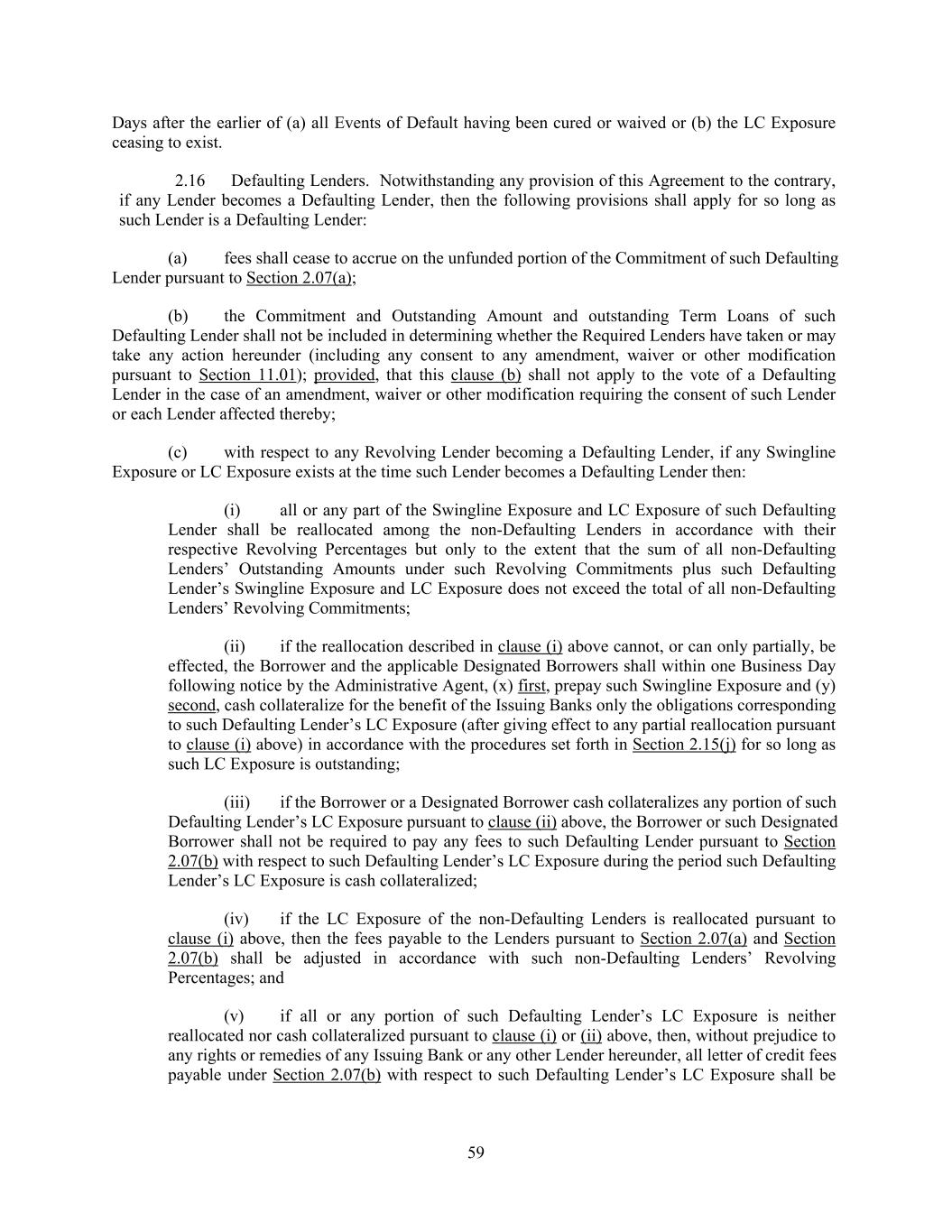 Days after the earlier of (a) all Events of Default having been cured or waived or (b) the LC Exposure ceasing to exist. 2.16 Defaulting Lenders. Notwithstanding any provision of this Agreement to the contrary, if any Lender becomes a Defaulting Lender, then the following provisions shall apply for so long as such Lender is a Defaulting Lender: (a) fees shall cease to accrue on the unfunded portion of the Commitment of such Defaulting Lender pursuant to Section 2.07(a); (b) the Commitment and Outstanding Amount and outstanding Term Loans of such Defaulting Lender shall not be included in determining whether the Required Lenders have taken or may take any action hereunder (including any consent to any amendment, waiver or other modification pursuant to Section 11.01); provided, that this clause (b) shall not apply to the vote of a Defaulting Lender in the case of an amendment, waiver or other modification requiring the consent of such Lender or each Lender affected thereby; (c) with respect to any Revolving Lender becoming a Defaulting Lender, if any Swingline Exposure or LC Exposure exists at the time such Lender becomes a Defaulting Lender then: (i) all or any part of the Swingline Exposure and LC Exposure of such Defaulting Lender shall be reallocated among the non-Defaulting Lenders in accordance with their respective Revolving Percentages but only to the extent that the sum of all non-Defaulting Lenders’ Outstanding Amounts under such Revolving Commitments plus such Defaulting Lender’s Swingline Exposure and LC Exposure does not exceed the total of all non-Defaulting Lenders’ Revolving Commitments; (ii) if the reallocation described in clause (i) above cannot, or can only partially, be effected, the Borrower and the applicable Designated Borrowers shall within one Business Day following notice by the Administrative Agent, (x) first, prepay such Swingline Exposure and (y) second, cash collateralize for the benefit of the Issuing Banks only the obligations corresponding to such Defaulting Lender’s LC Exposure (after giving effect to any partial reallocation pursuant to clause (i) above) in accordance with the procedures set forth in Section 2.15(j) for so long as such LC Exposure is outstanding; (iii) if the Borrower or a Designated Borrower cash collateralizes any portion of such Defaulting Lender’s LC Exposure pursuant to clause (ii) above, the Borrower or such Designated Borrower shall not be required to pay any fees to such Defaulting Lender pursuant to Section 2.07(b) with respect to such Defaulting Lender’s LC Exposure during the period such Defaulting Lender’s LC Exposure is cash collateralized; (iv) if the LC Exposure of the non-Defaulting Lenders is reallocated pursuant to clause (i) above, then the fees payable to the Lenders pursuant to Section 2.07(a) and Section 2.07(b) shall be adjusted in accordance with such non-Defaulting Lenders’ Revolving Percentages; and (v) if all or any portion of such Defaulting Lender’s LC Exposure is neither reallocated nor cash collateralized pursuant to clause (i) or (ii) above, then, without prejudice to any rights or remedies of any Issuing Bank or any other Lender hereunder, all letter of credit fees payable under Section 2.07(b) with respect to such Defaulting Lender’s LC Exposure shall be 59