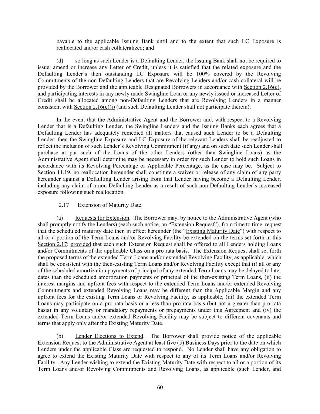 payable to the applicable Issuing Bank until and to the extent that such LC Exposure is reallocated and/or cash collateralized; and (d) so long as such Lender is a Defaulting Lender, the Issuing Bank shall not be required to issue, amend or increase any Letter of Credit, unless it is satisfied that the related exposure and the Defaulting Lender’s then outstanding LC Exposure will be 100% covered by the Revolving Commitments of the non-Defaulting Lenders that are Revolving Lenders and/or cash collateral will be provided by the Borrower and the applicable Designated Borrowers in accordance with Section 2.16(c), and participating interests in any newly made Swingline Loan or any newly issued or increased Letter of Credit shall be allocated among non-Defaulting Lenders that are Revolving Lenders in a manner consistent with Section 2.16(c)(i) (and such Defaulting Lender shall not participate therein). In the event that the Administrative Agent and the Borrower and, with respect to a Revolving Lender that is a Defaulting Lender, the Swingline Lenders and the Issuing Banks each agrees that a Defaulting Lender has adequately remedied all matters that caused such Lender to be a Defaulting Lender, then the Swingline Exposure and LC Exposure of the relevant Lenders shall be readjusted to reflect the inclusion of such Lender’s Revolving Commitment (if any) and on such date such Lender shall purchase at par such of the Loans of the other Lenders (other than Swingline Loans) as the Administrative Agent shall determine may be necessary in order for such Lender to hold such Loans in accordance with its Revolving Percentage or Applicable Percentage, as the case may be. Subject to Section 11.19, no reallocation hereunder shall constitute a waiver or release of any claim of any party hereunder against a Defaulting Lender arising from that Lender having become a Defaulting Lender, including any claim of a non-Defaulting Lender as a result of such non-Defaulting Lender’s increased exposure following such reallocation. 2.17 Extension of Maturity Date. (a) Requests for Extension. The Borrower may, by notice to the Administrative Agent (who shall promptly notify the Lenders) (each such notice, an “Extension Request”), from time to time, request that the scheduled maturity date then in effect hereunder (the “Existing Maturity Date”) with respect to all or a portion of the Term Loans and/or Revolving Facility be extended on the terms set forth in this Section 2.17; provided that each such Extension Request shall be offered to all Lenders holding Loans and/or Commitments of the applicable Class on a pro rata basis. The Extension Request shall set forth the proposed terms of the extended Term Loans and/or extended Revolving Facility, as applicable, which shall be consistent with the then-existing Term Loans and/or Revolving Facility except that (i) all or any of the scheduled amortization payments of principal of any extended Term Loans may be delayed to later dates than the scheduled amortization payments of principal of the then-existing Term Loans, (ii) the interest margins and upfront fees with respect to the extended Term Loans and/or extended Revolving Commitments and extended Revolving Loans may be different than the Applicable Margin and any upfront fees for the existing Term Loans or Revolving Facility, as applicable, (iii) the extended Term Loans may participate on a pro rata basis or a less than pro rata basis (but not a greater than pro rata basis) in any voluntary or mandatory repayments or prepayments under this Agreement and (iv) the extended Term Loans and/or extended Revolving Facility may be subject to different covenants and terms that apply only after the Existing Maturity Date. (b) Lender Elections to Extend. The Borrower shall provide notice of the applicable Extension Request to the Administrative Agent at least five (5) Business Days prior to the date on which Lenders under the applicable Class are requested to respond. No Lender shall have any obligation to agree to extend the Existing Maturity Date with respect to any of its Term Loans and/or Revolving Facility. Any Lender wishing to extend the Existing Maturity Date with respect to all or a portion of its Term Loans and/or Revolving Commitments and Revolving Loans, as applicable (such Lender, and 60