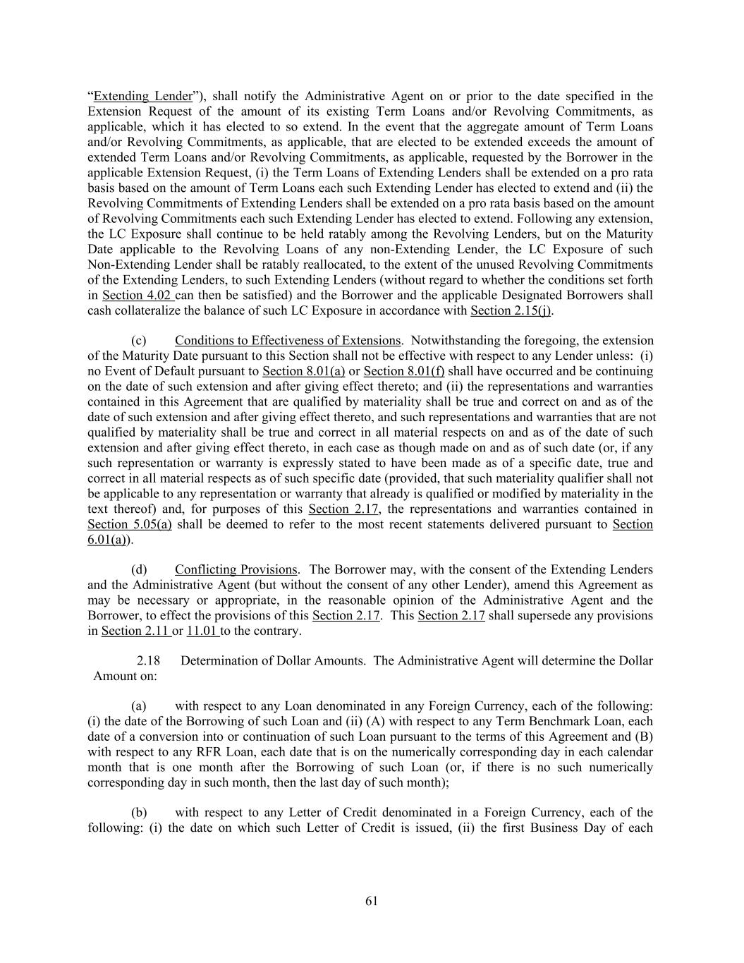 “Extending Lender”), shall notify the Administrative Agent on or prior to the date specified in the Extension Request of the amount of its existing Term Loans and/or Revolving Commitments, as applicable, which it has elected to so extend. In the event that the aggregate amount of Term Loans and/or Revolving Commitments, as applicable, that are elected to be extended exceeds the amount of extended Term Loans and/or Revolving Commitments, as applicable, requested by the Borrower in the applicable Extension Request, (i) the Term Loans of Extending Lenders shall be extended on a pro rata basis based on the amount of Term Loans each such Extending Lender has elected to extend and (ii) the Revolving Commitments of Extending Lenders shall be extended on a pro rata basis based on the amount of Revolving Commitments each such Extending Lender has elected to extend. Following any extension, the LC Exposure shall continue to be held ratably among the Revolving Lenders, but on the Maturity Date applicable to the Revolving Loans of any non-Extending Lender, the LC Exposure of such Non-Extending Lender shall be ratably reallocated, to the extent of the unused Revolving Commitments of the Extending Lenders, to such Extending Lenders (without regard to whether the conditions set forth in Section 4.02 can then be satisfied) and the Borrower and the applicable Designated Borrowers shall cash collateralize the balance of such LC Exposure in accordance with Section 2.15(j). (c) Conditions to Effectiveness of Extensions. Notwithstanding the foregoing, the extension of the Maturity Date pursuant to this Section shall not be effective with respect to any Lender unless: (i) no Event of Default pursuant to Section 8.01(a) or Section 8.01(f) shall have occurred and be continuing on the date of such extension and after giving effect thereto; and (ii) the representations and warranties contained in this Agreement that are qualified by materiality shall be true and correct on and as of the date of such extension and after giving effect thereto, and such representations and warranties that are not qualified by materiality shall be true and correct in all material respects on and as of the date of such extension and after giving effect thereto, in each case as though made on and as of such date (or, if any such representation or warranty is expressly stated to have been made as of a specific date, true and correct in all material respects as of such specific date (provided, that such materiality qualifier shall not be applicable to any representation or warranty that already is qualified or modified by materiality in the text thereof) and, for purposes of this Section 2.17, the representations and warranties contained in Section 5.05(a) shall be deemed to refer to the most recent statements delivered pursuant to Section 6.01(a)). (d) Conflicting Provisions. The Borrower may, with the consent of the Extending Lenders and the Administrative Agent (but without the consent of any other Lender), amend this Agreement as may be necessary or appropriate, in the reasonable opinion of the Administrative Agent and the Borrower, to effect the provisions of this Section 2.17. This Section 2.17 shall supersede any provisions in Section 2.11 or 11.01 to the contrary. 2.18 Determination of Dollar Amounts. The Administrative Agent will determine the Dollar Amount on: (a) with respect to any Loan denominated in any Foreign Currency, each of the following: (i) the date of the Borrowing of such Loan and (ii) (A) with respect to any Term Benchmark Loan, each date of a conversion into or continuation of such Loan pursuant to the terms of this Agreement and (B) with respect to any RFR Loan, each date that is on the numerically corresponding day in each calendar month that is one month after the Borrowing of such Loan (or, if there is no such numerically corresponding day in such month, then the last day of such month); (b) with respect to any Letter of Credit denominated in a Foreign Currency, each of the following: (i) the date on which such Letter of Credit is issued, (ii) the first Business Day of each 61