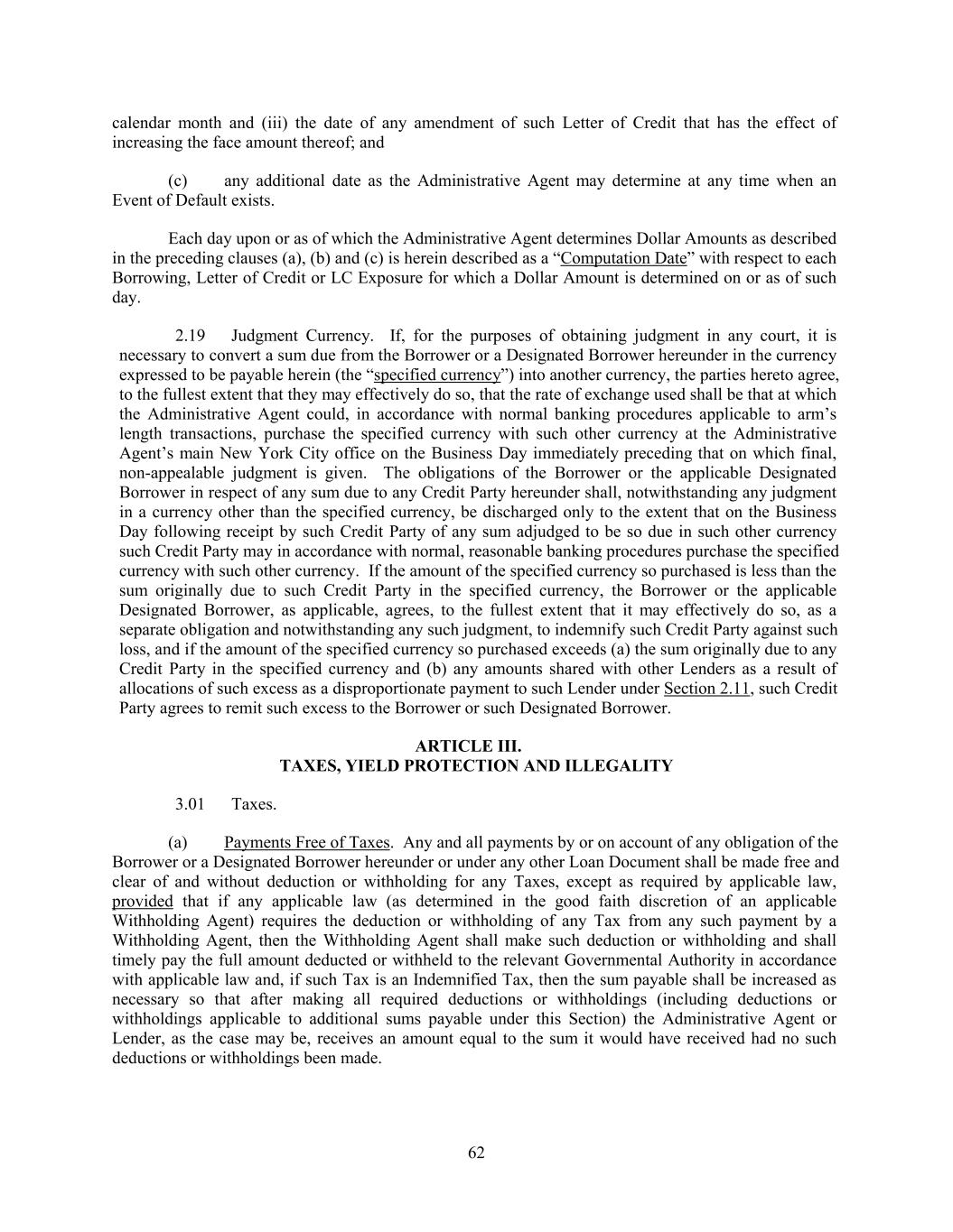 calendar month and (iii) the date of any amendment of such Letter of Credit that has the effect of increasing the face amount thereof; and (c) any additional date as the Administrative Agent may determine at any time when an Event of Default exists. Each day upon or as of which the Administrative Agent determines Dollar Amounts as described in the preceding clauses (a), (b) and (c) is herein described as a “Computation Date” with respect to each Borrowing, Letter of Credit or LC Exposure for which a Dollar Amount is determined on or as of such day. 2.19 Judgment Currency. If, for the purposes of obtaining judgment in any court, it is necessary to convert a sum due from the Borrower or a Designated Borrower hereunder in the currency expressed to be payable herein (the “specified currency”) into another currency, the parties hereto agree, to the fullest extent that they may effectively do so, that the rate of exchange used shall be that at which the Administrative Agent could, in accordance with normal banking procedures applicable to arm’s length transactions, purchase the specified currency with such other currency at the Administrative Agent’s main New York City office on the Business Day immediately preceding that on which final, non-appealable judgment is given. The obligations of the Borrower or the applicable Designated Borrower in respect of any sum due to any Credit Party hereunder shall, notwithstanding any judgment in a currency other than the specified currency, be discharged only to the extent that on the Business Day following receipt by such Credit Party of any sum adjudged to be so due in such other currency such Credit Party may in accordance with normal, reasonable banking procedures purchase the specified currency with such other currency. If the amount of the specified currency so purchased is less than the sum originally due to such Credit Party in the specified currency, the Borrower or the applicable Designated Borrower, as applicable, agrees, to the fullest extent that it may effectively do so, as a separate obligation and notwithstanding any such judgment, to indemnify such Credit Party against such loss, and if the amount of the specified currency so purchased exceeds (a) the sum originally due to any Credit Party in the specified currency and (b) any amounts shared with other Lenders as a result of allocations of such excess as a disproportionate payment to such Lender under Section 2.11, such Credit Party agrees to remit such excess to the Borrower or such Designated Borrower. ARTICLE III. TAXES, YIELD PROTECTION AND ILLEGALITY 3.01 Taxes. (a) Payments Free of Taxes. Any and all payments by or on account of any obligation of the Borrower or a Designated Borrower hereunder or under any other Loan Document shall be made free and clear of and without deduction or withholding for any Taxes, except as required by applicable law, provided that if any applicable law (as determined in the good faith discretion of an applicable Withholding Agent) requires the deduction or withholding of any Tax from any such payment by a Withholding Agent, then the Withholding Agent shall make such deduction or withholding and shall timely pay the full amount deducted or withheld to the relevant Governmental Authority in accordance with applicable law and, if such Tax is an Indemnified Tax, then the sum payable shall be increased as necessary so that after making all required deductions or withholdings (including deductions or withholdings applicable to additional sums payable under this Section) the Administrative Agent or Lender, as the case may be, receives an amount equal to the sum it would have received had no such deductions or withholdings been made. 62