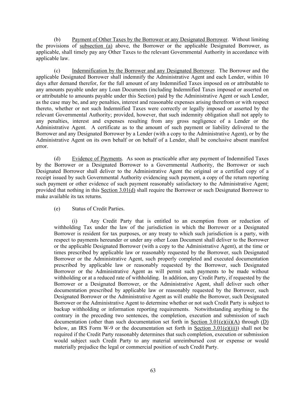(b) Payment of Other Taxes by the Borrower or any Designated Borrower. Without limiting the provisions of subsection (a) above, the Borrower or the applicable Designated Borrower, as applicable, shall timely pay any Other Taxes to the relevant Governmental Authority in accordance with applicable law. (c) Indemnification by the Borrower and any Designated Borrower. The Borrower and the applicable Designated Borrower shall indemnify the Administrative Agent and each Lender, within 10 days after demand therefor, for the full amount of any Indemnified Taxes imposed on or attributable to any amounts payable under any Loan Documents (including Indemnified Taxes imposed or asserted on or attributable to amounts payable under this Section) paid by the Administrative Agent or such Lender, as the case may be, and any penalties, interest and reasonable expenses arising therefrom or with respect thereto, whether or not such Indemnified Taxes were correctly or legally imposed or asserted by the relevant Governmental Authority; provided, however, that such indemnity obligation shall not apply to any penalties, interest and expenses resulting from any gross negligence of a Lender or the Administrative Agent. A certificate as to the amount of such payment or liability delivered to the Borrower and any Designated Borrower by a Lender (with a copy to the Administrative Agent), or by the Administrative Agent on its own behalf or on behalf of a Lender, shall be conclusive absent manifest error. (d) Evidence of Payments. As soon as practicable after any payment of Indemnified Taxes by the Borrower or a Designated Borrower to a Governmental Authority, the Borrower or such Designated Borrower shall deliver to the Administrative Agent the original or a certified copy of a receipt issued by such Governmental Authority evidencing such payment, a copy of the return reporting such payment or other evidence of such payment reasonably satisfactory to the Administrative Agent; provided that nothing in this Section 3.01(d) shall require the Borrower or such Designated Borrower to make available its tax returns. (e) Status of Credit Parties. (i) Any Credit Party that is entitled to an exemption from or reduction of withholding Tax under the law of the jurisdiction in which the Borrower or a Designated Borrower is resident for tax purposes, or any treaty to which such jurisdiction is a party, with respect to payments hereunder or under any other Loan Document shall deliver to the Borrower or the applicable Designated Borrower (with a copy to the Administrative Agent), at the time or times prescribed by applicable law or reasonably requested by the Borrower, such Designated Borrower or the Administrative Agent, such properly completed and executed documentation prescribed by applicable law or reasonably requested by the Borrower, such Designated Borrower or the Administrative Agent as will permit such payments to be made without withholding or at a reduced rate of withholding. In addition, any Credit Party, if requested by the Borrower or a Designated Borrower, or the Administrative Agent, shall deliver such other documentation prescribed by applicable law or reasonably requested by the Borrower, such Designated Borrower or the Administrative Agent as will enable the Borrower, such Designated Borrower or the Administrative Agent to determine whether or not such Credit Party is subject to backup withholding or information reporting requirements. Notwithstanding anything to the contrary in the preceding two sentences, the completion, execution and submission of such documentation (other than such documentation set forth in Section 3.01(e)(ii)(A) through (D) below, an IRS Form W-9 or the documentation set forth in Section 3.01(e)(iii)) shall not be required if the Credit Party reasonably determines that such completion, execution or submission would subject such Credit Party to any material unreimbursed cost or expense or would materially prejudice the legal or commercial position of such Credit Party. 63