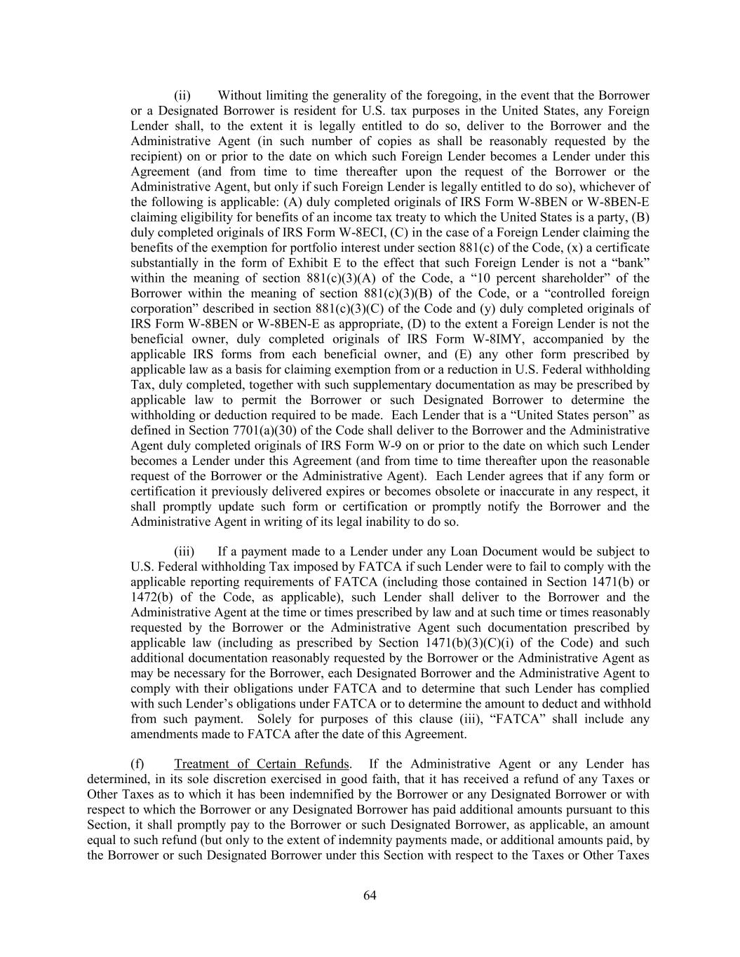 (ii) Without limiting the generality of the foregoing, in the event that the Borrower or a Designated Borrower is resident for U.S. tax purposes in the United States, any Foreign Lender shall, to the extent it is legally entitled to do so, deliver to the Borrower and the Administrative Agent (in such number of copies as shall be reasonably requested by the recipient) on or prior to the date on which such Foreign Lender becomes a Lender under this Agreement (and from time to time thereafter upon the request of the Borrower or the Administrative Agent, but only if such Foreign Lender is legally entitled to do so), whichever of the following is applicable: (A) duly completed originals of IRS Form W-8BEN or W-8BEN-E claiming eligibility for benefits of an income tax treaty to which the United States is a party, (B) duly completed originals of IRS Form W-8ECI, (C) in the case of a Foreign Lender claiming the benefits of the exemption for portfolio interest under section 881(c) of the Code, (x) a certificate substantially in the form of Exhibit E to the effect that such Foreign Lender is not a “bank” within the meaning of section 881(c)(3)(A) of the Code, a “10 percent shareholder” of the Borrower within the meaning of section 881(c)(3)(B) of the Code, or a “controlled foreign corporation” described in section 881(c)(3)(C) of the Code and (y) duly completed originals of IRS Form W-8BEN or W-8BEN-E as appropriate, (D) to the extent a Foreign Lender is not the beneficial owner, duly completed originals of IRS Form W-8IMY, accompanied by the applicable IRS forms from each beneficial owner, and (E) any other form prescribed by applicable law as a basis for claiming exemption from or a reduction in U.S. Federal withholding Tax, duly completed, together with such supplementary documentation as may be prescribed by applicable law to permit the Borrower or such Designated Borrower to determine the withholding or deduction required to be made. Each Lender that is a “United States person” as defined in Section 7701(a)(30) of the Code shall deliver to the Borrower and the Administrative Agent duly completed originals of IRS Form W-9 on or prior to the date on which such Lender becomes a Lender under this Agreement (and from time to time thereafter upon the reasonable request of the Borrower or the Administrative Agent). Each Lender agrees that if any form or certification it previously delivered expires or becomes obsolete or inaccurate in any respect, it shall promptly update such form or certification or promptly notify the Borrower and the Administrative Agent in writing of its legal inability to do so. (iii) If a payment made to a Lender under any Loan Document would be subject to U.S. Federal withholding Tax imposed by FATCA if such Lender were to fail to comply with the applicable reporting requirements of FATCA (including those contained in Section 1471(b) or 1472(b) of the Code, as applicable), such Lender shall deliver to the Borrower and the Administrative Agent at the time or times prescribed by law and at such time or times reasonably requested by the Borrower or the Administrative Agent such documentation prescribed by applicable law (including as prescribed by Section 1471(b)(3)(C)(i) of the Code) and such additional documentation reasonably requested by the Borrower or the Administrative Agent as may be necessary for the Borrower, each Designated Borrower and the Administrative Agent to comply with their obligations under FATCA and to determine that such Lender has complied with such Lender’s obligations under FATCA or to determine the amount to deduct and withhold from such payment. Solely for purposes of this clause (iii), “FATCA” shall include any amendments made to FATCA after the date of this Agreement. (f) Treatment of Certain Refunds. If the Administrative Agent or any Lender has determined, in its sole discretion exercised in good faith, that it has received a refund of any Taxes or Other Taxes as to which it has been indemnified by the Borrower or any Designated Borrower or with respect to which the Borrower or any Designated Borrower has paid additional amounts pursuant to this Section, it shall promptly pay to the Borrower or such Designated Borrower, as applicable, an amount equal to such refund (but only to the extent of indemnity payments made, or additional amounts paid, by the Borrower or such Designated Borrower under this Section with respect to the Taxes or Other Taxes 64