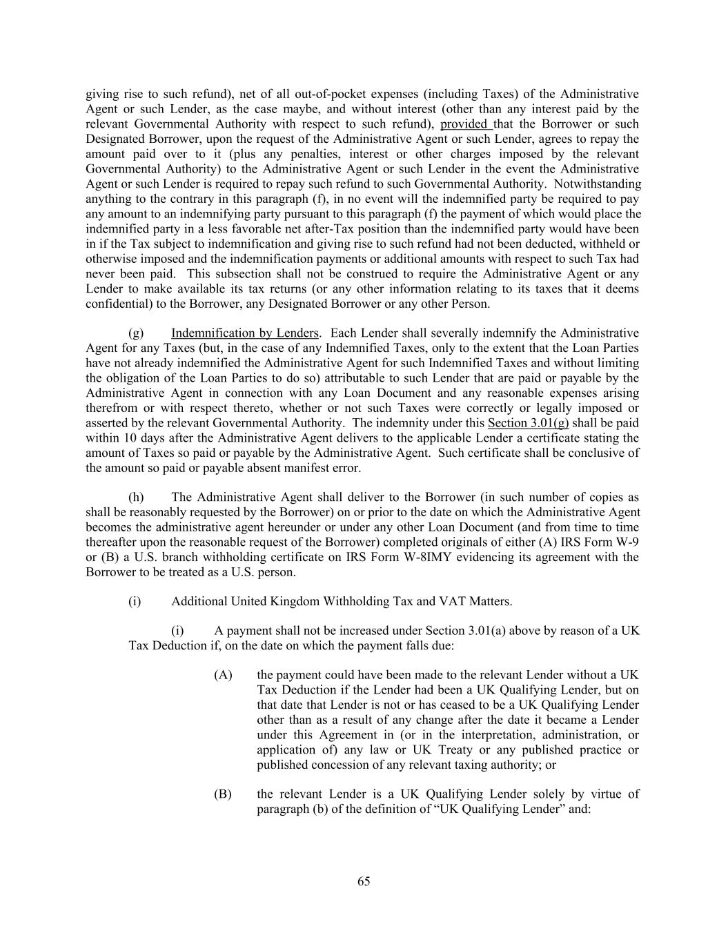 giving rise to such refund), net of all out-of-pocket expenses (including Taxes) of the Administrative Agent or such Lender, as the case maybe, and without interest (other than any interest paid by the relevant Governmental Authority with respect to such refund), provided that the Borrower or such Designated Borrower, upon the request of the Administrative Agent or such Lender, agrees to repay the amount paid over to it (plus any penalties, interest or other charges imposed by the relevant Governmental Authority) to the Administrative Agent or such Lender in the event the Administrative Agent or such Lender is required to repay such refund to such Governmental Authority. Notwithstanding anything to the contrary in this paragraph (f), in no event will the indemnified party be required to pay any amount to an indemnifying party pursuant to this paragraph (f) the payment of which would place the indemnified party in a less favorable net after-Tax position than the indemnified party would have been in if the Tax subject to indemnification and giving rise to such refund had not been deducted, withheld or otherwise imposed and the indemnification payments or additional amounts with respect to such Tax had never been paid. This subsection shall not be construed to require the Administrative Agent or any Lender to make available its tax returns (or any other information relating to its taxes that it deems confidential) to the Borrower, any Designated Borrower or any other Person. (g) Indemnification by Lenders. Each Lender shall severally indemnify the Administrative Agent for any Taxes (but, in the case of any Indemnified Taxes, only to the extent that the Loan Parties have not already indemnified the Administrative Agent for such Indemnified Taxes and without limiting the obligation of the Loan Parties to do so) attributable to such Lender that are paid or payable by the Administrative Agent in connection with any Loan Document and any reasonable expenses arising therefrom or with respect thereto, whether or not such Taxes were correctly or legally imposed or asserted by the relevant Governmental Authority. The indemnity under this Section 3.01(g) shall be paid within 10 days after the Administrative Agent delivers to the applicable Lender a certificate stating the amount of Taxes so paid or payable by the Administrative Agent. Such certificate shall be conclusive of the amount so paid or payable absent manifest error. (h) The Administrative Agent shall deliver to the Borrower (in such number of copies as shall be reasonably requested by the Borrower) on or prior to the date on which the Administrative Agent becomes the administrative agent hereunder or under any other Loan Document (and from time to time thereafter upon the reasonable request of the Borrower) completed originals of either (A) IRS Form W-9 or (B) a U.S. branch withholding certificate on IRS Form W-8IMY evidencing its agreement with the Borrower to be treated as a U.S. person. (i) Additional United Kingdom Withholding Tax and VAT Matters. (i) A payment shall not be increased under Section 3.01(a) above by reason of a UK Tax Deduction if, on the date on which the payment falls due: (A) the payment could have been made to the relevant Lender without a UK Tax Deduction if the Lender had been a UK Qualifying Lender, but on that date that Lender is not or has ceased to be a UK Qualifying Lender other than as a result of any change after the date it became a Lender under this Agreement in (or in the interpretation, administration, or application of) any law or UK Treaty or any published practice or published concession of any relevant taxing authority; or (B) the relevant Lender is a UK Qualifying Lender solely by virtue of paragraph (b) of the definition of “UK Qualifying Lender” and: 65