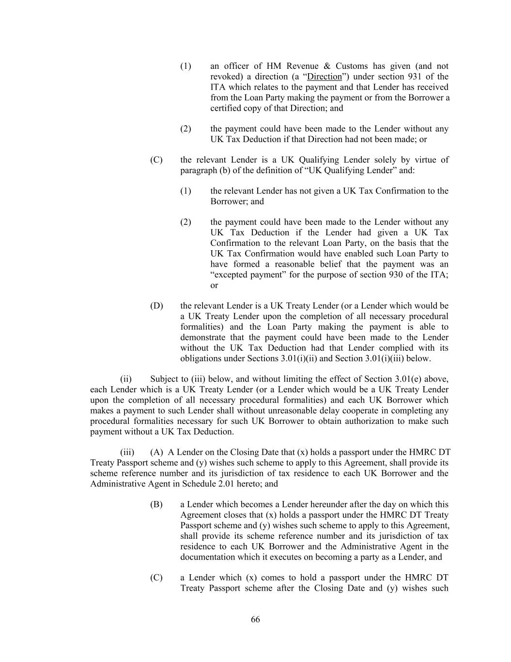 (1) an officer of HM Revenue & Customs has given (and not revoked) a direction (a “Direction”) under section 931 of the ITA which relates to the payment and that Lender has received from the Loan Party making the payment or from the Borrower a certified copy of that Direction; and (2) the payment could have been made to the Lender without any UK Tax Deduction if that Direction had not been made; or (C) the relevant Lender is a UK Qualifying Lender solely by virtue of paragraph (b) of the definition of “UK Qualifying Lender” and: (1) the relevant Lender has not given a UK Tax Confirmation to the Borrower; and (2) the payment could have been made to the Lender without any UK Tax Deduction if the Lender had given a UK Tax Confirmation to the relevant Loan Party, on the basis that the UK Tax Confirmation would have enabled such Loan Party to have formed a reasonable belief that the payment was an “excepted payment” for the purpose of section 930 of the ITA; or (D) the relevant Lender is a UK Treaty Lender (or a Lender which would be a UK Treaty Lender upon the completion of all necessary procedural formalities) and the Loan Party making the payment is able to demonstrate that the payment could have been made to the Lender without the UK Tax Deduction had that Lender complied with its obligations under Sections 3.01(i)(ii) and Section 3.01(i)(iii) below. (ii) Subject to (iii) below, and without limiting the effect of Section 3.01(e) above, each Lender which is a UK Treaty Lender (or a Lender which would be a UK Treaty Lender upon the completion of all necessary procedural formalities) and each UK Borrower which makes a payment to such Lender shall without unreasonable delay cooperate in completing any procedural formalities necessary for such UK Borrower to obtain authorization to make such payment without a UK Tax Deduction. (iii) (A) A Lender on the Closing Date that (x) holds a passport under the HMRC DT Treaty Passport scheme and (y) wishes such scheme to apply to this Agreement, shall provide its scheme reference number and its jurisdiction of tax residence to each UK Borrower and the Administrative Agent in Schedule 2.01 hereto; and (B) a Lender which becomes a Lender hereunder after the day on which this Agreement closes that (x) holds a passport under the HMRC DT Treaty Passport scheme and (y) wishes such scheme to apply to this Agreement, shall provide its scheme reference number and its jurisdiction of tax residence to each UK Borrower and the Administrative Agent in the documentation which it executes on becoming a party as a Lender, and (C) a Lender which (x) comes to hold a passport under the HMRC DT Treaty Passport scheme after the Closing Date and (y) wishes such 66