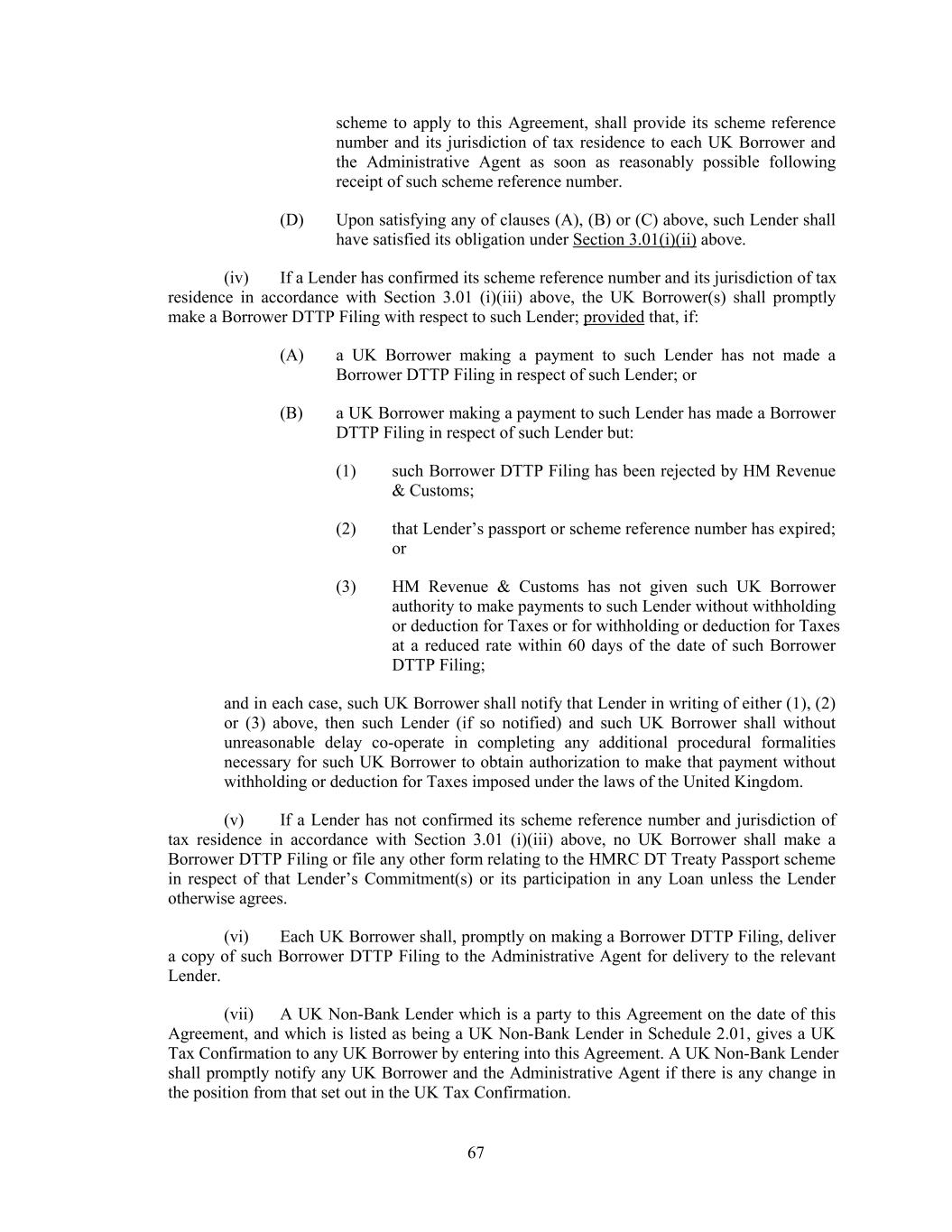 scheme to apply to this Agreement, shall provide its scheme reference number and its jurisdiction of tax residence to each UK Borrower and the Administrative Agent as soon as reasonably possible following receipt of such scheme reference number. (D) Upon satisfying any of clauses (A), (B) or (C) above, such Lender shall have satisfied its obligation under Section 3.01(i)(ii) above. (iv) If a Lender has confirmed its scheme reference number and its jurisdiction of tax residence in accordance with Section 3.01 (i)(iii) above, the UK Borrower(s) shall promptly make a Borrower DTTP Filing with respect to such Lender; provided that, if: (A) a UK Borrower making a payment to such Lender has not made a Borrower DTTP Filing in respect of such Lender; or (B) a UK Borrower making a payment to such Lender has made a Borrower DTTP Filing in respect of such Lender but: (1) such Borrower DTTP Filing has been rejected by HM Revenue & Customs; (2) that Lender’s passport or scheme reference number has expired; or (3) HM Revenue & Customs has not given such UK Borrower authority to make payments to such Lender without withholding or deduction for Taxes or for withholding or deduction for Taxes at a reduced rate within 60 days of the date of such Borrower DTTP Filing; and in each case, such UK Borrower shall notify that Lender in writing of either (1), (2) or (3) above, then such Lender (if so notified) and such UK Borrower shall without unreasonable delay co-operate in completing any additional procedural formalities necessary for such UK Borrower to obtain authorization to make that payment without withholding or deduction for Taxes imposed under the laws of the United Kingdom. (v) If a Lender has not confirmed its scheme reference number and jurisdiction of tax residence in accordance with Section 3.01 (i)(iii) above, no UK Borrower shall make a Borrower DTTP Filing or file any other form relating to the HMRC DT Treaty Passport scheme in respect of that Lender’s Commitment(s) or its participation in any Loan unless the Lender otherwise agrees. (vi) Each UK Borrower shall, promptly on making a Borrower DTTP Filing, deliver a copy of such Borrower DTTP Filing to the Administrative Agent for delivery to the relevant Lender. (vii) A UK Non-Bank Lender which is a party to this Agreement on the date of this Agreement, and which is listed as being a UK Non-Bank Lender in Schedule 2.01, gives a UK Tax Confirmation to any UK Borrower by entering into this Agreement. A UK Non-Bank Lender shall promptly notify any UK Borrower and the Administrative Agent if there is any change in the position from that set out in the UK Tax Confirmation. 67