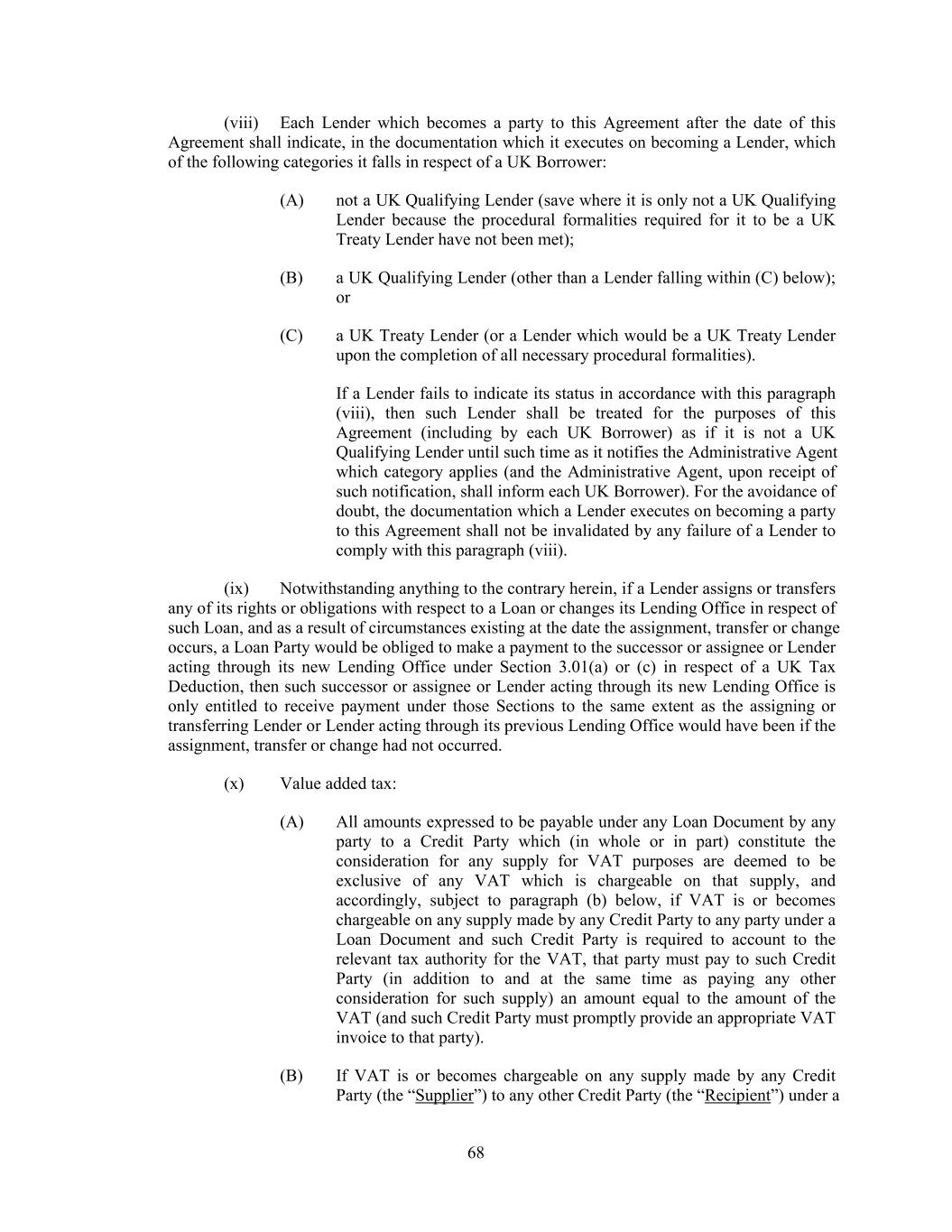 (viii) Each Lender which becomes a party to this Agreement after the date of this Agreement shall indicate, in the documentation which it executes on becoming a Lender, which of the following categories it falls in respect of a UK Borrower: (A) not a UK Qualifying Lender (save where it is only not a UK Qualifying Lender because the procedural formalities required for it to be a UK Treaty Lender have not been met); (B) a UK Qualifying Lender (other than a Lender falling within (C) below); or (C) a UK Treaty Lender (or a Lender which would be a UK Treaty Lender upon the completion of all necessary procedural formalities). If a Lender fails to indicate its status in accordance with this paragraph (viii), then such Lender shall be treated for the purposes of this Agreement (including by each UK Borrower) as if it is not a UK Qualifying Lender until such time as it notifies the Administrative Agent which category applies (and the Administrative Agent, upon receipt of such notification, shall inform each UK Borrower). For the avoidance of doubt, the documentation which a Lender executes on becoming a party to this Agreement shall not be invalidated by any failure of a Lender to comply with this paragraph (viii). (ix) Notwithstanding anything to the contrary herein, if a Lender assigns or transfers any of its rights or obligations with respect to a Loan or changes its Lending Office in respect of such Loan, and as a result of circumstances existing at the date the assignment, transfer or change occurs, a Loan Party would be obliged to make a payment to the successor or assignee or Lender acting through its new Lending Office under Section 3.01(a) or (c) in respect of a UK Tax Deduction, then such successor or assignee or Lender acting through its new Lending Office is only entitled to receive payment under those Sections to the same extent as the assigning or transferring Lender or Lender acting through its previous Lending Office would have been if the assignment, transfer or change had not occurred. (x) Value added tax: (A) All amounts expressed to be payable under any Loan Document by any party to a Credit Party which (in whole or in part) constitute the consideration for any supply for VAT purposes are deemed to be exclusive of any VAT which is chargeable on that supply, and accordingly, subject to paragraph (b) below, if VAT is or becomes chargeable on any supply made by any Credit Party to any party under a Loan Document and such Credit Party is required to account to the relevant tax authority for the VAT, that party must pay to such Credit Party (in addition to and at the same time as paying any other consideration for such supply) an amount equal to the amount of the VAT (and such Credit Party must promptly provide an appropriate VAT invoice to that party). (B) If VAT is or becomes chargeable on any supply made by any Credit Party (the “Supplier”) to any other Credit Party (the “Recipient”) under a 68