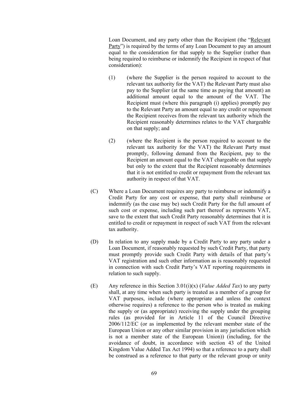 Loan Document, and any party other than the Recipient (the “Relevant Party”) is required by the terms of any Loan Document to pay an amount equal to the consideration for that supply to the Supplier (rather than being required to reimburse or indemnify the Recipient in respect of that consideration): (1) (where the Supplier is the person required to account to the relevant tax authority for the VAT) the Relevant Party must also pay to the Supplier (at the same time as paying that amount) an additional amount equal to the amount of the VAT. The Recipient must (where this paragraph (i) applies) promptly pay to the Relevant Party an amount equal to any credit or repayment the Recipient receives from the relevant tax authority which the Recipient reasonably determines relates to the VAT chargeable on that supply; and (2) (where the Recipient is the person required to account to the relevant tax authority for the VAT) the Relevant Party must promptly, following demand from the Recipient, pay to the Recipient an amount equal to the VAT chargeable on that supply but only to the extent that the Recipient reasonably determines that it is not entitled to credit or repayment from the relevant tax authority in respect of that VAT. (C) Where a Loan Document requires any party to reimburse or indemnify a Credit Party for any cost or expense, that party shall reimburse or indemnify (as the case may be) such Credit Party for the full amount of such cost or expense, including such part thereof as represents VAT, save to the extent that such Credit Party reasonably determines that it is entitled to credit or repayment in respect of such VAT from the relevant tax authority. (D) In relation to any supply made by a Credit Party to any party under a Loan Document, if reasonably requested by such Credit Party, that party must promptly provide such Credit Party with details of that party’s VAT registration and such other information as is reasonably requested in connection with such Credit Party’s VAT reporting requirements in relation to such supply. (E) Any reference in this Section 3.01(i)(x) (Value Added Tax) to any party shall, at any time when such party is treated as a member of a group for VAT purposes, include (where appropriate and unless the context otherwise requires) a reference to the person who is treated as making the supply or (as appropriate) receiving the supply under the grouping rules (as provided for in Article 11 of the Council Directive 2006/112/EC (or as implemented by the relevant member state of the European Union or any other similar provision in any jurisdiction which is not a member state of the European Union)) (including, for the avoidance of doubt, in accordance with section 43 of the United Kingdom Value Added Tax Act 1994) so that a reference to a party shall be construed as a reference to that party or the relevant group or unity 69