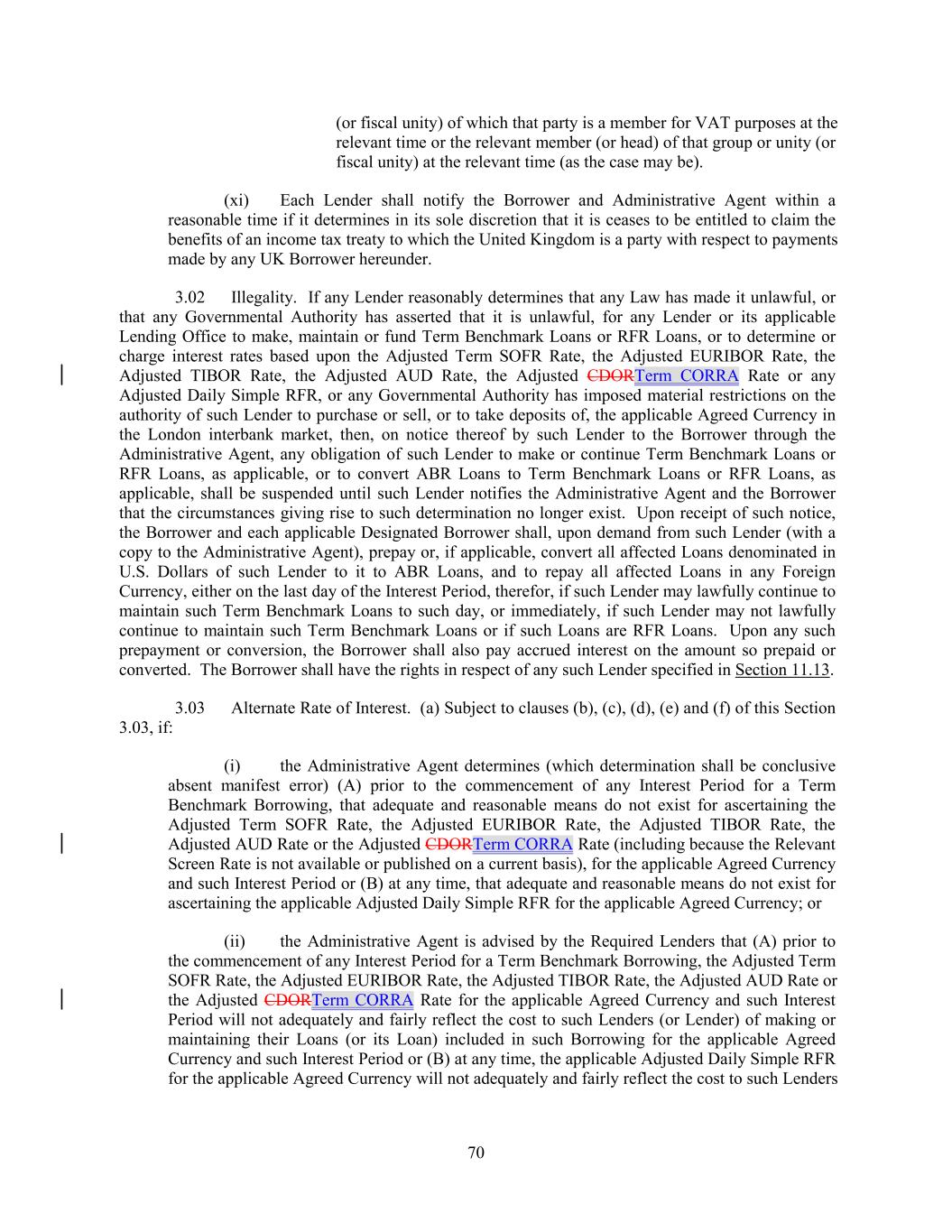 (or fiscal unity) of which that party is a member for VAT purposes at the relevant time or the relevant member (or head) of that group or unity (or fiscal unity) at the relevant time (as the case may be). (xi) Each Lender shall notify the Borrower and Administrative Agent within a reasonable time if it determines in its sole discretion that it is ceases to be entitled to claim the benefits of an income tax treaty to which the United Kingdom is a party with respect to payments made by any UK Borrower hereunder. 3.02 Illegality. If any Lender reasonably determines that any Law has made it unlawful, or that any Governmental Authority has asserted that it is unlawful, for any Lender or its applicable Lending Office to make, maintain or fund Term Benchmark Loans or RFR Loans, or to determine or charge interest rates based upon the Adjusted Term SOFR Rate, the Adjusted EURIBOR Rate, the Adjusted TIBOR Rate, the Adjusted AUD Rate, the Adjusted CDORTerm CORRA Rate or any Adjusted Daily Simple RFR, or any Governmental Authority has imposed material restrictions on the authority of such Lender to purchase or sell, or to take deposits of, the applicable Agreed Currency in the London interbank market, then, on notice thereof by such Lender to the Borrower through the Administrative Agent, any obligation of such Lender to make or continue Term Benchmark Loans or RFR Loans, as applicable, or to convert ABR Loans to Term Benchmark Loans or RFR Loans, as applicable, shall be suspended until such Lender notifies the Administrative Agent and the Borrower that the circumstances giving rise to such determination no longer exist. Upon receipt of such notice, the Borrower and each applicable Designated Borrower shall, upon demand from such Lender (with a copy to the Administrative Agent), prepay or, if applicable, convert all affected Loans denominated in U.S. Dollars of such Lender to it to ABR Loans, and to repay all affected Loans in any Foreign Currency, either on the last day of the Interest Period, therefor, if such Lender may lawfully continue to maintain such Term Benchmark Loans to such day, or immediately, if such Lender may not lawfully continue to maintain such Term Benchmark Loans or if such Loans are RFR Loans. Upon any such prepayment or conversion, the Borrower shall also pay accrued interest on the amount so prepaid or converted. The Borrower shall have the rights in respect of any such Lender specified in Section 11.13. 3.03 Alternate Rate of Interest. (a) Subject to clauses (b), (c), (d), (e) and (f) of this Section 3.03, if: (i) the Administrative Agent determines (which determination shall be conclusive absent manifest error) (A) prior to the commencement of any Interest Period for a Term Benchmark Borrowing, that adequate and reasonable means do not exist for ascertaining the Adjusted Term SOFR Rate, the Adjusted EURIBOR Rate, the Adjusted TIBOR Rate, the Adjusted AUD Rate or the Adjusted CDORTerm CORRA Rate (including because the Relevant Screen Rate is not available or published on a current basis), for the applicable Agreed Currency and such Interest Period or (B) at any time, that adequate and reasonable means do not exist for ascertaining the applicable Adjusted Daily Simple RFR for the applicable Agreed Currency; or (ii) the Administrative Agent is advised by the Required Lenders that (A) prior to the commencement of any Interest Period for a Term Benchmark Borrowing, the Adjusted Term SOFR Rate, the Adjusted EURIBOR Rate, the Adjusted TIBOR Rate, the Adjusted AUD Rate or the Adjusted CDORTerm CORRA Rate for the applicable Agreed Currency and such Interest Period will not adequately and fairly reflect the cost to such Lenders (or Lender) of making or maintaining their Loans (or its Loan) included in such Borrowing for the applicable Agreed Currency and such Interest Period or (B) at any time, the applicable Adjusted Daily Simple RFR for the applicable Agreed Currency will not adequately and fairly reflect the cost to such Lenders 70