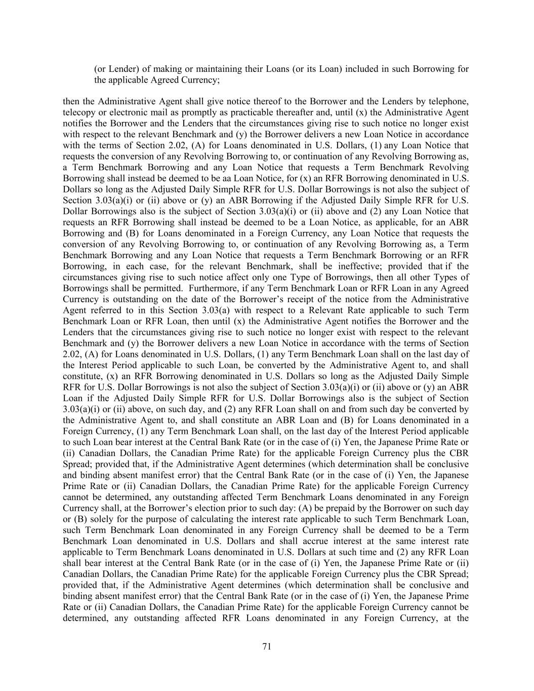(or Lender) of making or maintaining their Loans (or its Loan) included in such Borrowing for the applicable Agreed Currency; then the Administrative Agent shall give notice thereof to the Borrower and the Lenders by telephone, telecopy or electronic mail as promptly as practicable thereafter and, until (x) the Administrative Agent notifies the Borrower and the Lenders that the circumstances giving rise to such notice no longer exist with respect to the relevant Benchmark and (y) the Borrower delivers a new Loan Notice in accordance with the terms of Section 2.02, (A) for Loans denominated in U.S. Dollars, (1) any Loan Notice that requests the conversion of any Revolving Borrowing to, or continuation of any Revolving Borrowing as, a Term Benchmark Borrowing and any Loan Notice that requests a Term Benchmark Revolving Borrowing shall instead be deemed to be aa Loan Notice, for (x) an RFR Borrowing denominated in U.S. Dollars so long as the Adjusted Daily Simple RFR for U.S. Dollar Borrowings is not also the subject of Section 3.03(a)(i) or (ii) above or (y) an ABR Borrowing if the Adjusted Daily Simple RFR for U.S. Dollar Borrowings also is the subject of Section 3.03(a)(i) or (ii) above and (2) any Loan Notice that requests an RFR Borrowing shall instead be deemed to be a Loan Notice, as applicable, for an ABR Borrowing and (B) for Loans denominated in a Foreign Currency, any Loan Notice that requests the conversion of any Revolving Borrowing to, or continuation of any Revolving Borrowing as, a Term Benchmark Borrowing and any Loan Notice that requests a Term Benchmark Borrowing or an RFR Borrowing, in each case, for the relevant Benchmark, shall be ineffective; provided that if the circumstances giving rise to such notice affect only one Type of Borrowings, then all other Types of Borrowings shall be permitted. Furthermore, if any Term Benchmark Loan or RFR Loan in any Agreed Currency is outstanding on the date of the Borrower’s receipt of the notice from the Administrative Agent referred to in this Section 3.03(a) with respect to a Relevant Rate applicable to such Term Benchmark Loan or RFR Loan, then until (x) the Administrative Agent notifies the Borrower and the Lenders that the circumstances giving rise to such notice no longer exist with respect to the relevant Benchmark and (y) the Borrower delivers a new Loan Notice in accordance with the terms of Section 2.02, (A) for Loans denominated in U.S. Dollars, (1) any Term Benchmark Loan shall on the last day of the Interest Period applicable to such Loan, be converted by the Administrative Agent to, and shall constitute, (x) an RFR Borrowing denominated in U.S. Dollars so long as the Adjusted Daily Simple RFR for U.S. Dollar Borrowings is not also the subject of Section 3.03(a)(i) or (ii) above or (y) an ABR Loan if the Adjusted Daily Simple RFR for U.S. Dollar Borrowings also is the subject of Section 3.03(a)(i) or (ii) above, on such day, and (2) any RFR Loan shall on and from such day be converted by the Administrative Agent to, and shall constitute an ABR Loan and (B) for Loans denominated in a Foreign Currency, (1) any Term Benchmark Loan shall, on the last day of the Interest Period applicable to such Loan bear interest at the Central Bank Rate (or in the case of (i) Yen, the Japanese Prime Rate or (ii) Canadian Dollars, the Canadian Prime Rate) for the applicable Foreign Currency plus the CBR Spread; provided that, if the Administrative Agent determines (which determination shall be conclusive and binding absent manifest error) that the Central Bank Rate (or in the case of (i) Yen, the Japanese Prime Rate or (ii) Canadian Dollars, the Canadian Prime Rate) for the applicable Foreign Currency cannot be determined, any outstanding affected Term Benchmark Loans denominated in any Foreign Currency shall, at the Borrower’s election prior to such day: (A) be prepaid by the Borrower on such day or (B) solely for the purpose of calculating the interest rate applicable to such Term Benchmark Loan, such Term Benchmark Loan denominated in any Foreign Currency shall be deemed to be a Term Benchmark Loan denominated in U.S. Dollars and shall accrue interest at the same interest rate applicable to Term Benchmark Loans denominated in U.S. Dollars at such time and (2) any RFR Loan shall bear interest at the Central Bank Rate (or in the case of (i) Yen, the Japanese Prime Rate or (ii) Canadian Dollars, the Canadian Prime Rate) for the applicable Foreign Currency plus the CBR Spread; provided that, if the Administrative Agent determines (which determination shall be conclusive and binding absent manifest error) that the Central Bank Rate (or in the case of (i) Yen, the Japanese Prime Rate or (ii) Canadian Dollars, the Canadian Prime Rate) for the applicable Foreign Currency cannot be determined, any outstanding affected RFR Loans denominated in any Foreign Currency, at the 71