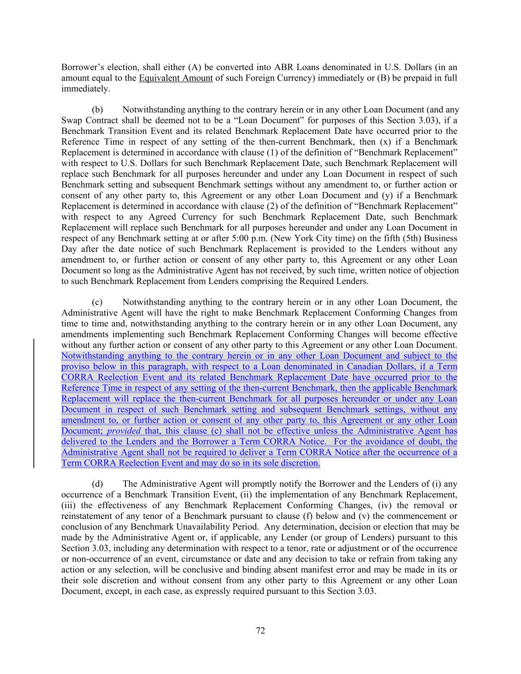 Borrower’s election, shall either (A) be converted into ABR Loans denominated in U.S. Dollars (in an amount equal to the Equivalent Amount of such Foreign Currency) immediately or (B) be prepaid in full immediately. (b) Notwithstanding anything to the contrary herein or in any other Loan Document (and any Swap Contract shall be deemed not to be a “Loan Document” for purposes of this Section 3.03), if a Benchmark Transition Event and its related Benchmark Replacement Date have occurred prior to the Reference Time in respect of any setting of the then-current Benchmark, then (x) if a Benchmark Replacement is determined in accordance with clause (1) of the definition of “Benchmark Replacement” with respect to U.S. Dollars for such Benchmark Replacement Date, such Benchmark Replacement will replace such Benchmark for all purposes hereunder and under any Loan Document in respect of such Benchmark setting and subsequent Benchmark settings without any amendment to, or further action or consent of any other party to, this Agreement or any other Loan Document and (y) if a Benchmark Replacement is determined in accordance with clause (2) of the definition of “Benchmark Replacement” with respect to any Agreed Currency for such Benchmark Replacement Date, such Benchmark Replacement will replace such Benchmark for all purposes hereunder and under any Loan Document in respect of any Benchmark setting at or after 5:00 p.m. (New York City time) on the fifth (5th) Business Day after the date notice of such Benchmark Replacement is provided to the Lenders without any amendment to, or further action or consent of any other party to, this Agreement or any other Loan Document so long as the Administrative Agent has not received, by such time, written notice of objection to such Benchmark Replacement from Lenders comprising the Required Lenders. (c) Notwithstanding anything to the contrary herein or in any other Loan Document, the Administrative Agent will have the right to make Benchmark Replacement Conforming Changes from time to time and, notwithstanding anything to the contrary herein or in any other Loan Document, any amendments implementing such Benchmark Replacement Conforming Changes will become effective without any further action or consent of any other party to this Agreement or any other Loan Document. Notwithstanding anything to the contrary herein or in any other Loan Document and subject to the proviso below in this paragraph, with respect to a Loan denominated in Canadian Dollars, if a Term CORRA Reelection Event and its related Benchmark Replacement Date have occurred prior to the Reference Time in respect of any setting of the then-current Benchmark, then the applicable Benchmark Replacement will replace the then-current Benchmark for all purposes hereunder or under any Loan Document in respect of such Benchmark setting and subsequent Benchmark settings, without any amendment to, or further action or consent of any other party to, this Agreement or any other Loan Document; provided that, this clause (c) shall not be effective unless the Administrative Agent has delivered to the Lenders and the Borrower a Term CORRA Notice. For the avoidance of doubt, the Administrative Agent shall not be required to deliver a Term CORRA Notice after the occurrence of a Term CORRA Reelection Event and may do so in its sole discretion. (d) The Administrative Agent will promptly notify the Borrower and the Lenders of (i) any occurrence of a Benchmark Transition Event, (ii) the implementation of any Benchmark Replacement, (iii) the effectiveness of any Benchmark Replacement Conforming Changes, (iv) the removal or reinstatement of any tenor of a Benchmark pursuant to clause (f) below and (v) the commencement or conclusion of any Benchmark Unavailability Period. Any determination, decision or election that may be made by the Administrative Agent or, if applicable, any Lender (or group of Lenders) pursuant to this Section 3.03, including any determination with respect to a tenor, rate or adjustment or of the occurrence or non-occurrence of an event, circumstance or date and any decision to take or refrain from taking any action or any selection, will be conclusive and binding absent manifest error and may be made in its or their sole discretion and without consent from any other party to this Agreement or any other Loan Document, except, in each case, as expressly required pursuant to this Section 3.03. 72