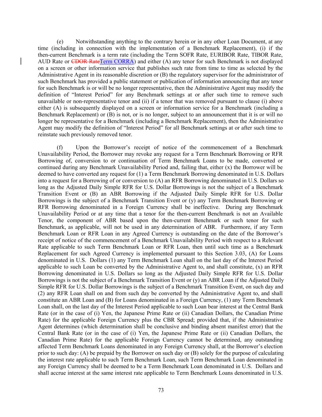 (e) Notwithstanding anything to the contrary herein or in any other Loan Document, at any time (including in connection with the implementation of a Benchmark Replacement), (i) if the then-current Benchmark is a term rate (including the Term SOFR Rate, EURIBOR Rate, TIBOR Rate, AUD Rate or CDOR RateTerm CORRA) and either (A) any tenor for such Benchmark is not displayed on a screen or other information service that publishes such rate from time to time as selected by the Administrative Agent in its reasonable discretion or (B) the regulatory supervisor for the administrator of such Benchmark has provided a public statement or publication of information announcing that any tenor for such Benchmark is or will be no longer representative, then the Administrative Agent may modify the definition of “Interest Period” for any Benchmark settings at or after such time to remove such unavailable or non-representative tenor and (ii) if a tenor that was removed pursuant to clause (i) above either (A) is subsequently displayed on a screen or information service for a Benchmark (including a Benchmark Replacement) or (B) is not, or is no longer, subject to an announcement that it is or will no longer be representative for a Benchmark (including a Benchmark Replacement), then the Administrative Agent may modify the definition of “Interest Period” for all Benchmark settings at or after such time to reinstate such previously removed tenor. (f) Upon the Borrower’s receipt of notice of the commencement of a Benchmark Unavailability Period, the Borrower may revoke any request for a Term Benchmark Borrowing or RFR Borrowing of, conversion to or continuation of Term Benchmark Loans to be made, converted or continued during any Benchmark Unavailability Period and, failing that, either (x) the Borrower will be deemed to have converted any request for (1) a Term Benchmark Borrowing denominated in U.S. Dollars into a request for a Borrowing of or conversion to (A) an RFR Borrowing denominated in U.S. Dollars so long as the Adjusted Daily Simple RFR for U.S. Dollar Borrowings is not the subject of a Benchmark Transition Event or (B) an ABR Borrowing if the Adjusted Daily Simple RFR for U.S. Dollar Borrowings is the subject of a Benchmark Transition Event or (y) any Term Benchmark Borrowing or RFR Borrowing denominated in a Foreign Currency shall be ineffective. During any Benchmark Unavailability Period or at any time that a tenor for the then-current Benchmark is not an Available Tenor, the component of ABR based upon the then-current Benchmark or such tenor for such Benchmark, as applicable, will not be used in any determination of ABR. Furthermore, if any Term Benchmark Loan or RFR Loan in any Agreed Currency is outstanding on the date of the Borrower’s receipt of notice of the commencement of a Benchmark Unavailability Period with respect to a Relevant Rate applicable to such Term Benchmark Loan or RFR Loan, then until such time as a Benchmark Replacement for such Agreed Currency is implemented pursuant to this Section 3.03, (A) for Loans denominated in U.S. Dollars (1) any Term Benchmark Loan shall on the last day of the Interest Period applicable to such Loan be converted by the Administrative Agent to, and shall constitute, (x) an RFR Borrowing denominated in U.S. Dollars so long as the Adjusted Daily Simple RFR for U.S. Dollar Borrowings is not the subject of a Benchmark Transition Event or (y) an ABR Loan if the Adjusted Daily Simple RFR for U.S. Dollar Borrowings is the subject of a Benchmark Transition Event, on such day and (2) any RFR Loan shall on and from such day be converted by the Administrative Agent to, and shall constitute an ABR Loan and (B) for Loans denominated in a Foreign Currency, (1) any Term Benchmark Loan shall, on the last day of the Interest Period applicable to such Loan bear interest at the Central Bank Rate (or in the case of (i) Yen, the Japanese Prime Rate or (ii) Canadian Dollars, the Canadian Prime Rate) for the applicable Foreign Currency plus the CBR Spread; provided that, if the Administrative Agent determines (which determination shall be conclusive and binding absent manifest error) that the Central Bank Rate (or in the case of (i) Yen, the Japanese Prime Rate or (ii) Canadian Dollars, the Canadian Prime Rate) for the applicable Foreign Currency cannot be determined, any outstanding affected Term Benchmark Loans denominated in any Foreign Currency shall, at the Borrower’s election prior to such day: (A) be prepaid by the Borrower on such day or (B) solely for the purpose of calculating the interest rate applicable to such Term Benchmark Loan, such Term Benchmark Loan denominated in any Foreign Currency shall be deemed to be a Term Benchmark Loan denominated in U.S. Dollars and shall accrue interest at the same interest rate applicable to Term Benchmark Loans denominated in U.S. 73