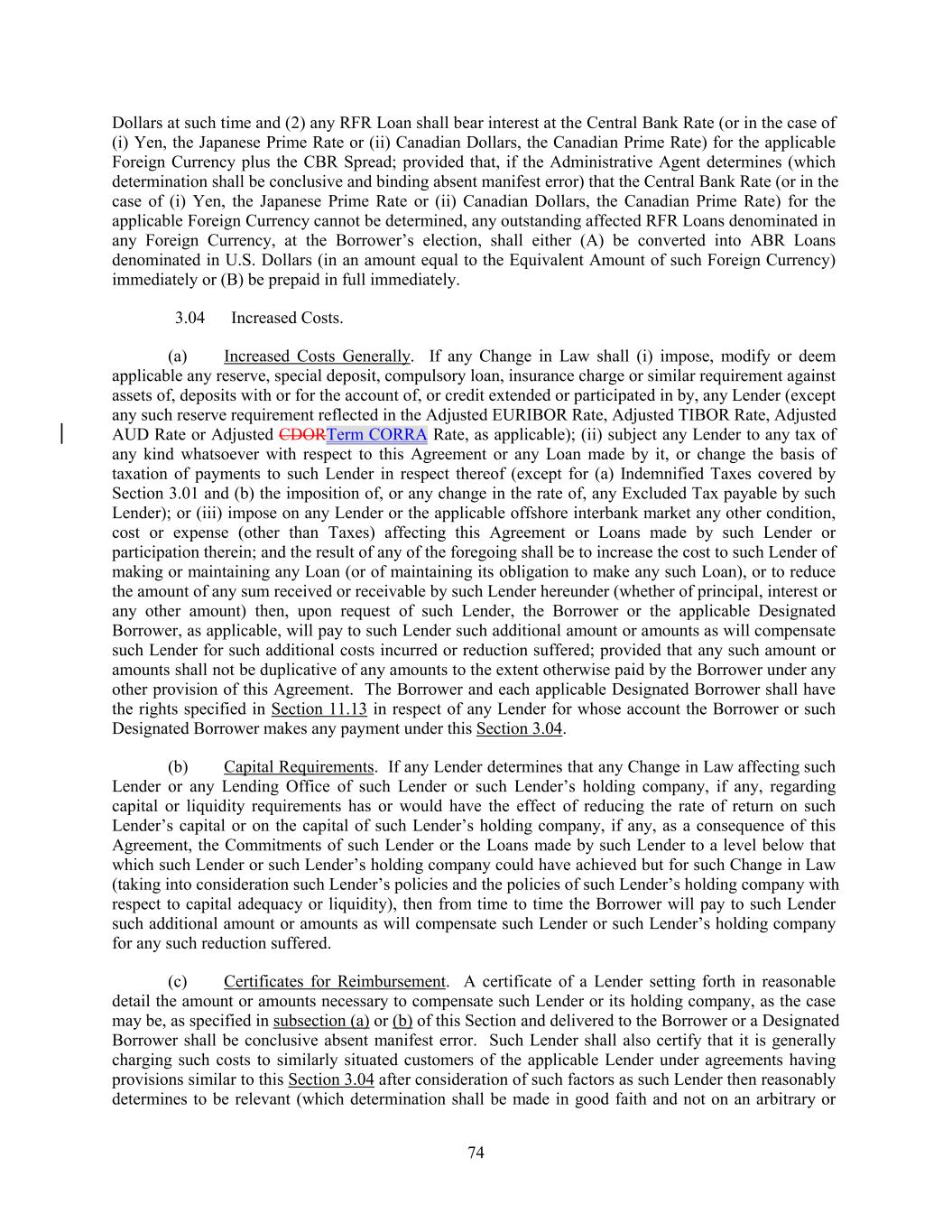 Dollars at such time and (2) any RFR Loan shall bear interest at the Central Bank Rate (or in the case of (i) Yen, the Japanese Prime Rate or (ii) Canadian Dollars, the Canadian Prime Rate) for the applicable Foreign Currency plus the CBR Spread; provided that, if the Administrative Agent determines (which determination shall be conclusive and binding absent manifest error) that the Central Bank Rate (or in the case of (i) Yen, the Japanese Prime Rate or (ii) Canadian Dollars, the Canadian Prime Rate) for the applicable Foreign Currency cannot be determined, any outstanding affected RFR Loans denominated in any Foreign Currency, at the Borrower’s election, shall either (A) be converted into ABR Loans denominated in U.S. Dollars (in an amount equal to the Equivalent Amount of such Foreign Currency) immediately or (B) be prepaid in full immediately. 3.04 Increased Costs. (a) Increased Costs Generally. If any Change in Law shall (i) impose, modify or deem applicable any reserve, special deposit, compulsory loan, insurance charge or similar requirement against assets of, deposits with or for the account of, or credit extended or participated in by, any Lender (except any such reserve requirement reflected in the Adjusted EURIBOR Rate, Adjusted TIBOR Rate, Adjusted AUD Rate or Adjusted CDORTerm CORRA Rate, as applicable); (ii) subject any Lender to any tax of any kind whatsoever with respect to this Agreement or any Loan made by it, or change the basis of taxation of payments to such Lender in respect thereof (except for (a) Indemnified Taxes covered by Section 3.01 and (b) the imposition of, or any change in the rate of, any Excluded Tax payable by such Lender); or (iii) impose on any Lender or the applicable offshore interbank market any other condition, cost or expense (other than Taxes) affecting this Agreement or Loans made by such Lender or participation therein; and the result of any of the foregoing shall be to increase the cost to such Lender of making or maintaining any Loan (or of maintaining its obligation to make any such Loan), or to reduce the amount of any sum received or receivable by such Lender hereunder (whether of principal, interest or any other amount) then, upon request of such Lender, the Borrower or the applicable Designated Borrower, as applicable, will pay to such Lender such additional amount or amounts as will compensate such Lender for such additional costs incurred or reduction suffered; provided that any such amount or amounts shall not be duplicative of any amounts to the extent otherwise paid by the Borrower under any other provision of this Agreement. The Borrower and each applicable Designated Borrower shall have the rights specified in Section 11.13 in respect of any Lender for whose account the Borrower or such Designated Borrower makes any payment under this Section 3.04. (b) Capital Requirements. If any Lender determines that any Change in Law affecting such Lender or any Lending Office of such Lender or such Lender’s holding company, if any, regarding capital or liquidity requirements has or would have the effect of reducing the rate of return on such Lender’s capital or on the capital of such Lender’s holding company, if any, as a consequence of this Agreement, the Commitments of such Lender or the Loans made by such Lender to a level below that which such Lender or such Lender’s holding company could have achieved but for such Change in Law (taking into consideration such Lender’s policies and the policies of such Lender’s holding company with respect to capital adequacy or liquidity), then from time to time the Borrower will pay to such Lender such additional amount or amounts as will compensate such Lender or such Lender’s holding company for any such reduction suffered. (c) Certificates for Reimbursement. A certificate of a Lender setting forth in reasonable detail the amount or amounts necessary to compensate such Lender or its holding company, as the case may be, as specified in subsection (a) or (b) of this Section and delivered to the Borrower or a Designated Borrower shall be conclusive absent manifest error. Such Lender shall also certify that it is generally charging such costs to similarly situated customers of the applicable Lender under agreements having provisions similar to this Section 3.04 after consideration of such factors as such Lender then reasonably determines to be relevant (which determination shall be made in good faith and not on an arbitrary or 74