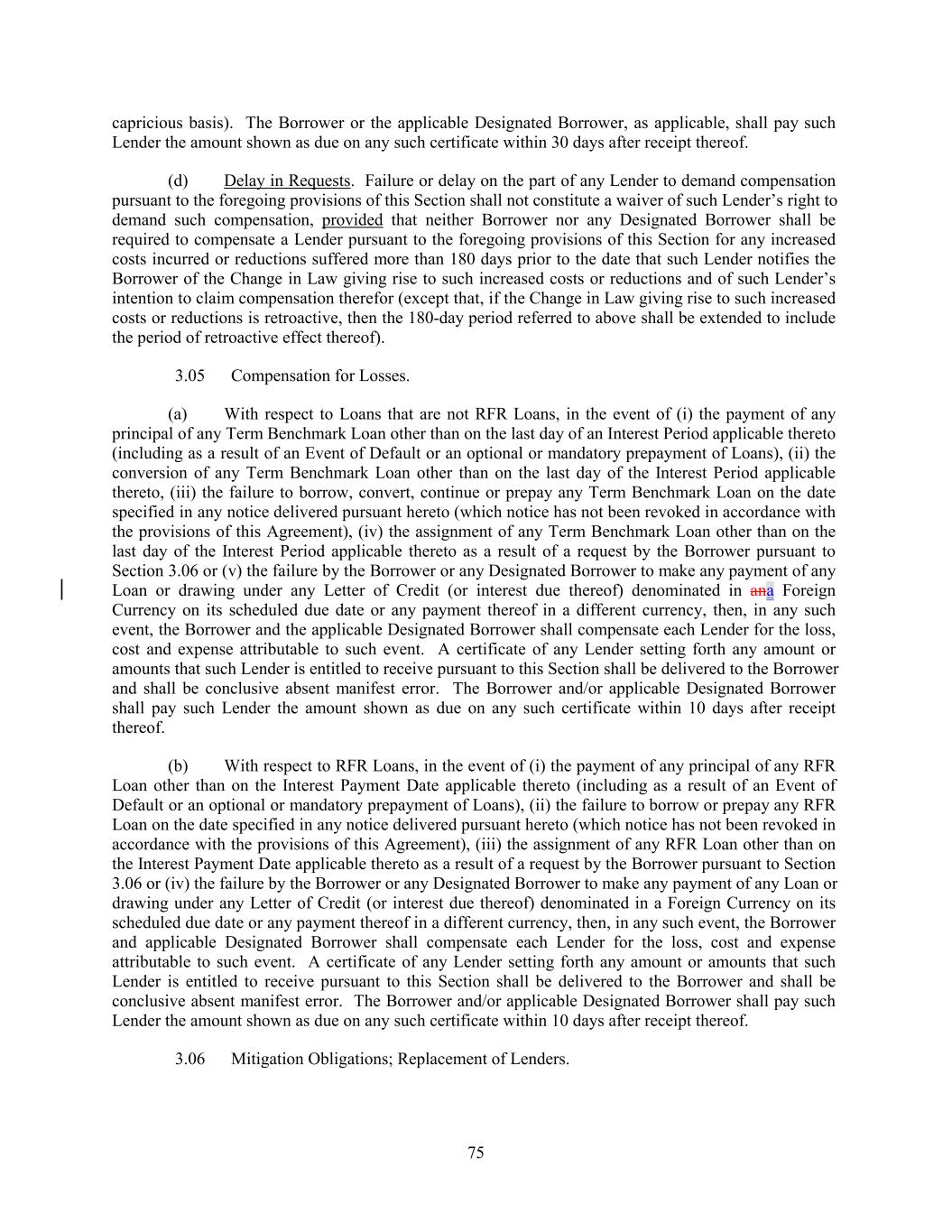 capricious basis). The Borrower or the applicable Designated Borrower, as applicable, shall pay such Lender the amount shown as due on any such certificate within 30 days after receipt thereof. (d) Delay in Requests. Failure or delay on the part of any Lender to demand compensation pursuant to the foregoing provisions of this Section shall not constitute a waiver of such Lender’s right to demand such compensation, provided that neither Borrower nor any Designated Borrower shall be required to compensate a Lender pursuant to the foregoing provisions of this Section for any increased costs incurred or reductions suffered more than 180 days prior to the date that such Lender notifies the Borrower of the Change in Law giving rise to such increased costs or reductions and of such Lender’s intention to claim compensation therefor (except that, if the Change in Law giving rise to such increased costs or reductions is retroactive, then the 180-day period referred to above shall be extended to include the period of retroactive effect thereof). 3.05 Compensation for Losses. (a) With respect to Loans that are not RFR Loans, in the event of (i) the payment of any principal of any Term Benchmark Loan other than on the last day of an Interest Period applicable thereto (including as a result of an Event of Default or an optional or mandatory prepayment of Loans), (ii) the conversion of any Term Benchmark Loan other than on the last day of the Interest Period applicable thereto, (iii) the failure to borrow, convert, continue or prepay any Term Benchmark Loan on the date specified in any notice delivered pursuant hereto (which notice has not been revoked in accordance with the provisions of this Agreement), (iv) the assignment of any Term Benchmark Loan other than on the last day of the Interest Period applicable thereto as a result of a request by the Borrower pursuant to Section 3.06 or (v) the failure by the Borrower or any Designated Borrower to make any payment of any Loan or drawing under any Letter of Credit (or interest due thereof) denominated in ana Foreign Currency on its scheduled due date or any payment thereof in a different currency, then, in any such event, the Borrower and the applicable Designated Borrower shall compensate each Lender for the loss, cost and expense attributable to such event. A certificate of any Lender setting forth any amount or amounts that such Lender is entitled to receive pursuant to this Section shall be delivered to the Borrower and shall be conclusive absent manifest error. The Borrower and/or applicable Designated Borrower shall pay such Lender the amount shown as due on any such certificate within 10 days after receipt thereof. (b) With respect to RFR Loans, in the event of (i) the payment of any principal of any RFR Loan other than on the Interest Payment Date applicable thereto (including as a result of an Event of Default or an optional or mandatory prepayment of Loans), (ii) the failure to borrow or prepay any RFR Loan on the date specified in any notice delivered pursuant hereto (which notice has not been revoked in accordance with the provisions of this Agreement), (iii) the assignment of any RFR Loan other than on the Interest Payment Date applicable thereto as a result of a request by the Borrower pursuant to Section 3.06 or (iv) the failure by the Borrower or any Designated Borrower to make any payment of any Loan or drawing under any Letter of Credit (or interest due thereof) denominated in a Foreign Currency on its scheduled due date or any payment thereof in a different currency, then, in any such event, the Borrower and applicable Designated Borrower shall compensate each Lender for the loss, cost and expense attributable to such event. A certificate of any Lender setting forth any amount or amounts that such Lender is entitled to receive pursuant to this Section shall be delivered to the Borrower and shall be conclusive absent manifest error. The Borrower and/or applicable Designated Borrower shall pay such Lender the amount shown as due on any such certificate within 10 days after receipt thereof. 3.06 Mitigation Obligations; Replacement of Lenders. 75