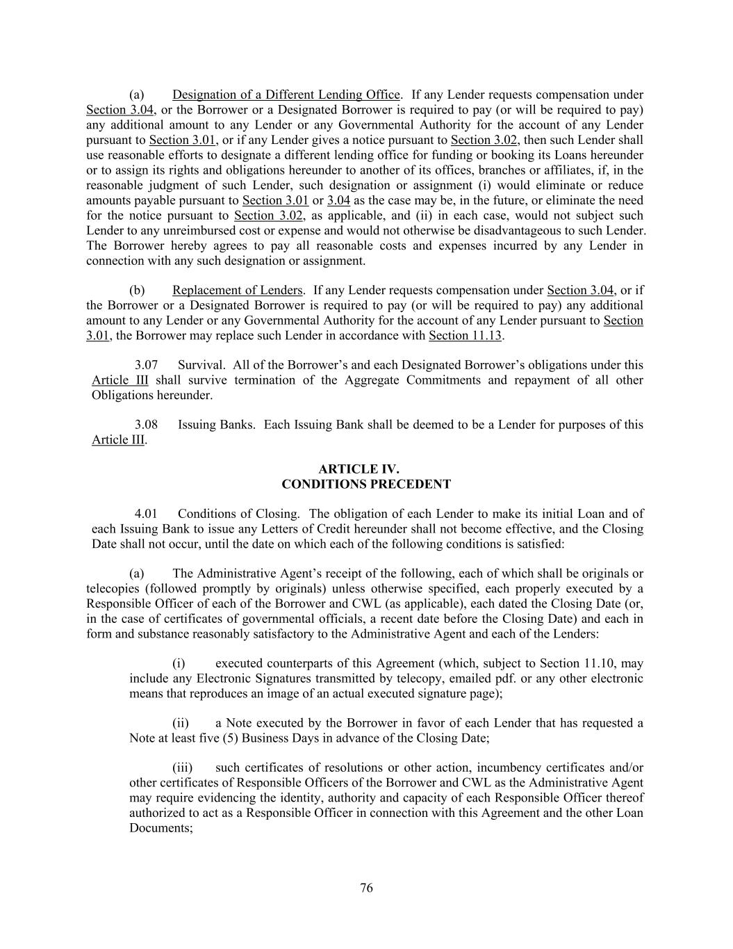 (a) Designation of a Different Lending Office. If any Lender requests compensation under Section 3.04, or the Borrower or a Designated Borrower is required to pay (or will be required to pay) any additional amount to any Lender or any Governmental Authority for the account of any Lender pursuant to Section 3.01, or if any Lender gives a notice pursuant to Section 3.02, then such Lender shall use reasonable efforts to designate a different lending office for funding or booking its Loans hereunder or to assign its rights and obligations hereunder to another of its offices, branches or affiliates, if, in the reasonable judgment of such Lender, such designation or assignment (i) would eliminate or reduce amounts payable pursuant to Section 3.01 or 3.04 as the case may be, in the future, or eliminate the need for the notice pursuant to Section 3.02, as applicable, and (ii) in each case, would not subject such Lender to any unreimbursed cost or expense and would not otherwise be disadvantageous to such Lender. The Borrower hereby agrees to pay all reasonable costs and expenses incurred by any Lender in connection with any such designation or assignment. (b) Replacement of Lenders. If any Lender requests compensation under Section 3.04, or if the Borrower or a Designated Borrower is required to pay (or will be required to pay) any additional amount to any Lender or any Governmental Authority for the account of any Lender pursuant to Section 3.01, the Borrower may replace such Lender in accordance with Section 11.13. 3.07 Survival. All of the Borrower’s and each Designated Borrower’s obligations under this Article III shall survive termination of the Aggregate Commitments and repayment of all other Obligations hereunder. 3.08 Issuing Banks. Each Issuing Bank shall be deemed to be a Lender for purposes of this Article III. ARTICLE IV. CONDITIONS PRECEDENT 4.01 Conditions of Closing. The obligation of each Lender to make its initial Loan and of each Issuing Bank to issue any Letters of Credit hereunder shall not become effective, and the Closing Date shall not occur, until the date on which each of the following conditions is satisfied: (a) The Administrative Agent’s receipt of the following, each of which shall be originals or telecopies (followed promptly by originals) unless otherwise specified, each properly executed by a Responsible Officer of each of the Borrower and CWL (as applicable), each dated the Closing Date (or, in the case of certificates of governmental officials, a recent date before the Closing Date) and each in form and substance reasonably satisfactory to the Administrative Agent and each of the Lenders: (i) executed counterparts of this Agreement (which, subject to Section 11.10, may include any Electronic Signatures transmitted by telecopy, emailed pdf. or any other electronic means that reproduces an image of an actual executed signature page); (ii) a Note executed by the Borrower in favor of each Lender that has requested a Note at least five (5) Business Days in advance of the Closing Date; (iii) such certificates of resolutions or other action, incumbency certificates and/or other certificates of Responsible Officers of the Borrower and CWL as the Administrative Agent may require evidencing the identity, authority and capacity of each Responsible Officer thereof authorized to act as a Responsible Officer in connection with this Agreement and the other Loan Documents; 76