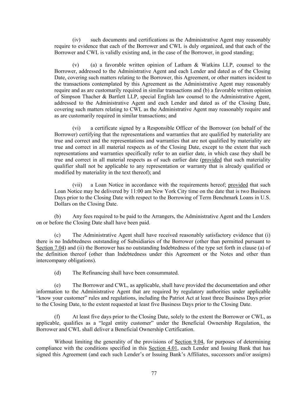 (iv) such documents and certifications as the Administrative Agent may reasonably require to evidence that each of the Borrower and CWL is duly organized, and that each of the Borrower and CWL is validly existing and, in the case of the Borrower, in good standing; (v) (a) a favorable written opinion of Latham & Watkins LLP, counsel to the Borrower, addressed to the Administrative Agent and each Lender and dated as of the Closing Date, covering such matters relating to the Borrower, this Agreement, or other matters incident to the transactions contemplated by this Agreement as the Administrative Agent may reasonably require and as are customarily required in similar transactions and (b) a favorable written opinion of Simpson Thacher & Bartlett LLP, special English law counsel to the Administrative Agent, addressed to the Administrative Agent and each Lender and dated as of the Closing Date, covering such matters relating to CWL as the Administrative Agent may reasonably require and as are customarily required in similar transactions; and (vi) a certificate signed by a Responsible Officer of the Borrower (on behalf of the Borrower) certifying that the representations and warranties that are qualified by materiality are true and correct and the representations and warranties that are not qualified by materiality are true and correct in all material respects as of the Closing Date, except to the extent that such representations and warranties specifically refer to an earlier date, in which case they shall be true and correct in all material respects as of such earlier date (provided that such materiality qualifier shall not be applicable to any representation or warranty that is already qualified or modified by materiality in the text thereof); and (vii) a Loan Notice in accordance with the requirements hereof; provided that such Loan Notice may be delivered by 11:00 am New York City time on the date that is two Business Days prior to the Closing Date with respect to the Borrowing of Term Benchmark Loans in U.S. Dollars on the Closing Date. (b) Any fees required to be paid to the Arrangers, the Administrative Agent and the Lenders on or before the Closing Date shall have been paid. (c) The Administrative Agent shall have received reasonably satisfactory evidence that (i) there is no Indebtedness outstanding of Subsidiaries of the Borrower (other than permitted pursuant to Section 7.04) and (ii) the Borrower has no outstanding Indebtedness of the type set forth in clause (a) of the definition thereof (other than Indebtedness under this Agreement or the Notes and other than intercompany obligations). (d) The Refinancing shall have been consummated. (e) The Borrower and CWL, as applicable, shall have provided the documentation and other information to the Administrative Agent that are required by regulatory authorities under applicable “know your customer” rules and regulations, including the Patriot Act at least three Business Days prior to the Closing Date, to the extent requested at least five Business Days prior to the Closing Date. (f) At least five days prior to the Closing Date, solely to the extent the Borrower or CWL, as applicable, qualifies as a “legal entity customer” under the Beneficial Ownership Regulation, the Borrower and CWL shall deliver a Beneficial Ownership Certification. Without limiting the generality of the provisions of Section 9.04, for purposes of determining compliance with the conditions specified in this Section 4.01, each Lender and Issuing Bank that has signed this Agreement (and each such Lender’s or Issuing Bank’s Affiliates, successors and/or assigns) 77