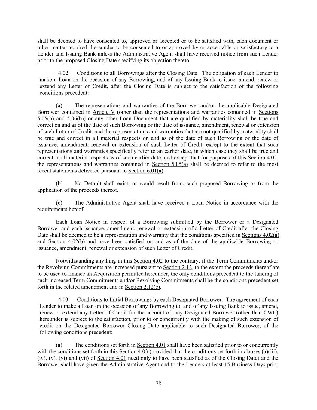 shall be deemed to have consented to, approved or accepted or to be satisfied with, each document or other matter required thereunder to be consented to or approved by or acceptable or satisfactory to a Lender and Issuing Bank unless the Administrative Agent shall have received notice from such Lender prior to the proposed Closing Date specifying its objection thereto. 4.02 Conditions to all Borrowings after the Closing Date. The obligation of each Lender to make a Loan on the occasion of any Borrowing, and of any Issuing Bank to issue, amend, renew or extend any Letter of Credit, after the Closing Date is subject to the satisfaction of the following conditions precedent: (a) The representations and warranties of the Borrower and/or the applicable Designated Borrower contained in Article V (other than the representations and warranties contained in Sections 5.05(b) and 5.06(b)) or any other Loan Document that are qualified by materiality shall be true and correct on and as of the date of such Borrowing or the date of issuance, amendment, renewal or extension of such Letter of Credit, and the representations and warranties that are not qualified by materiality shall be true and correct in all material respects on and as of the date of such Borrowing or the date of issuance, amendment, renewal or extension of such Letter of Credit, except to the extent that such representations and warranties specifically refer to an earlier date, in which case they shall be true and correct in all material respects as of such earlier date, and except that for purposes of this Section 4.02, the representations and warranties contained in Section 5.05(a) shall be deemed to refer to the most recent statements delivered pursuant to Section 6.01(a). (b) No Default shall exist, or would result from, such proposed Borrowing or from the application of the proceeds thereof. (c) The Administrative Agent shall have received a Loan Notice in accordance with the requirements hereof. Each Loan Notice in respect of a Borrowing submitted by the Borrower or a Designated Borrower and each issuance, amendment, renewal or extension of a Letter of Credit after the Closing Date shall be deemed to be a representation and warranty that the conditions specified in Sections 4.02(a) and Section 4.02(b) and have been satisfied on and as of the date of the applicable Borrowing or issuance, amendment, renewal or extension of such Letter of Credit. Notwithstanding anything in this Section 4.02 to the contrary, if the Term Commitments and/or the Revolving Commitments are increased pursuant to Section 2.12, to the extent the proceeds thereof are to be used to finance an Acquisition permitted hereunder, the only conditions precedent to the funding of such increased Term Commitments and/or Revolving Commitments shall be the conditions precedent set forth in the related amendment and in Section 2.12(e). 4.03 Conditions to Initial Borrowings by each Designated Borrower. The agreement of each Lender to make a Loan on the occasion of any Borrowing to, and of any Issuing Bank to issue, amend, renew or extend any Letter of Credit for the account of, any Designated Borrower (other than CWL) hereunder is subject to the satisfaction, prior to or concurrently with the making of such extension of credit on the Designated Borrower Closing Date applicable to such Designated Borrower, of the following conditions precedent: (a) The conditions set forth in Section 4.01 shall have been satisfied prior to or concurrently with the conditions set forth in this Section 4.03 (provided that the conditions set forth in clauses (a)(iii), (iv), (v), (vi) and (vii) of Section 4.01 need only to have been satisfied as of the Closing Date) and the Borrower shall have given the Administrative Agent and to the Lenders at least 15 Business Days prior 78