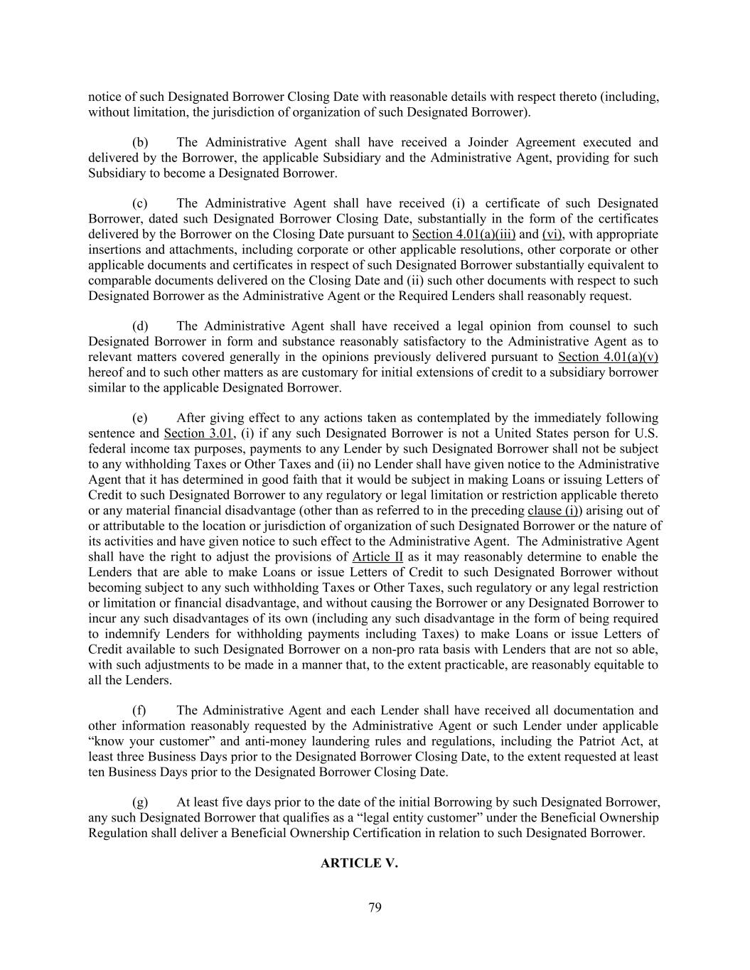 notice of such Designated Borrower Closing Date with reasonable details with respect thereto (including, without limitation, the jurisdiction of organization of such Designated Borrower). (b) The Administrative Agent shall have received a Joinder Agreement executed and delivered by the Borrower, the applicable Subsidiary and the Administrative Agent, providing for such Subsidiary to become a Designated Borrower. (c) The Administrative Agent shall have received (i) a certificate of such Designated Borrower, dated such Designated Borrower Closing Date, substantially in the form of the certificates delivered by the Borrower on the Closing Date pursuant to Section 4.01(a)(iii) and (vi), with appropriate insertions and attachments, including corporate or other applicable resolutions, other corporate or other applicable documents and certificates in respect of such Designated Borrower substantially equivalent to comparable documents delivered on the Closing Date and (ii) such other documents with respect to such Designated Borrower as the Administrative Agent or the Required Lenders shall reasonably request. (d) The Administrative Agent shall have received a legal opinion from counsel to such Designated Borrower in form and substance reasonably satisfactory to the Administrative Agent as to relevant matters covered generally in the opinions previously delivered pursuant to Section 4.01(a)(v) hereof and to such other matters as are customary for initial extensions of credit to a subsidiary borrower similar to the applicable Designated Borrower. (e) After giving effect to any actions taken as contemplated by the immediately following sentence and Section 3.01, (i) if any such Designated Borrower is not a United States person for U.S. federal income tax purposes, payments to any Lender by such Designated Borrower shall not be subject to any withholding Taxes or Other Taxes and (ii) no Lender shall have given notice to the Administrative Agent that it has determined in good faith that it would be subject in making Loans or issuing Letters of Credit to such Designated Borrower to any regulatory or legal limitation or restriction applicable thereto or any material financial disadvantage (other than as referred to in the preceding clause (i)) arising out of or attributable to the location or jurisdiction of organization of such Designated Borrower or the nature of its activities and have given notice to such effect to the Administrative Agent. The Administrative Agent shall have the right to adjust the provisions of Article II as it may reasonably determine to enable the Lenders that are able to make Loans or issue Letters of Credit to such Designated Borrower without becoming subject to any such withholding Taxes or Other Taxes, such regulatory or any legal restriction or limitation or financial disadvantage, and without causing the Borrower or any Designated Borrower to incur any such disadvantages of its own (including any such disadvantage in the form of being required to indemnify Lenders for withholding payments including Taxes) to make Loans or issue Letters of Credit available to such Designated Borrower on a non-pro rata basis with Lenders that are not so able, with such adjustments to be made in a manner that, to the extent practicable, are reasonably equitable to all the Lenders. (f) The Administrative Agent and each Lender shall have received all documentation and other information reasonably requested by the Administrative Agent or such Lender under applicable “know your customer” and anti-money laundering rules and regulations, including the Patriot Act, at least three Business Days prior to the Designated Borrower Closing Date, to the extent requested at least ten Business Days prior to the Designated Borrower Closing Date. (g) At least five days prior to the date of the initial Borrowing by such Designated Borrower, any such Designated Borrower that qualifies as a “legal entity customer” under the Beneficial Ownership Regulation shall deliver a Beneficial Ownership Certification in relation to such Designated Borrower. ARTICLE V. 79