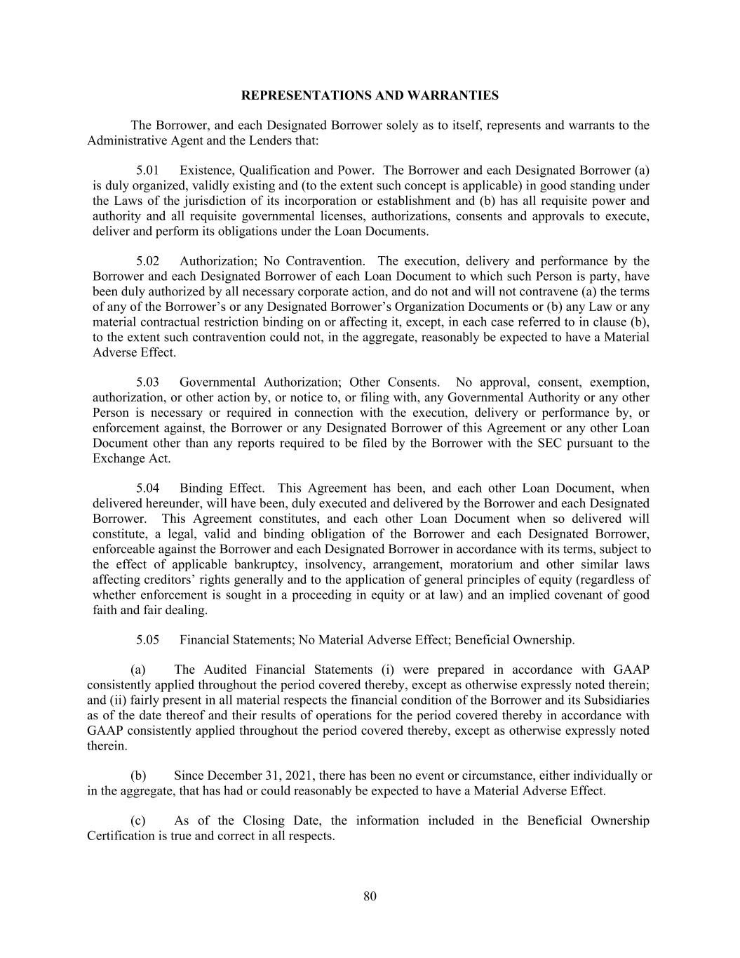 REPRESENTATIONS AND WARRANTIES The Borrower, and each Designated Borrower solely as to itself, represents and warrants to the Administrative Agent and the Lenders that: 5.01 Existence, Qualification and Power. The Borrower and each Designated Borrower (a) is duly organized, validly existing and (to the extent such concept is applicable) in good standing under the Laws of the jurisdiction of its incorporation or establishment and (b) has all requisite power and authority and all requisite governmental licenses, authorizations, consents and approvals to execute, deliver and perform its obligations under the Loan Documents. 5.02 Authorization; No Contravention. The execution, delivery and performance by the Borrower and each Designated Borrower of each Loan Document to which such Person is party, have been duly authorized by all necessary corporate action, and do not and will not contravene (a) the terms of any of the Borrower’s or any Designated Borrower’s Organization Documents or (b) any Law or any material contractual restriction binding on or affecting it, except, in each case referred to in clause (b), to the extent such contravention could not, in the aggregate, reasonably be expected to have a Material Adverse Effect. 5.03 Governmental Authorization; Other Consents. No approval, consent, exemption, authorization, or other action by, or notice to, or filing with, any Governmental Authority or any other Person is necessary or required in connection with the execution, delivery or performance by, or enforcement against, the Borrower or any Designated Borrower of this Agreement or any other Loan Document other than any reports required to be filed by the Borrower with the SEC pursuant to the Exchange Act. 5.04 Binding Effect. This Agreement has been, and each other Loan Document, when delivered hereunder, will have been, duly executed and delivered by the Borrower and each Designated Borrower. This Agreement constitutes, and each other Loan Document when so delivered will constitute, a legal, valid and binding obligation of the Borrower and each Designated Borrower, enforceable against the Borrower and each Designated Borrower in accordance with its terms, subject to the effect of applicable bankruptcy, insolvency, arrangement, moratorium and other similar laws affecting creditors’ rights generally and to the application of general principles of equity (regardless of whether enforcement is sought in a proceeding in equity or at law) and an implied covenant of good faith and fair dealing. 5.05 Financial Statements; No Material Adverse Effect; Beneficial Ownership. (a) The Audited Financial Statements (i) were prepared in accordance with GAAP consistently applied throughout the period covered thereby, except as otherwise expressly noted therein; and (ii) fairly present in all material respects the financial condition of the Borrower and its Subsidiaries as of the date thereof and their results of operations for the period covered thereby in accordance with GAAP consistently applied throughout the period covered thereby, except as otherwise expressly noted therein. (b) Since December 31, 2021, there has been no event or circumstance, either individually or in the aggregate, that has had or could reasonably be expected to have a Material Adverse Effect. (c) As of the Closing Date, the information included in the Beneficial Ownership Certification is true and correct in all respects. 80