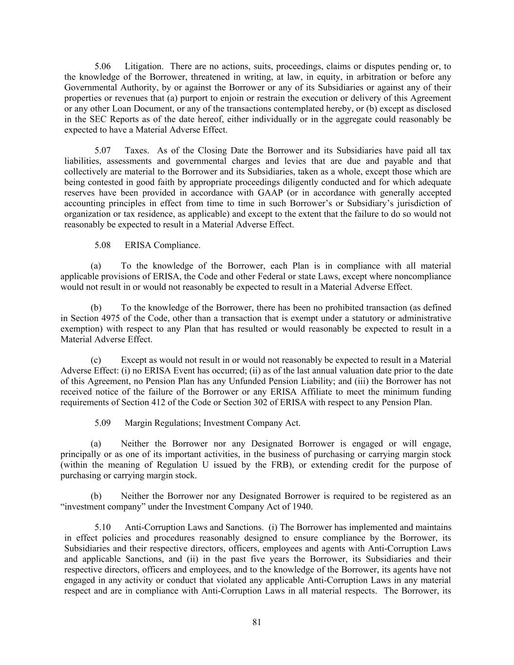 5.06 Litigation. There are no actions, suits, proceedings, claims or disputes pending or, to the knowledge of the Borrower, threatened in writing, at law, in equity, in arbitration or before any Governmental Authority, by or against the Borrower or any of its Subsidiaries or against any of their properties or revenues that (a) purport to enjoin or restrain the execution or delivery of this Agreement or any other Loan Document, or any of the transactions contemplated hereby, or (b) except as disclosed in the SEC Reports as of the date hereof, either individually or in the aggregate could reasonably be expected to have a Material Adverse Effect. 5.07 Taxes. As of the Closing Date the Borrower and its Subsidiaries have paid all tax liabilities, assessments and governmental charges and levies that are due and payable and that collectively are material to the Borrower and its Subsidiaries, taken as a whole, except those which are being contested in good faith by appropriate proceedings diligently conducted and for which adequate reserves have been provided in accordance with GAAP (or in accordance with generally accepted accounting principles in effect from time to time in such Borrower’s or Subsidiary’s jurisdiction of organization or tax residence, as applicable) and except to the extent that the failure to do so would not reasonably be expected to result in a Material Adverse Effect. 5.08 ERISA Compliance. (a) To the knowledge of the Borrower, each Plan is in compliance with all material applicable provisions of ERISA, the Code and other Federal or state Laws, except where noncompliance would not result in or would not reasonably be expected to result in a Material Adverse Effect. (b) To the knowledge of the Borrower, there has been no prohibited transaction (as defined in Section 4975 of the Code, other than a transaction that is exempt under a statutory or administrative exemption) with respect to any Plan that has resulted or would reasonably be expected to result in a Material Adverse Effect. (c) Except as would not result in or would not reasonably be expected to result in a Material Adverse Effect: (i) no ERISA Event has occurred; (ii) as of the last annual valuation date prior to the date of this Agreement, no Pension Plan has any Unfunded Pension Liability; and (iii) the Borrower has not received notice of the failure of the Borrower or any ERISA Affiliate to meet the minimum funding requirements of Section 412 of the Code or Section 302 of ERISA with respect to any Pension Plan. 5.09 Margin Regulations; Investment Company Act. (a) Neither the Borrower nor any Designated Borrower is engaged or will engage, principally or as one of its important activities, in the business of purchasing or carrying margin stock (within the meaning of Regulation U issued by the FRB), or extending credit for the purpose of purchasing or carrying margin stock. (b) Neither the Borrower nor any Designated Borrower is required to be registered as an “investment company” under the Investment Company Act of 1940. 5.10 Anti-Corruption Laws and Sanctions. (i) The Borrower has implemented and maintains in effect policies and procedures reasonably designed to ensure compliance by the Borrower, its Subsidiaries and their respective directors, officers, employees and agents with Anti-Corruption Laws and applicable Sanctions, and (ii) in the past five years the Borrower, its Subsidiaries and their respective directors, officers and employees, and to the knowledge of the Borrower, its agents have not engaged in any activity or conduct that violated any applicable Anti-Corruption Laws in any material respect and are in compliance with Anti-Corruption Laws in all material respects. The Borrower, its 81