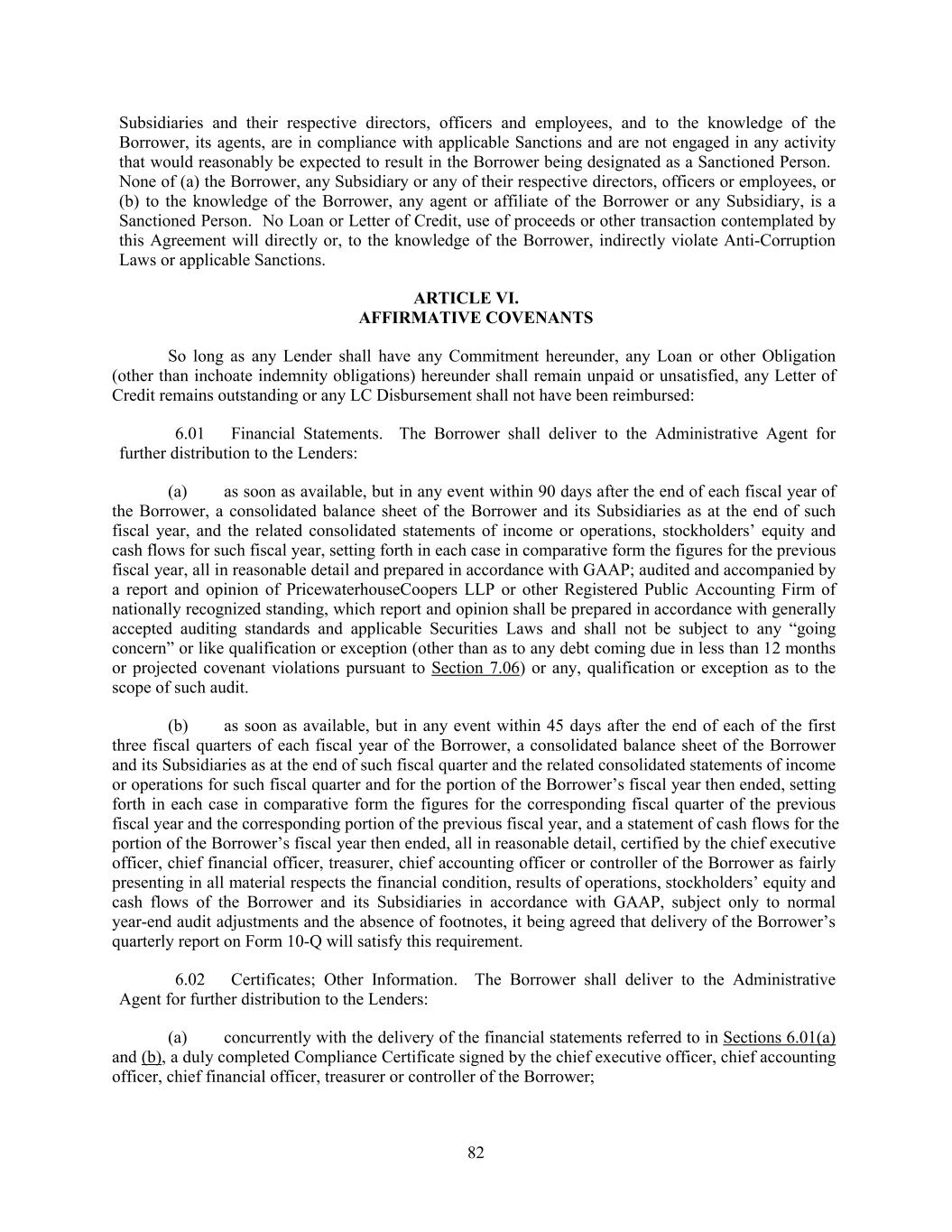 Subsidiaries and their respective directors, officers and employees, and to the knowledge of the Borrower, its agents, are in compliance with applicable Sanctions and are not engaged in any activity that would reasonably be expected to result in the Borrower being designated as a Sanctioned Person. None of (a) the Borrower, any Subsidiary or any of their respective directors, officers or employees, or (b) to the knowledge of the Borrower, any agent or affiliate of the Borrower or any Subsidiary, is a Sanctioned Person. No Loan or Letter of Credit, use of proceeds or other transaction contemplated by this Agreement will directly or, to the knowledge of the Borrower, indirectly violate Anti-Corruption Laws or applicable Sanctions. ARTICLE VI. AFFIRMATIVE COVENANTS So long as any Lender shall have any Commitment hereunder, any Loan or other Obligation (other than inchoate indemnity obligations) hereunder shall remain unpaid or unsatisfied, any Letter of Credit remains outstanding or any LC Disbursement shall not have been reimbursed: 6.01 Financial Statements. The Borrower shall deliver to the Administrative Agent for further distribution to the Lenders: (a) as soon as available, but in any event within 90 days after the end of each fiscal year of the Borrower, a consolidated balance sheet of the Borrower and its Subsidiaries as at the end of such fiscal year, and the related consolidated statements of income or operations, stockholders’ equity and cash flows for such fiscal year, setting forth in each case in comparative form the figures for the previous fiscal year, all in reasonable detail and prepared in accordance with GAAP; audited and accompanied by a report and opinion of PricewaterhouseCoopers LLP or other Registered Public Accounting Firm of nationally recognized standing, which report and opinion shall be prepared in accordance with generally accepted auditing standards and applicable Securities Laws and shall not be subject to any “going concern” or like qualification or exception (other than as to any debt coming due in less than 12 months or projected covenant violations pursuant to Section 7.06) or any, qualification or exception as to the scope of such audit. (b) as soon as available, but in any event within 45 days after the end of each of the first three fiscal quarters of each fiscal year of the Borrower, a consolidated balance sheet of the Borrower and its Subsidiaries as at the end of such fiscal quarter and the related consolidated statements of income or operations for such fiscal quarter and for the portion of the Borrower’s fiscal year then ended, setting forth in each case in comparative form the figures for the corresponding fiscal quarter of the previous fiscal year and the corresponding portion of the previous fiscal year, and a statement of cash flows for the portion of the Borrower’s fiscal year then ended, all in reasonable detail, certified by the chief executive officer, chief financial officer, treasurer, chief accounting officer or controller of the Borrower as fairly presenting in all material respects the financial condition, results of operations, stockholders’ equity and cash flows of the Borrower and its Subsidiaries in accordance with GAAP, subject only to normal year-end audit adjustments and the absence of footnotes, it being agreed that delivery of the Borrower’s quarterly report on Form 10-Q will satisfy this requirement. 6.02 Certificates; Other Information. The Borrower shall deliver to the Administrative Agent for further distribution to the Lenders: (a) concurrently with the delivery of the financial statements referred to in Sections 6.01(a) and (b), a duly completed Compliance Certificate signed by the chief executive officer, chief accounting officer, chief financial officer, treasurer or controller of the Borrower; 82