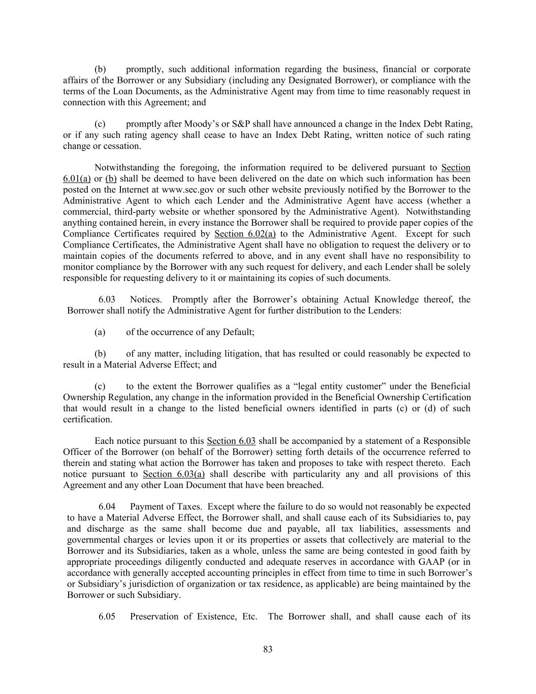 (b) promptly, such additional information regarding the business, financial or corporate affairs of the Borrower or any Subsidiary (including any Designated Borrower), or compliance with the terms of the Loan Documents, as the Administrative Agent may from time to time reasonably request in connection with this Agreement; and (c) promptly after Moody’s or S&P shall have announced a change in the Index Debt Rating, or if any such rating agency shall cease to have an Index Debt Rating, written notice of such rating change or cessation. Notwithstanding the foregoing, the information required to be delivered pursuant to Section 6.01(a) or (b) shall be deemed to have been delivered on the date on which such information has been posted on the Internet at www.sec.gov or such other website previously notified by the Borrower to the Administrative Agent to which each Lender and the Administrative Agent have access (whether a commercial, third-party website or whether sponsored by the Administrative Agent). Notwithstanding anything contained herein, in every instance the Borrower shall be required to provide paper copies of the Compliance Certificates required by Section 6.02(a) to the Administrative Agent. Except for such Compliance Certificates, the Administrative Agent shall have no obligation to request the delivery or to maintain copies of the documents referred to above, and in any event shall have no responsibility to monitor compliance by the Borrower with any such request for delivery, and each Lender shall be solely responsible for requesting delivery to it or maintaining its copies of such documents. 6.03 Notices. Promptly after the Borrower’s obtaining Actual Knowledge thereof, the Borrower shall notify the Administrative Agent for further distribution to the Lenders: (a) of the occurrence of any Default; (b) of any matter, including litigation, that has resulted or could reasonably be expected to result in a Material Adverse Effect; and (c) to the extent the Borrower qualifies as a “legal entity customer” under the Beneficial Ownership Regulation, any change in the information provided in the Beneficial Ownership Certification that would result in a change to the listed beneficial owners identified in parts (c) or (d) of such certification. Each notice pursuant to this Section 6.03 shall be accompanied by a statement of a Responsible Officer of the Borrower (on behalf of the Borrower) setting forth details of the occurrence referred to therein and stating what action the Borrower has taken and proposes to take with respect thereto. Each notice pursuant to Section 6.03(a) shall describe with particularity any and all provisions of this Agreement and any other Loan Document that have been breached. 6.04 Payment of Taxes. Except where the failure to do so would not reasonably be expected to have a Material Adverse Effect, the Borrower shall, and shall cause each of its Subsidiaries to, pay and discharge as the same shall become due and payable, all tax liabilities, assessments and governmental charges or levies upon it or its properties or assets that collectively are material to the Borrower and its Subsidiaries, taken as a whole, unless the same are being contested in good faith by appropriate proceedings diligently conducted and adequate reserves in accordance with GAAP (or in accordance with generally accepted accounting principles in effect from time to time in such Borrower’s or Subsidiary’s jurisdiction of organization or tax residence, as applicable) are being maintained by the Borrower or such Subsidiary. 6.05 Preservation of Existence, Etc. The Borrower shall, and shall cause each of its 83