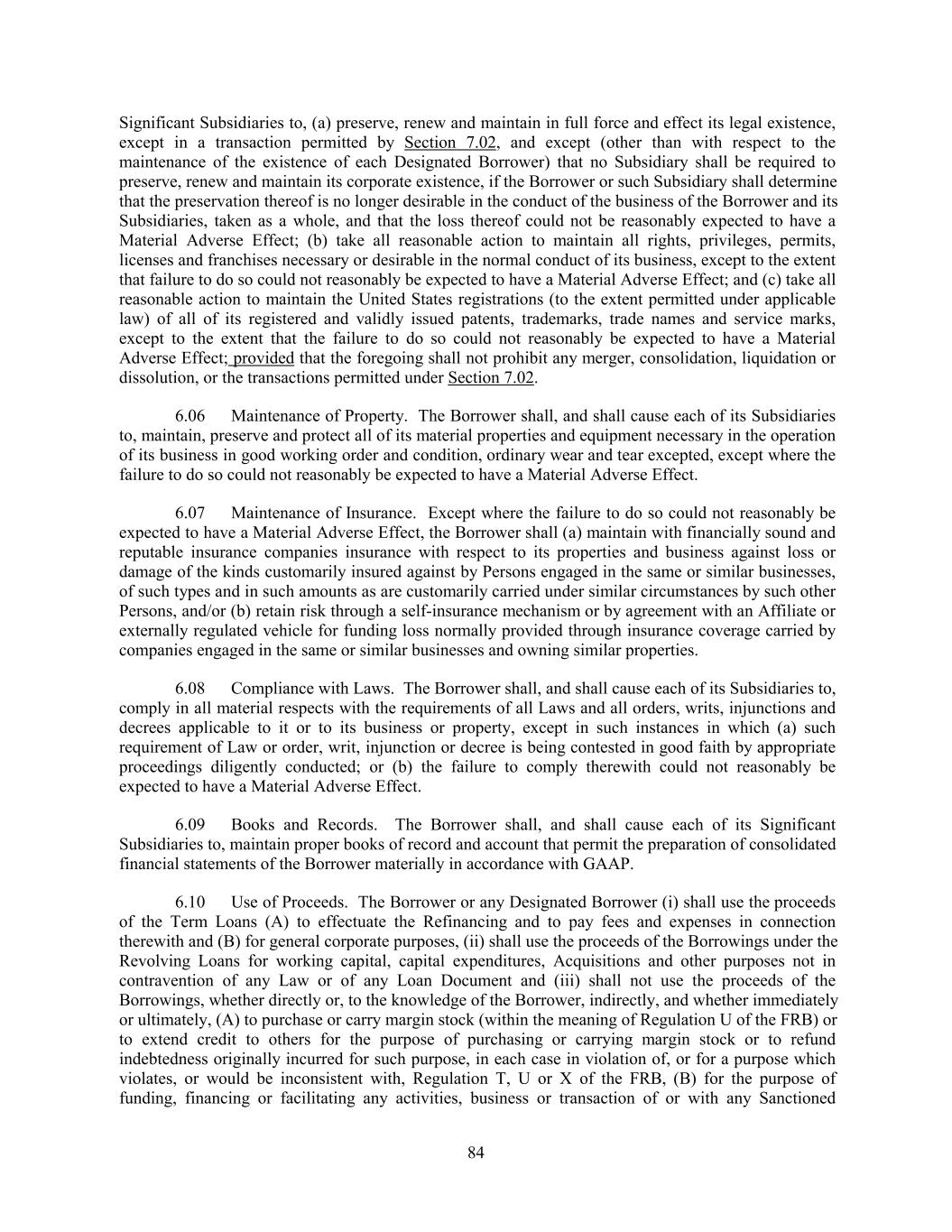 Significant Subsidiaries to, (a) preserve, renew and maintain in full force and effect its legal existence, except in a transaction permitted by Section 7.02, and except (other than with respect to the maintenance of the existence of each Designated Borrower) that no Subsidiary shall be required to preserve, renew and maintain its corporate existence, if the Borrower or such Subsidiary shall determine that the preservation thereof is no longer desirable in the conduct of the business of the Borrower and its Subsidiaries, taken as a whole, and that the loss thereof could not be reasonably expected to have a Material Adverse Effect; (b) take all reasonable action to maintain all rights, privileges, permits, licenses and franchises necessary or desirable in the normal conduct of its business, except to the extent that failure to do so could not reasonably be expected to have a Material Adverse Effect; and (c) take all reasonable action to maintain the United States registrations (to the extent permitted under applicable law) of all of its registered and validly issued patents, trademarks, trade names and service marks, except to the extent that the failure to do so could not reasonably be expected to have a Material Adverse Effect; provided that the foregoing shall not prohibit any merger, consolidation, liquidation or dissolution, or the transactions permitted under Section 7.02. 6.06 Maintenance of Property. The Borrower shall, and shall cause each of its Subsidiaries to, maintain, preserve and protect all of its material properties and equipment necessary in the operation of its business in good working order and condition, ordinary wear and tear excepted, except where the failure to do so could not reasonably be expected to have a Material Adverse Effect. 6.07 Maintenance of Insurance. Except where the failure to do so could not reasonably be expected to have a Material Adverse Effect, the Borrower shall (a) maintain with financially sound and reputable insurance companies insurance with respect to its properties and business against loss or damage of the kinds customarily insured against by Persons engaged in the same or similar businesses, of such types and in such amounts as are customarily carried under similar circumstances by such other Persons, and/or (b) retain risk through a self-insurance mechanism or by agreement with an Affiliate or externally regulated vehicle for funding loss normally provided through insurance coverage carried by companies engaged in the same or similar businesses and owning similar properties. 6.08 Compliance with Laws. The Borrower shall, and shall cause each of its Subsidiaries to, comply in all material respects with the requirements of all Laws and all orders, writs, injunctions and decrees applicable to it or to its business or property, except in such instances in which (a) such requirement of Law or order, writ, injunction or decree is being contested in good faith by appropriate proceedings diligently conducted; or (b) the failure to comply therewith could not reasonably be expected to have a Material Adverse Effect. 6.09 Books and Records. The Borrower shall, and shall cause each of its Significant Subsidiaries to, maintain proper books of record and account that permit the preparation of consolidated financial statements of the Borrower materially in accordance with GAAP. 6.10 Use of Proceeds. The Borrower or any Designated Borrower (i) shall use the proceeds of the Term Loans (A) to effectuate the Refinancing and to pay fees and expenses in connection therewith and (B) for general corporate purposes, (ii) shall use the proceeds of the Borrowings under the Revolving Loans for working capital, capital expenditures, Acquisitions and other purposes not in contravention of any Law or of any Loan Document and (iii) shall not use the proceeds of the Borrowings, whether directly or, to the knowledge of the Borrower, indirectly, and whether immediately or ultimately, (A) to purchase or carry margin stock (within the meaning of Regulation U of the FRB) or to extend credit to others for the purpose of purchasing or carrying margin stock or to refund indebtedness originally incurred for such purpose, in each case in violation of, or for a purpose which violates, or would be inconsistent with, Regulation T, U or X of the FRB, (B) for the purpose of funding, financing or facilitating any activities, business or transaction of or with any Sanctioned 84