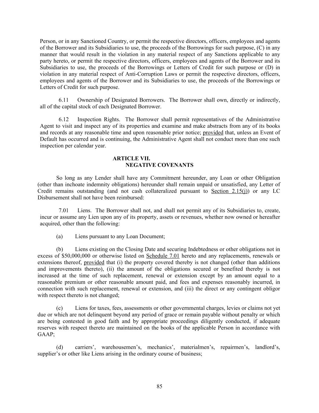 Person, or in any Sanctioned Country, or permit the respective directors, officers, employees and agents of the Borrower and its Subsidiaries to use, the proceeds of the Borrowings for such purpose, (C) in any manner that would result in the violation in any material respect of any Sanctions applicable to any party hereto, or permit the respective directors, officers, employees and agents of the Borrower and its Subsidiaries to use, the proceeds of the Borrowings or Letters of Credit for such purpose or (D) in violation in any material respect of Anti-Corruption Laws or permit the respective directors, officers, employees and agents of the Borrower and its Subsidiaries to use, the proceeds of the Borrowings or Letters of Credit for such purpose. 6.11 Ownership of Designated Borrowers. The Borrower shall own, directly or indirectly, all of the capital stock of each Designated Borrower. 6.12 Inspection Rights. The Borrower shall permit representatives of the Administrative Agent to visit and inspect any of its properties and examine and make abstracts from any of its books and records at any reasonable time and upon reasonable prior notice; provided that, unless an Event of Default has occurred and is continuing, the Administrative Agent shall not conduct more than one such inspection per calendar year. ARTICLE VII. NEGATIVE COVENANTS So long as any Lender shall have any Commitment hereunder, any Loan or other Obligation (other than inchoate indemnity obligations) hereunder shall remain unpaid or unsatisfied, any Letter of Credit remains outstanding (and not cash collateralized pursuant to Section 2.15(j)) or any LC Disbursement shall not have been reimbursed: 7.01 Liens. The Borrower shall not, and shall not permit any of its Subsidiaries to, create, incur or assume any Lien upon any of its property, assets or revenues, whether now owned or hereafter acquired, other than the following: (a) Liens pursuant to any Loan Document; (b) Liens existing on the Closing Date and securing Indebtedness or other obligations not in excess of $50,000,000 or otherwise listed on Schedule 7.01 hereto and any replacements, renewals or extensions thereof, provided that (i) the property covered thereby is not changed (other than additions and improvements thereto), (ii) the amount of the obligations secured or benefited thereby is not increased at the time of such replacement, renewal or extension except by an amount equal to a reasonable premium or other reasonable amount paid, and fees and expenses reasonably incurred, in connection with such replacement, renewal or extension, and (iii) the direct or any contingent obligor with respect thereto is not changed; (c) Liens for taxes, fees, assessments or other governmental charges, levies or claims not yet due or which are not delinquent beyond any period of grace or remain payable without penalty or which are being contested in good faith and by appropriate proceedings diligently conducted, if adequate reserves with respect thereto are maintained on the books of the applicable Person in accordance with GAAP; (d) carriers’, warehousemen’s, mechanics’, materialmen’s, repairmen’s, landlord’s, supplier’s or other like Liens arising in the ordinary course of business; 85