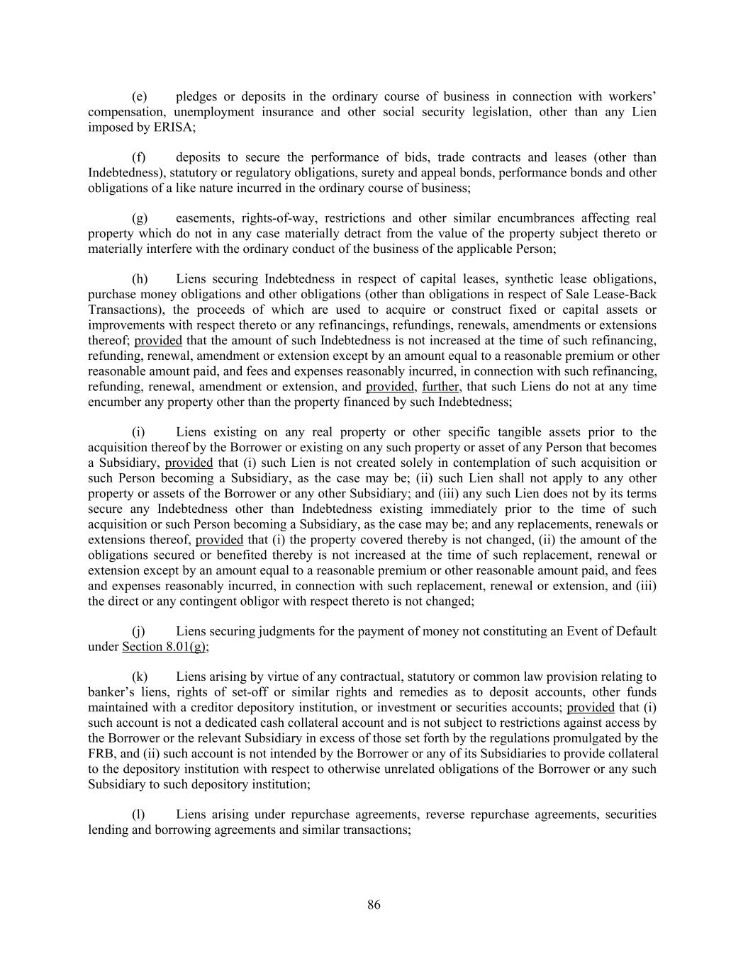(e) pledges or deposits in the ordinary course of business in connection with workers’ compensation, unemployment insurance and other social security legislation, other than any Lien imposed by ERISA; (f) deposits to secure the performance of bids, trade contracts and leases (other than Indebtedness), statutory or regulatory obligations, surety and appeal bonds, performance bonds and other obligations of a like nature incurred in the ordinary course of business; (g) easements, rights-of-way, restrictions and other similar encumbrances affecting real property which do not in any case materially detract from the value of the property subject thereto or materially interfere with the ordinary conduct of the business of the applicable Person; (h) Liens securing Indebtedness in respect of capital leases, synthetic lease obligations, purchase money obligations and other obligations (other than obligations in respect of Sale Lease-Back Transactions), the proceeds of which are used to acquire or construct fixed or capital assets or improvements with respect thereto or any refinancings, refundings, renewals, amendments or extensions thereof; provided that the amount of such Indebtedness is not increased at the time of such refinancing, refunding, renewal, amendment or extension except by an amount equal to a reasonable premium or other reasonable amount paid, and fees and expenses reasonably incurred, in connection with such refinancing, refunding, renewal, amendment or extension, and provided, further, that such Liens do not at any time encumber any property other than the property financed by such Indebtedness; (i) Liens existing on any real property or other specific tangible assets prior to the acquisition thereof by the Borrower or existing on any such property or asset of any Person that becomes a Subsidiary, provided that (i) such Lien is not created solely in contemplation of such acquisition or such Person becoming a Subsidiary, as the case may be; (ii) such Lien shall not apply to any other property or assets of the Borrower or any other Subsidiary; and (iii) any such Lien does not by its terms secure any Indebtedness other than Indebtedness existing immediately prior to the time of such acquisition or such Person becoming a Subsidiary, as the case may be; and any replacements, renewals or extensions thereof, provided that (i) the property covered thereby is not changed, (ii) the amount of the obligations secured or benefited thereby is not increased at the time of such replacement, renewal or extension except by an amount equal to a reasonable premium or other reasonable amount paid, and fees and expenses reasonably incurred, in connection with such replacement, renewal or extension, and (iii) the direct or any contingent obligor with respect thereto is not changed; (j) Liens securing judgments for the payment of money not constituting an Event of Default under Section 8.01(g); (k) Liens arising by virtue of any contractual, statutory or common law provision relating to banker’s liens, rights of set-off or similar rights and remedies as to deposit accounts, other funds maintained with a creditor depository institution, or investment or securities accounts; provided that (i) such account is not a dedicated cash collateral account and is not subject to restrictions against access by the Borrower or the relevant Subsidiary in excess of those set forth by the regulations promulgated by the FRB, and (ii) such account is not intended by the Borrower or any of its Subsidiaries to provide collateral to the depository institution with respect to otherwise unrelated obligations of the Borrower or any such Subsidiary to such depository institution; (l) Liens arising under repurchase agreements, reverse repurchase agreements, securities lending and borrowing agreements and similar transactions; 86