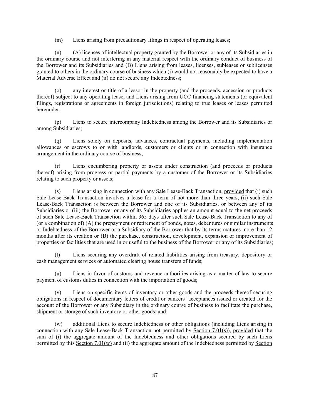 (m) Liens arising from precautionary filings in respect of operating leases; (n) (A) licenses of intellectual property granted by the Borrower or any of its Subsidiaries in the ordinary course and not interfering in any material respect with the ordinary conduct of business of the Borrower and its Subsidiaries and (B) Liens arising from leases, licenses, subleases or sublicenses granted to others in the ordinary course of business which (i) would not reasonably be expected to have a Material Adverse Effect and (ii) do not secure any Indebtedness; (o) any interest or title of a lessor in the property (and the proceeds, accession or products thereof) subject to any operating lease, and Liens arising from UCC financing statements (or equivalent filings, registrations or agreements in foreign jurisdictions) relating to true leases or leases permitted hereunder; (p) Liens to secure intercompany Indebtedness among the Borrower and its Subsidiaries or among Subsidiaries; (q) Liens solely on deposits, advances, contractual payments, including implementation allowances or escrows to or with landlords, customers or clients or in connection with insurance arrangement in the ordinary course of business; (r) Liens encumbering property or assets under construction (and proceeds or products thereof) arising from progress or partial payments by a customer of the Borrower or its Subsidiaries relating to such property or assets; (s) Liens arising in connection with any Sale Lease-Back Transaction, provided that (i) such Sale Lease-Back Transaction involves a lease for a term of not more than three years, (ii) such Sale Lease-Back Transaction is between the Borrower and one of its Subsidiaries, or between any of its Subsidiaries or (iii) the Borrower or any of its Subsidiaries applies an amount equal to the net proceeds of such Sale Lease-Back Transaction within 365 days after such Sale Lease-Back Transaction to any of (or a combination of) (A) the prepayment or retirement of bonds, notes, debentures or similar instruments or Indebtedness of the Borrower or a Subsidiary of the Borrower that by its terms matures more than 12 months after its creation or (B) the purchase, construction, development, expansion or improvement of properties or facilities that are used in or useful to the business of the Borrower or any of its Subsidiaries; (t) Liens securing any overdraft of related liabilities arising from treasury, depository or cash management services or automated clearing house transfers of funds; (u) Liens in favor of customs and revenue authorities arising as a matter of law to secure payment of customs duties in connection with the importation of goods; (v) Liens on specific items of inventory or other goods and the proceeds thereof securing obligations in respect of documentary letters of credit or bankers’ acceptances issued or created for the account of the Borrower or any Subsidiary in the ordinary course of business to facilitate the purchase, shipment or storage of such inventory or other goods; and (w) additional Liens to secure Indebtedness or other obligations (including Liens arising in connection with any Sale Lease-Back Transaction not permitted by Section 7.01(s)), provided that the sum of (i) the aggregate amount of the Indebtedness and other obligations secured by such Liens permitted by this Section 7.01(w) and (ii) the aggregate amount of the Indebtedness permitted by Section 87