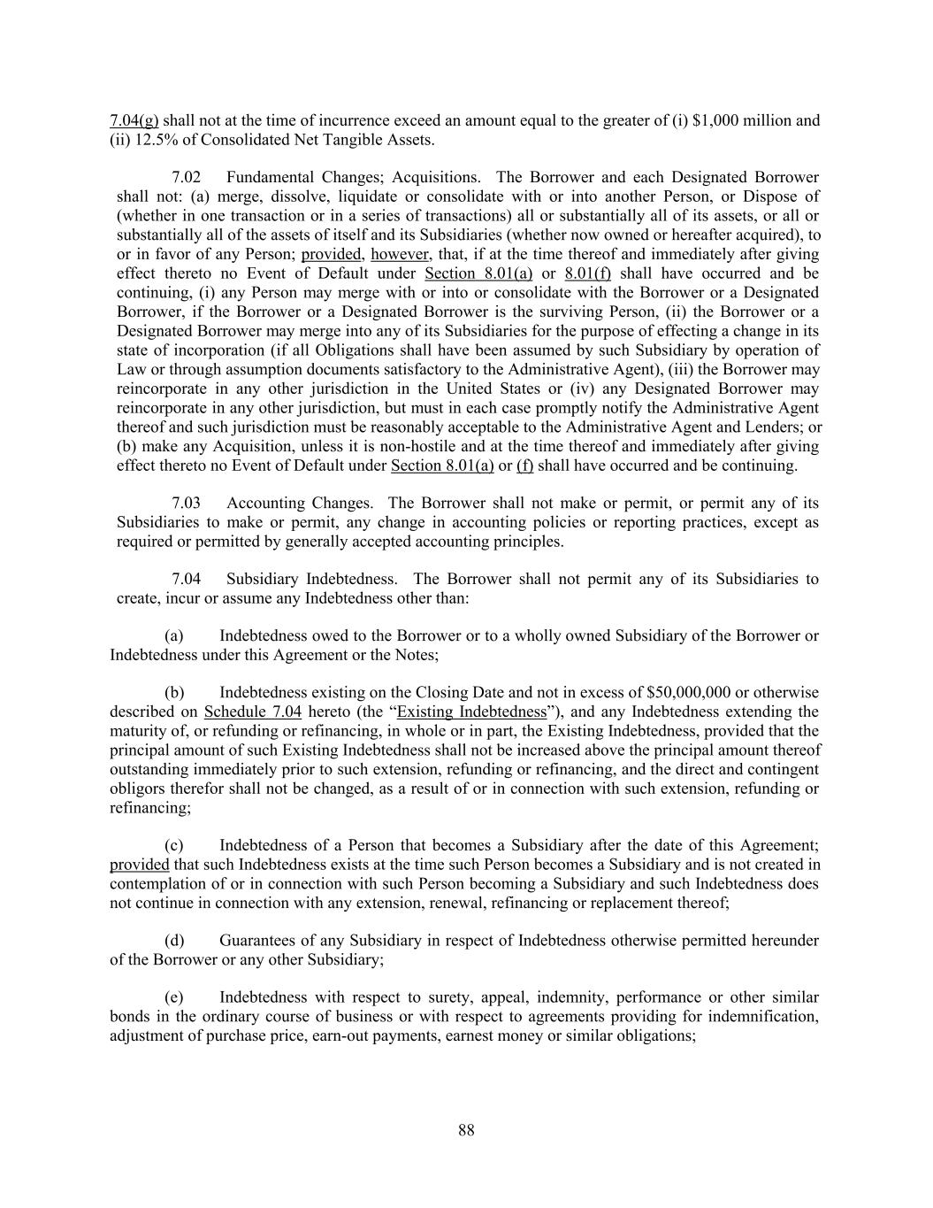 7.04(g) shall not at the time of incurrence exceed an amount equal to the greater of (i) $1,000 million and (ii) 12.5% of Consolidated Net Tangible Assets. 7.02 Fundamental Changes; Acquisitions. The Borrower and each Designated Borrower shall not: (a) merge, dissolve, liquidate or consolidate with or into another Person, or Dispose of (whether in one transaction or in a series of transactions) all or substantially all of its assets, or all or substantially all of the assets of itself and its Subsidiaries (whether now owned or hereafter acquired), to or in favor of any Person; provided, however, that, if at the time thereof and immediately after giving effect thereto no Event of Default under Section 8.01(a) or 8.01(f) shall have occurred and be continuing, (i) any Person may merge with or into or consolidate with the Borrower or a Designated Borrower, if the Borrower or a Designated Borrower is the surviving Person, (ii) the Borrower or a Designated Borrower may merge into any of its Subsidiaries for the purpose of effecting a change in its state of incorporation (if all Obligations shall have been assumed by such Subsidiary by operation of Law or through assumption documents satisfactory to the Administrative Agent), (iii) the Borrower may reincorporate in any other jurisdiction in the United States or (iv) any Designated Borrower may reincorporate in any other jurisdiction, but must in each case promptly notify the Administrative Agent thereof and such jurisdiction must be reasonably acceptable to the Administrative Agent and Lenders; or (b) make any Acquisition, unless it is non-hostile and at the time thereof and immediately after giving effect thereto no Event of Default under Section 8.01(a) or (f) shall have occurred and be continuing. 7.03 Accounting Changes. The Borrower shall not make or permit, or permit any of its Subsidiaries to make or permit, any change in accounting policies or reporting practices, except as required or permitted by generally accepted accounting principles. 7.04 Subsidiary Indebtedness. The Borrower shall not permit any of its Subsidiaries to create, incur or assume any Indebtedness other than: (a) Indebtedness owed to the Borrower or to a wholly owned Subsidiary of the Borrower or Indebtedness under this Agreement or the Notes; (b) Indebtedness existing on the Closing Date and not in excess of $50,000,000 or otherwise described on Schedule 7.04 hereto (the “Existing Indebtedness”), and any Indebtedness extending the maturity of, or refunding or refinancing, in whole or in part, the Existing Indebtedness, provided that the principal amount of such Existing Indebtedness shall not be increased above the principal amount thereof outstanding immediately prior to such extension, refunding or refinancing, and the direct and contingent obligors therefor shall not be changed, as a result of or in connection with such extension, refunding or refinancing; (c) Indebtedness of a Person that becomes a Subsidiary after the date of this Agreement; provided that such Indebtedness exists at the time such Person becomes a Subsidiary and is not created in contemplation of or in connection with such Person becoming a Subsidiary and such Indebtedness does not continue in connection with any extension, renewal, refinancing or replacement thereof; (d) Guarantees of any Subsidiary in respect of Indebtedness otherwise permitted hereunder of the Borrower or any other Subsidiary; (e) Indebtedness with respect to surety, appeal, indemnity, performance or other similar bonds in the ordinary course of business or with respect to agreements providing for indemnification, adjustment of purchase price, earn-out payments, earnest money or similar obligations; 88